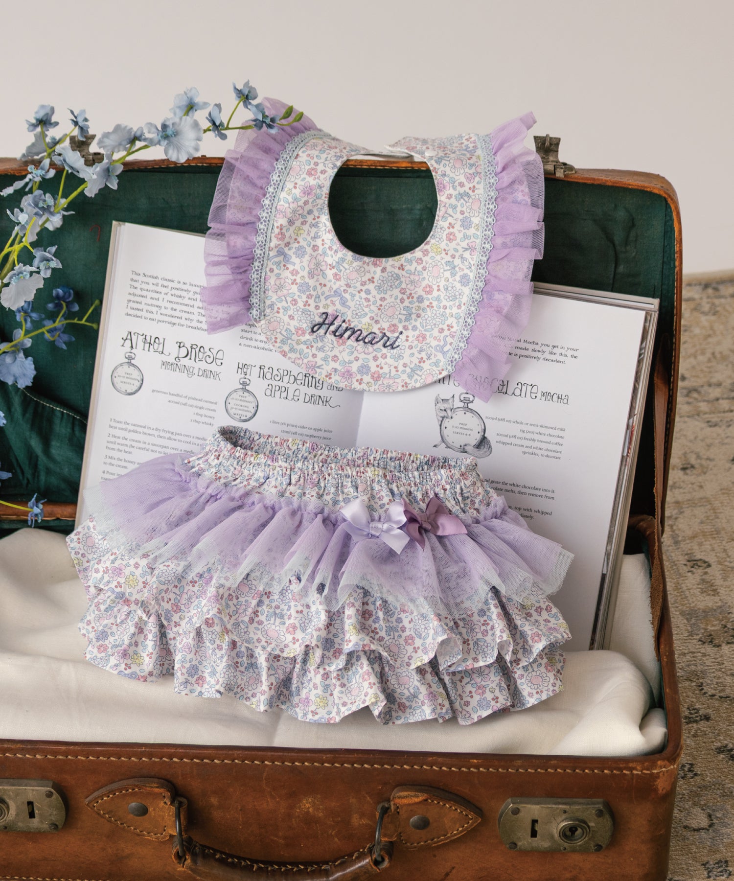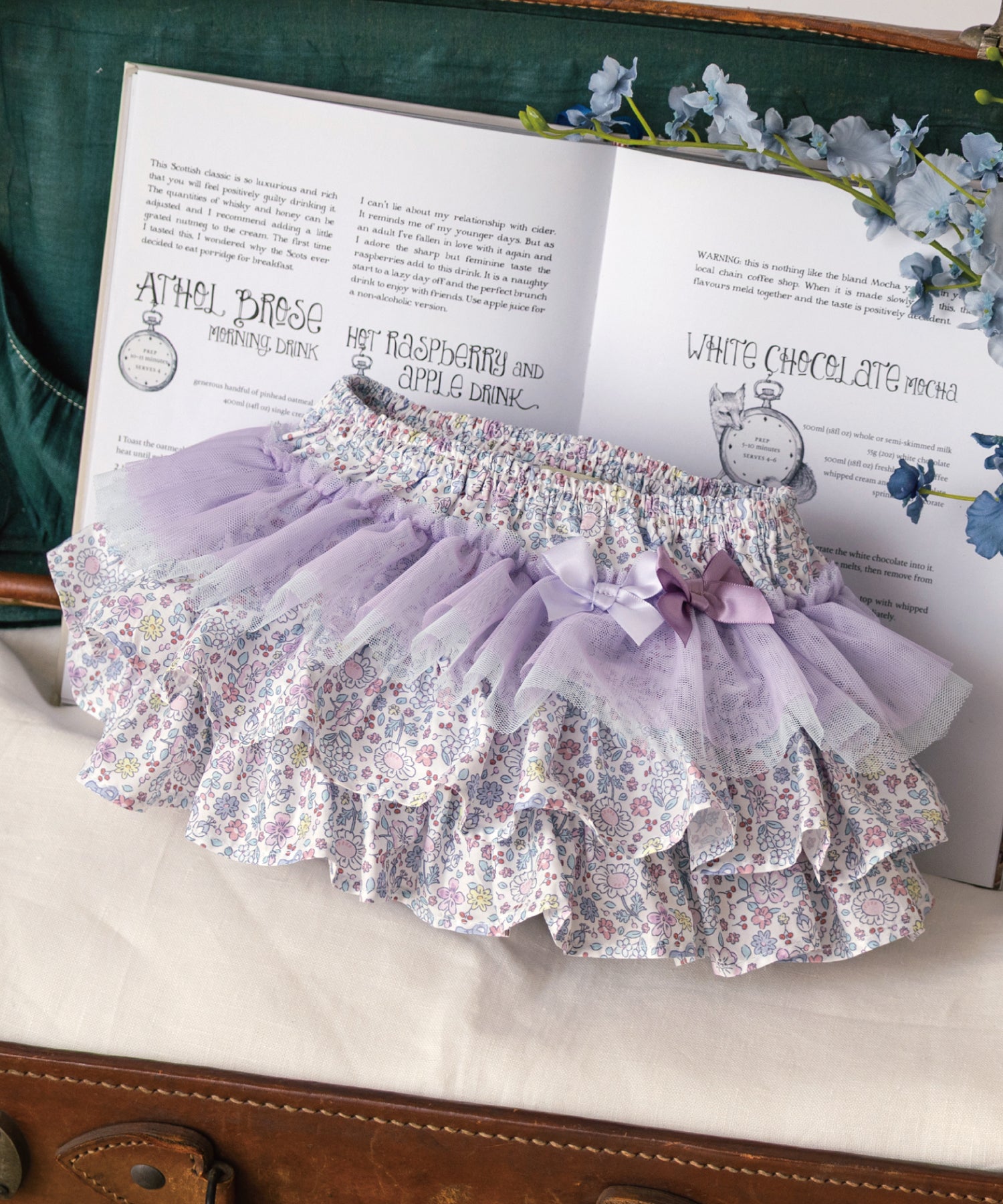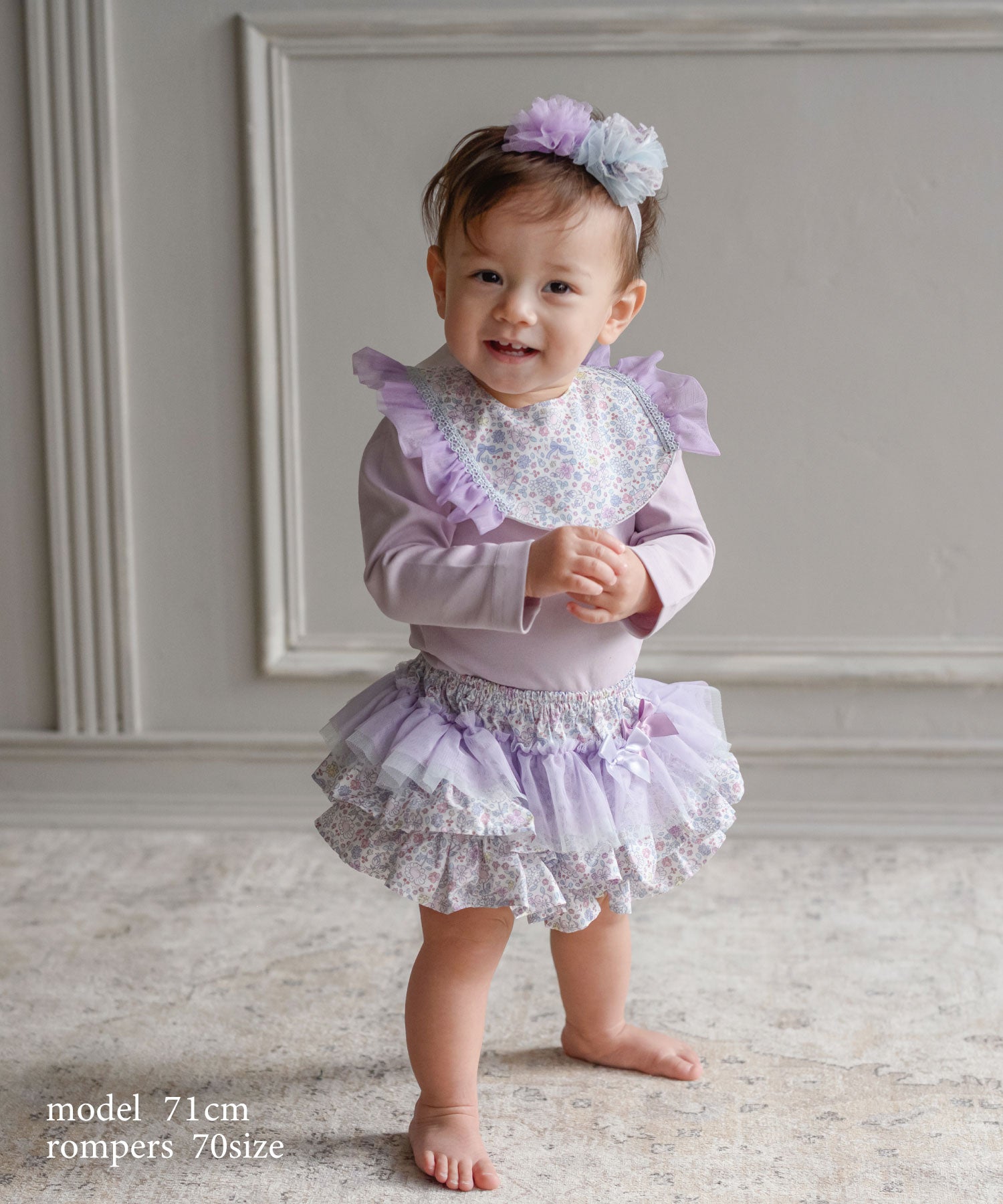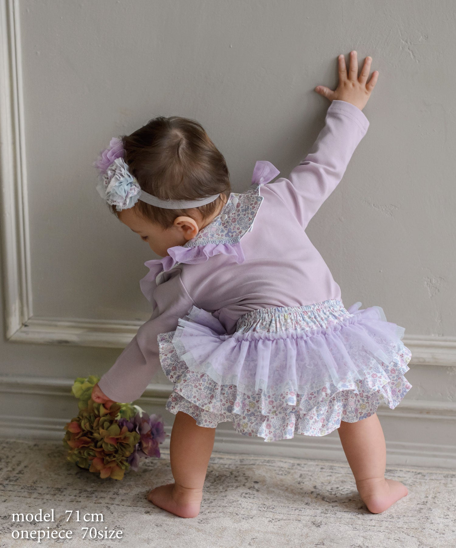 優しいライラック&ブルーのプティフルール柄がスウィートなフリフリボトム(ベビーブルマ)。