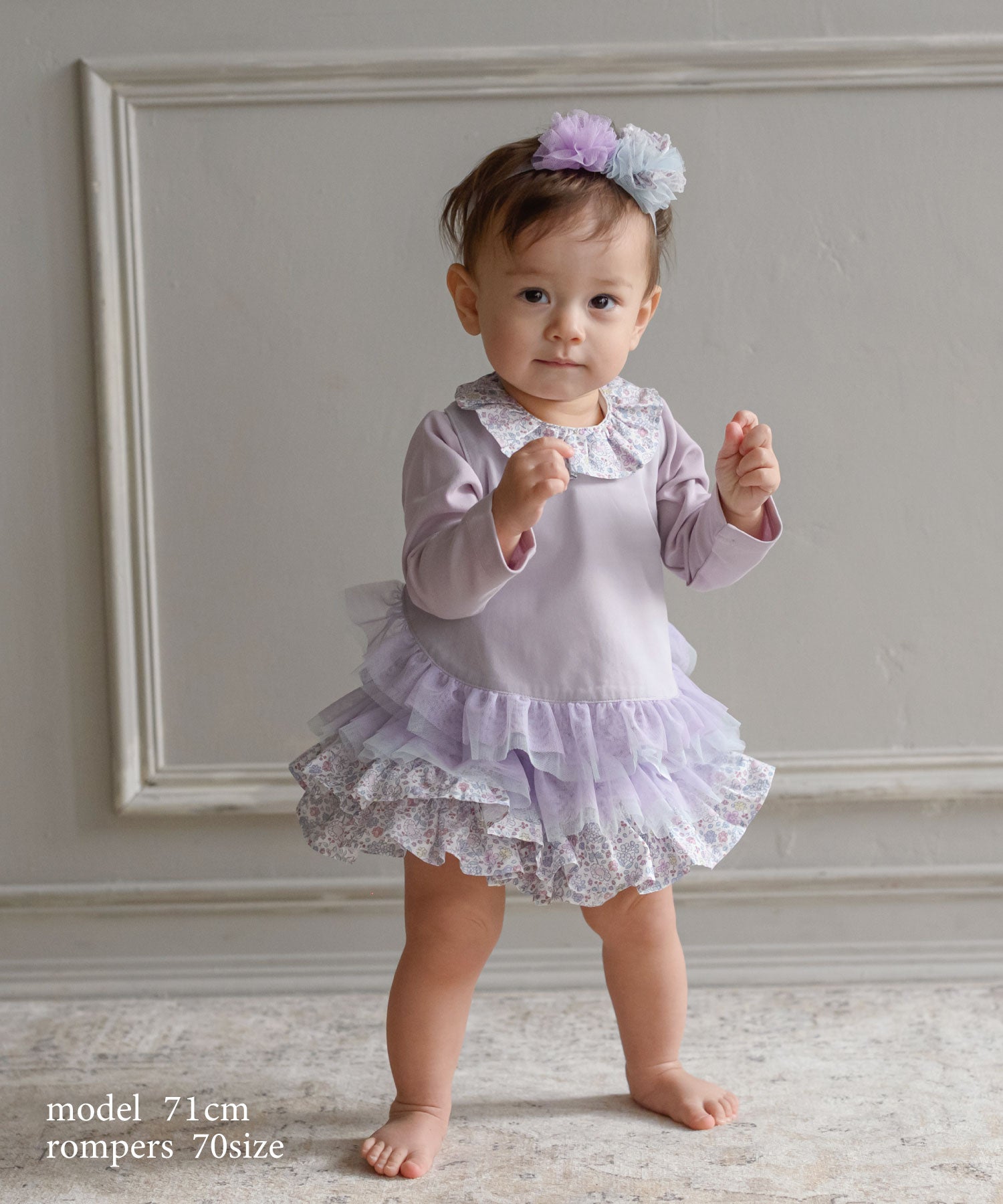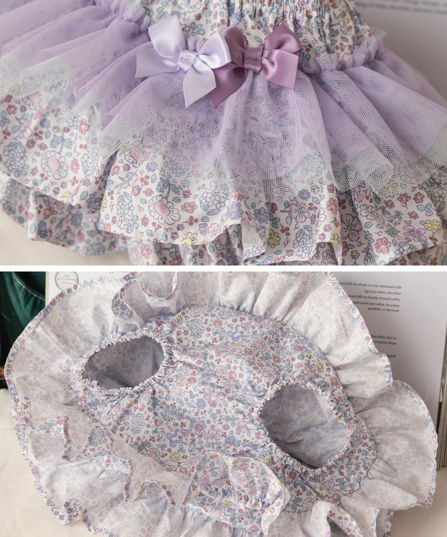 チュールとコットンの3段フリルは、ティアードスカートのようなもの。 1段目のフリルは2枚重ねのグラデーションチュール。 ふんわりボリュームあるチュールの透け感がエアリーな印象。 チュールフリルには高級感ある2色のリボンをトッピング。