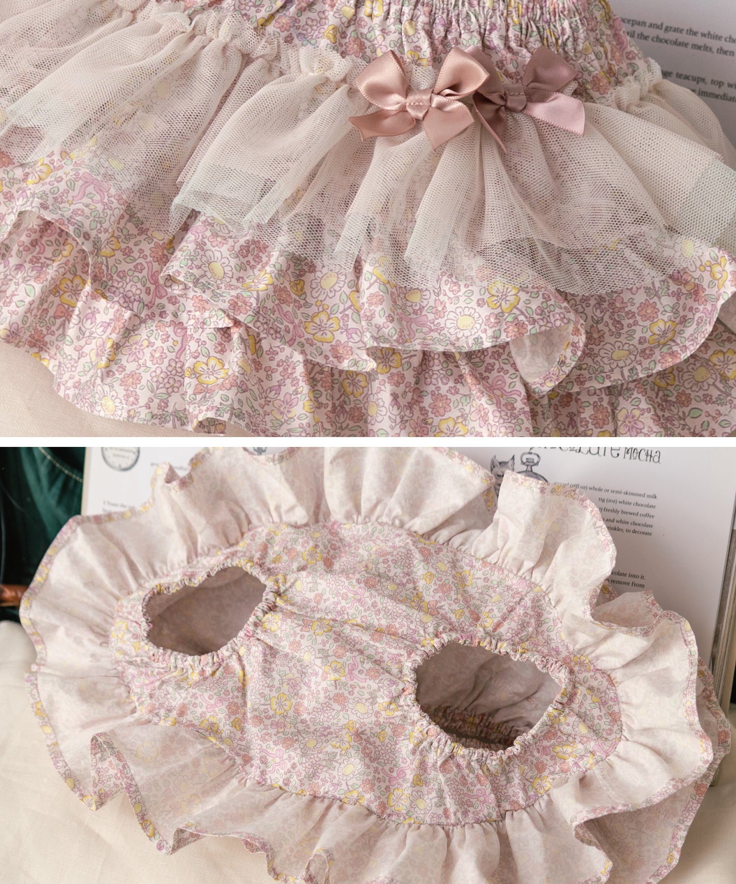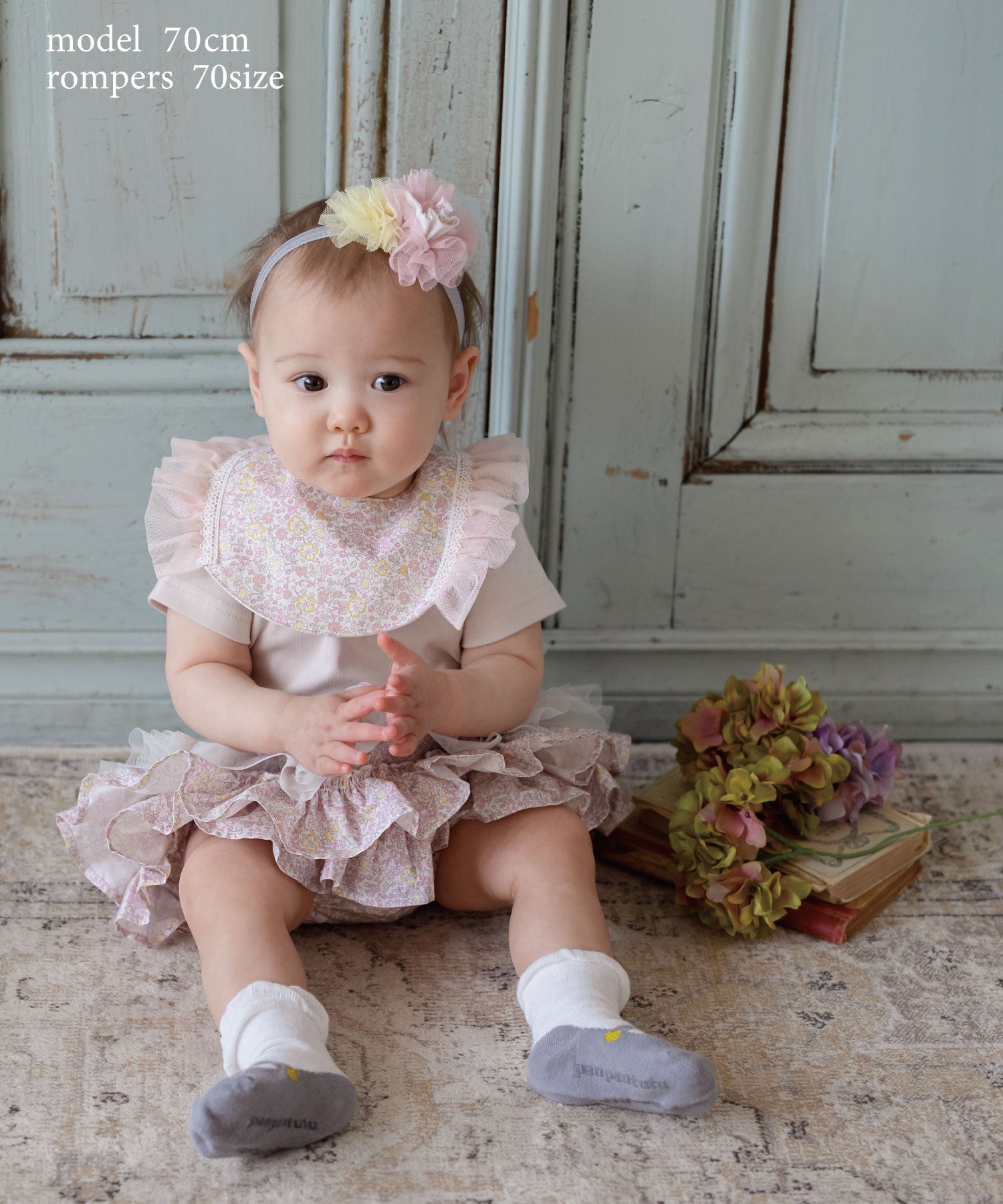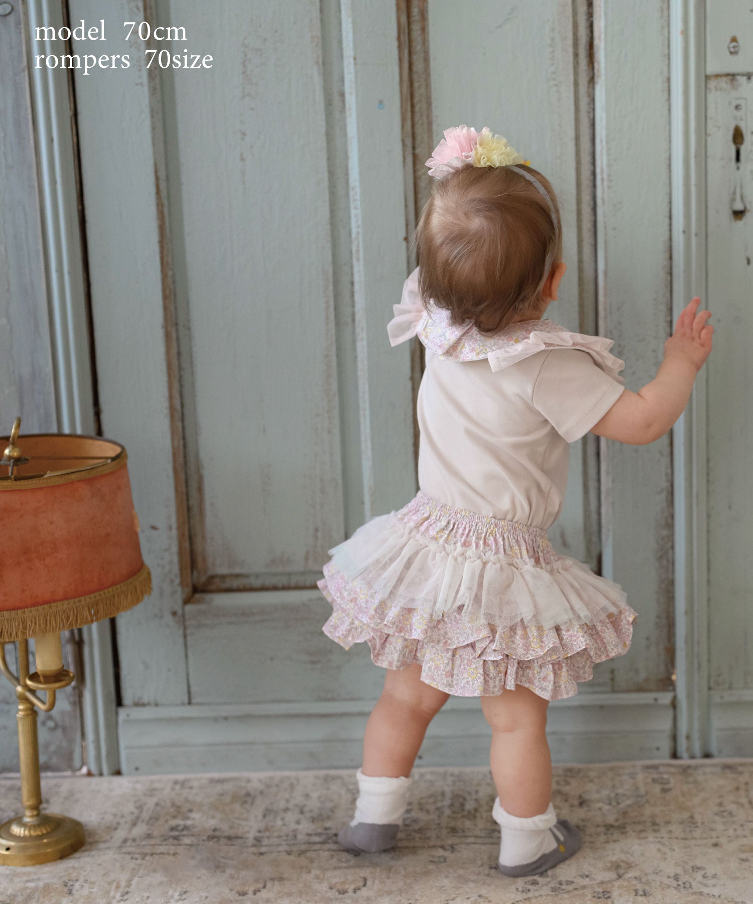 優しいピンク&イエローのプティフルール柄がスウィートなフリフリボトム(ベビーブルマ)。