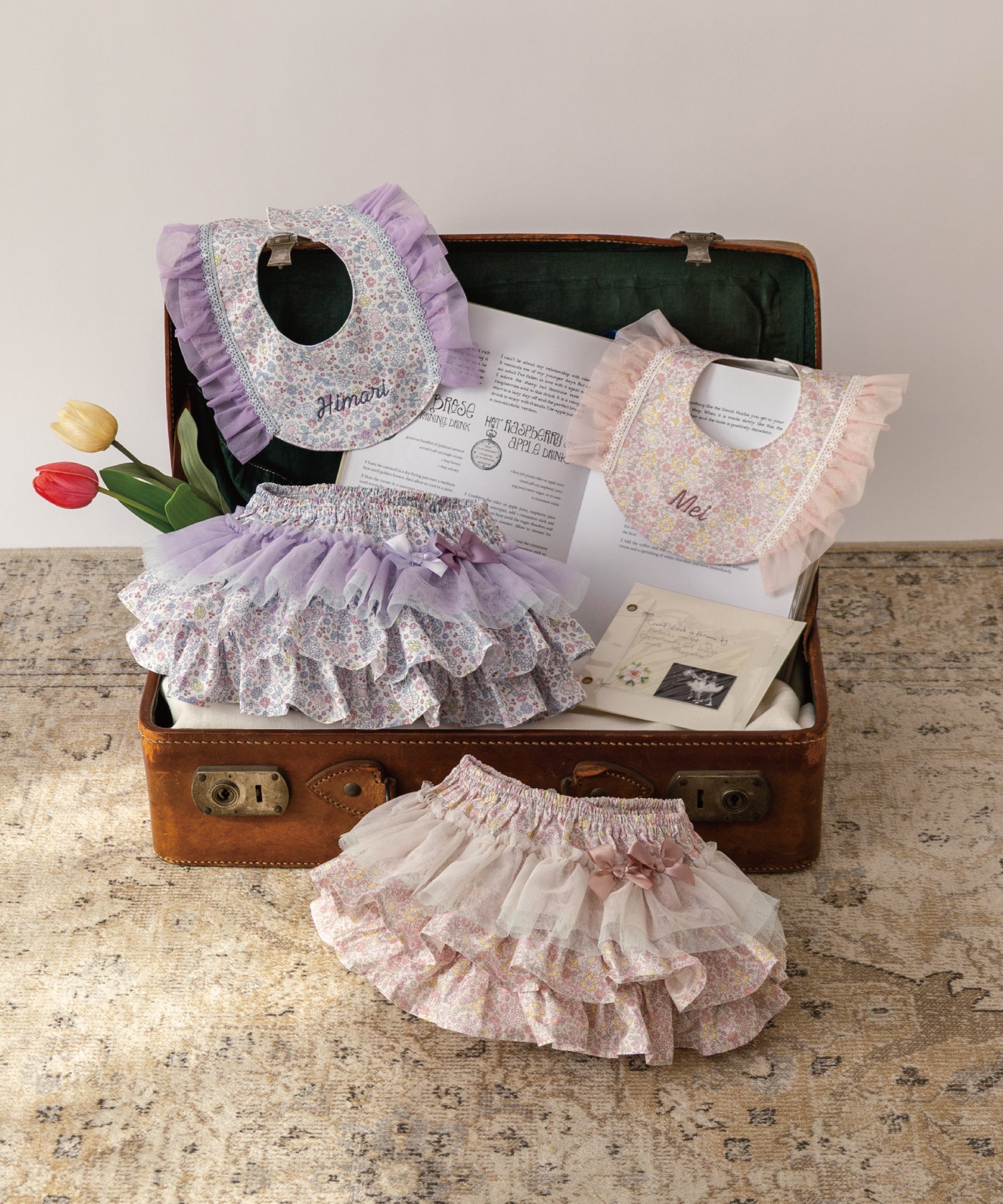 チュールとコットンの3段フリルは、ティアードスカートのよう。1段目のフリルは2枚重ねのグラデーションチュール。ふんわりボリュームあるチュールの透け感がエアリーな印象。チュールフリルには高級感ある2色のリボンをトッピング。