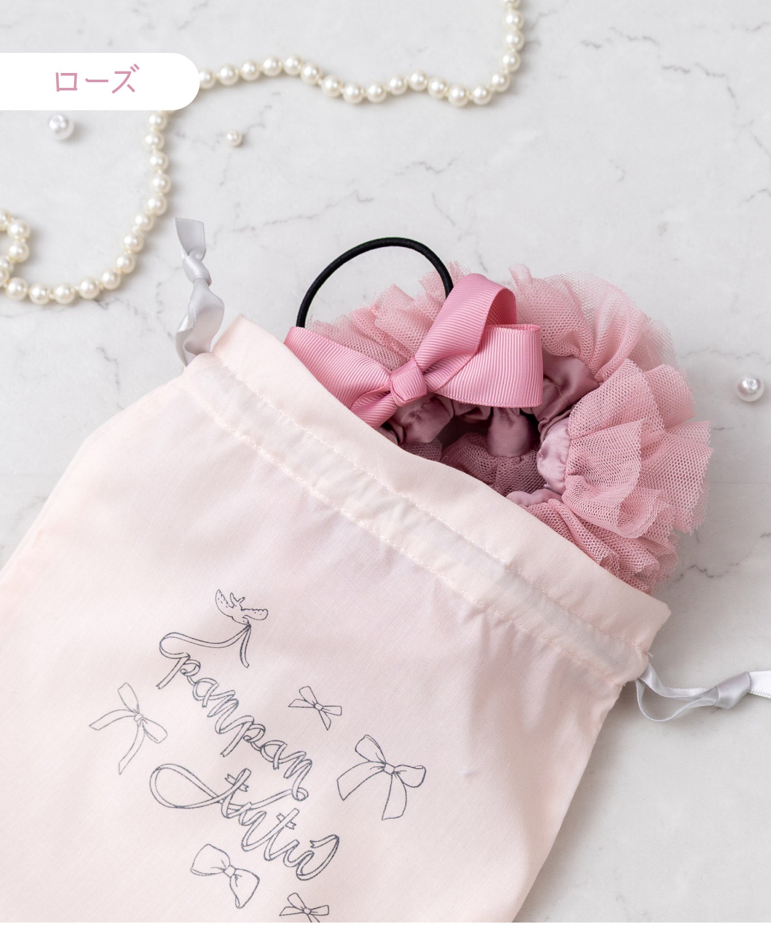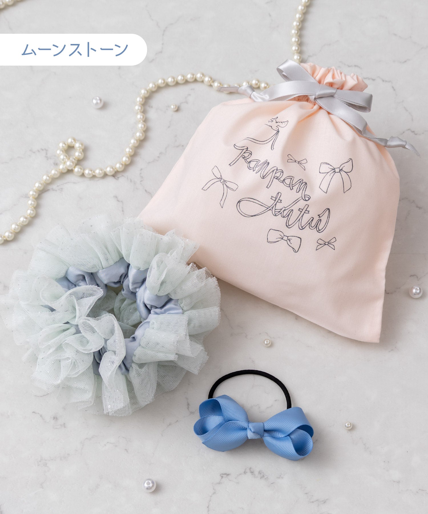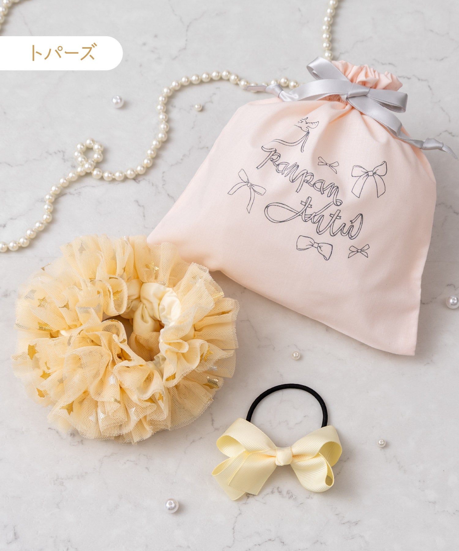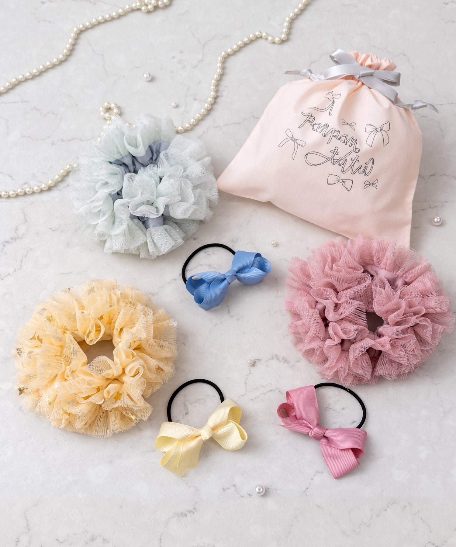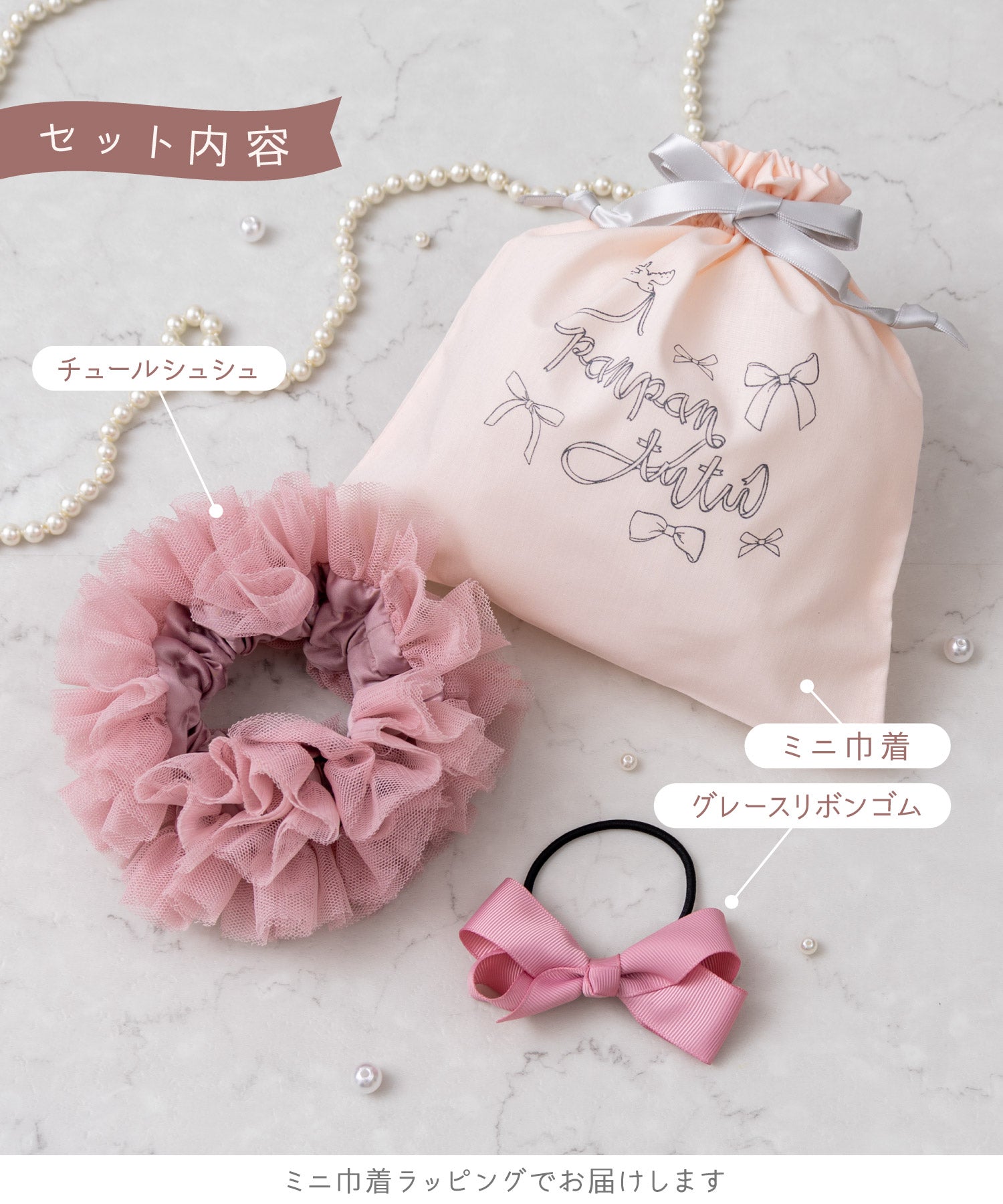 まるでお菓子みたいに甘いシュシュとリボンを、きゅっとミニ巾着に詰め合わせました。