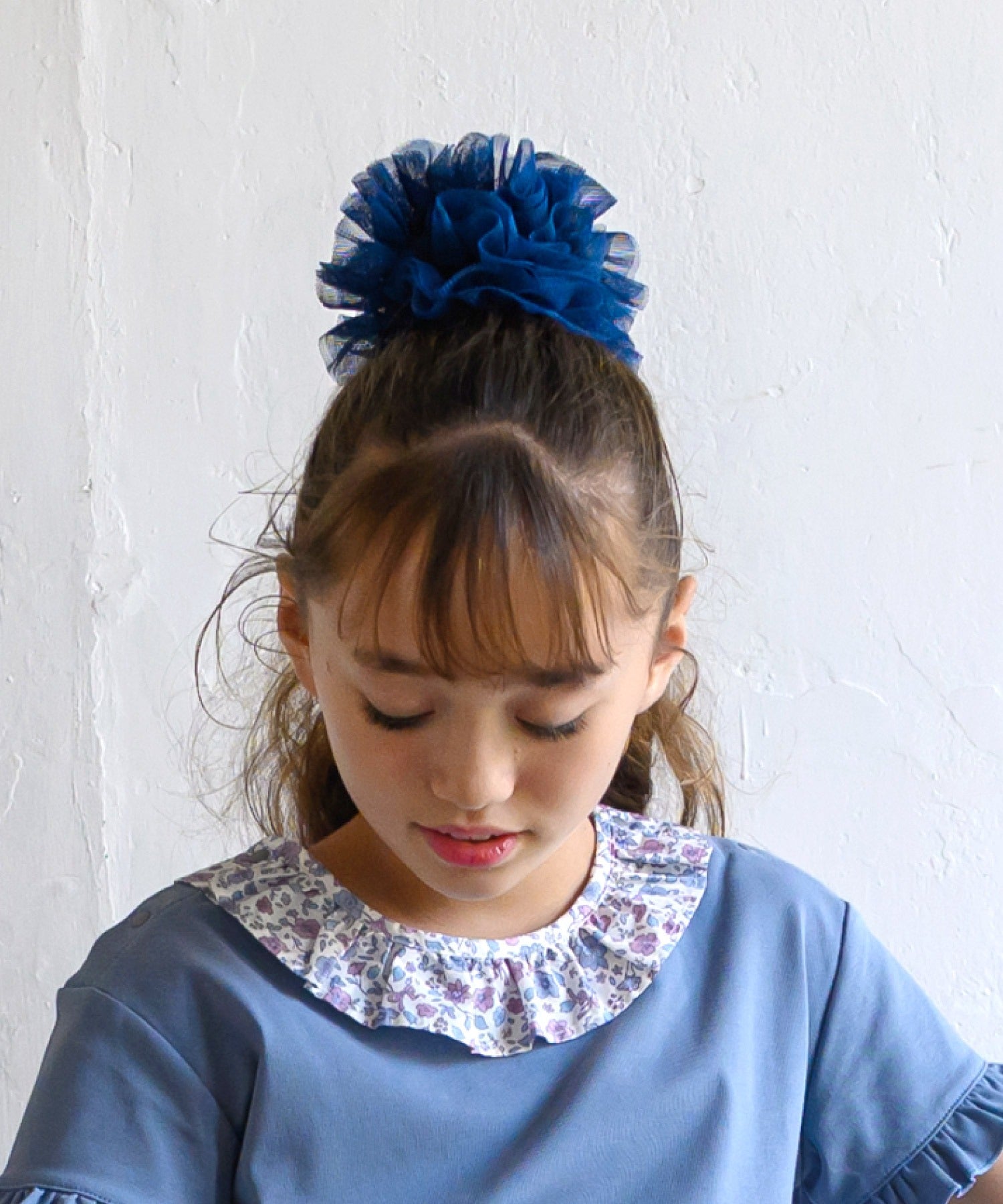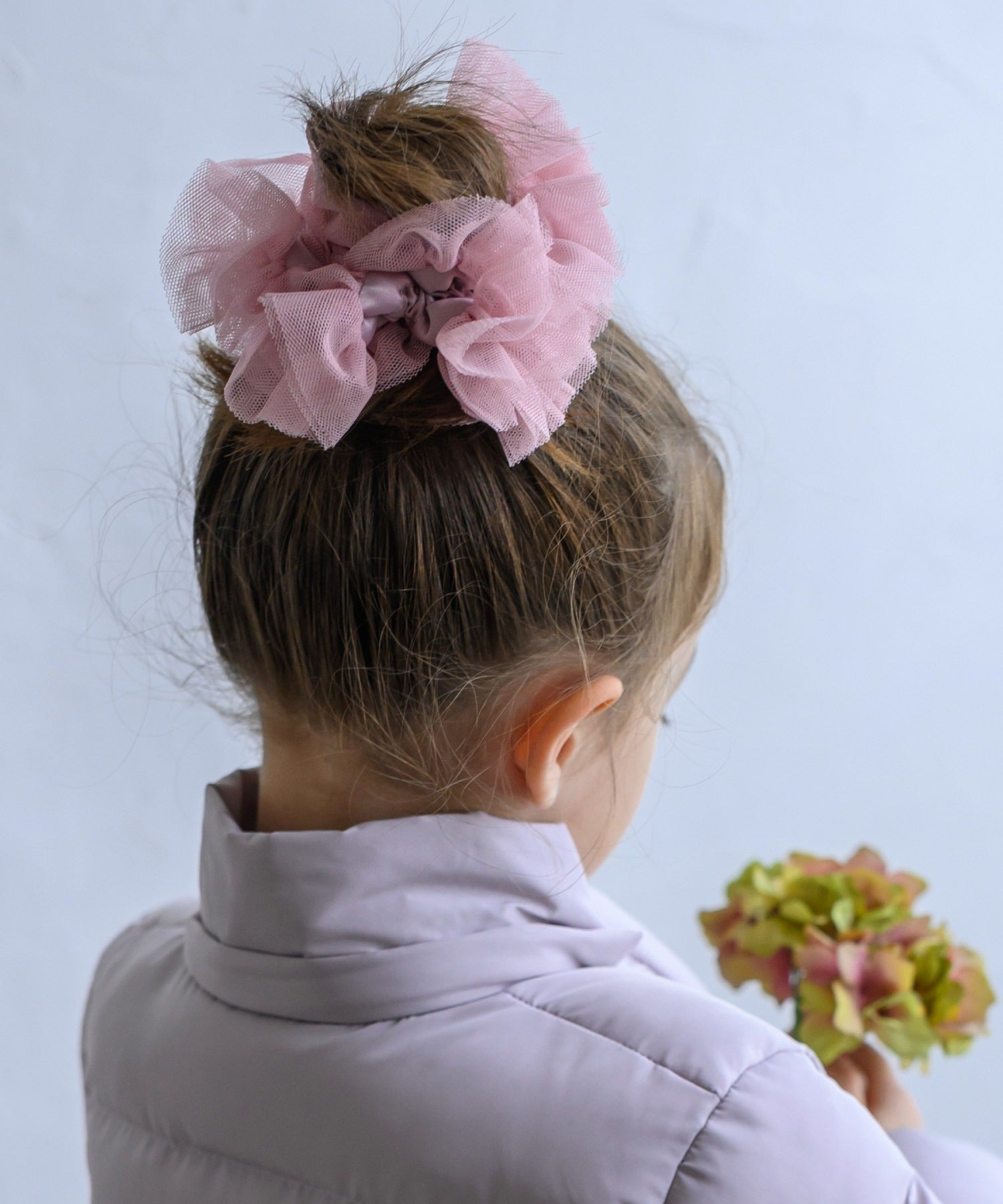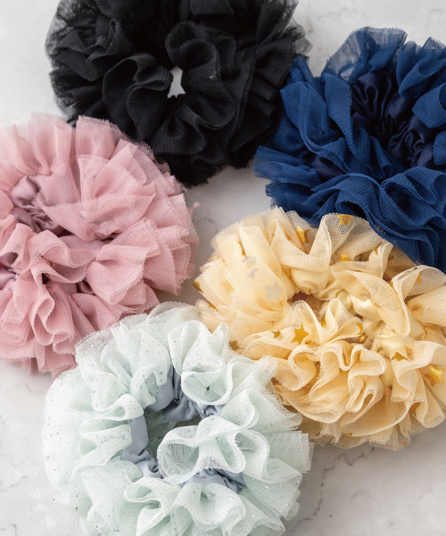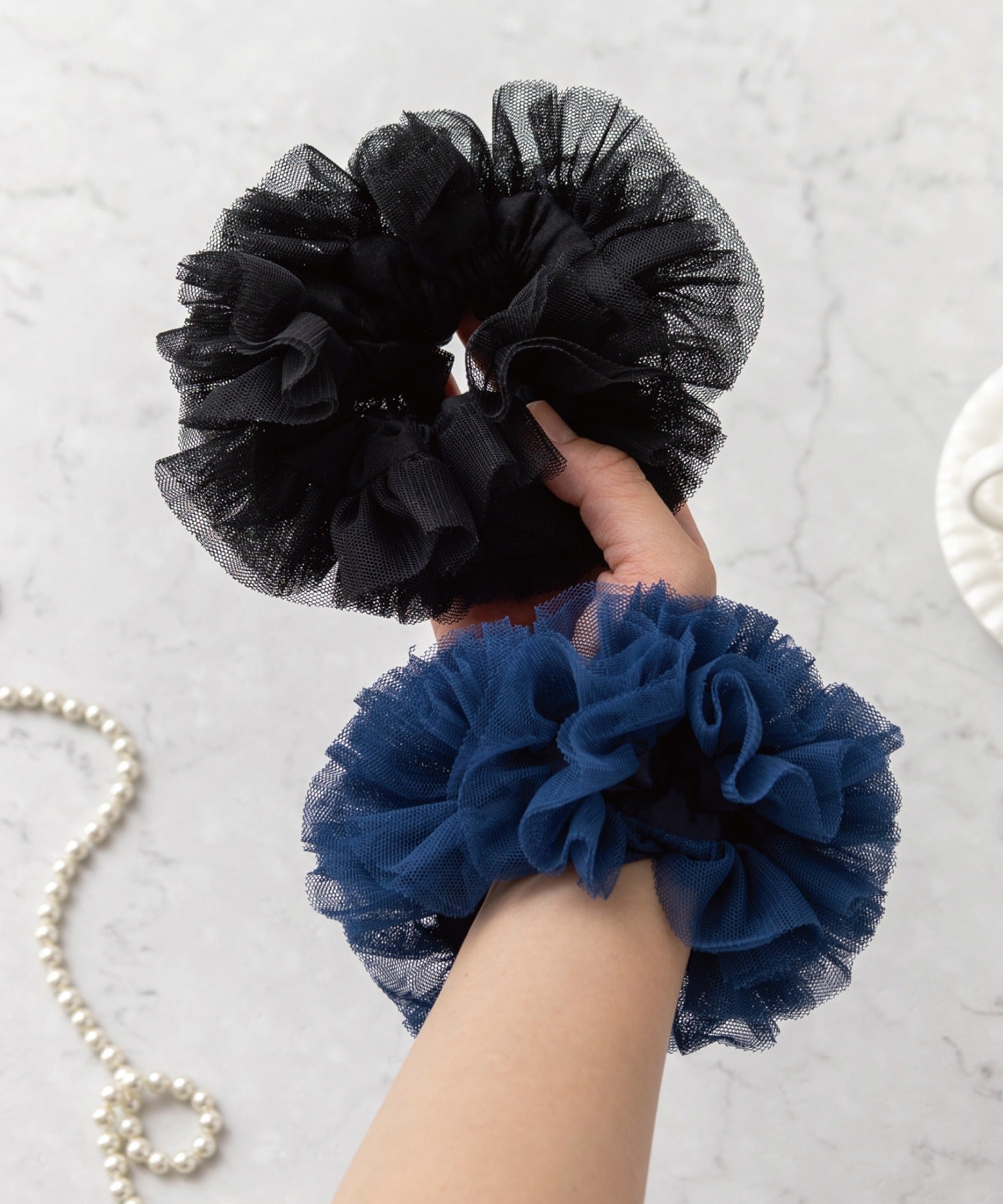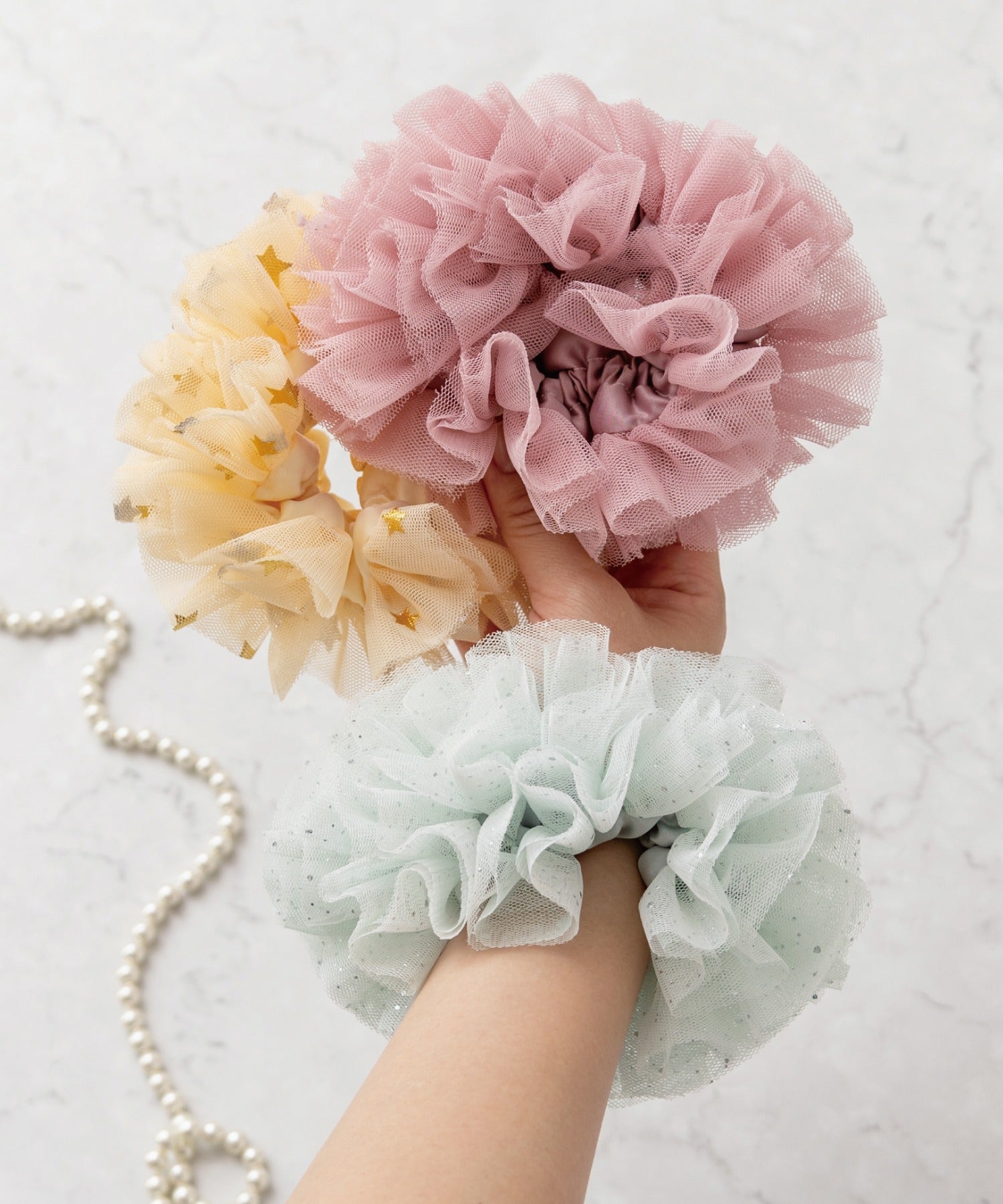 サテンベースにチュールフリル。ヘアアクセとしてはもちろんブレスレット風にも。