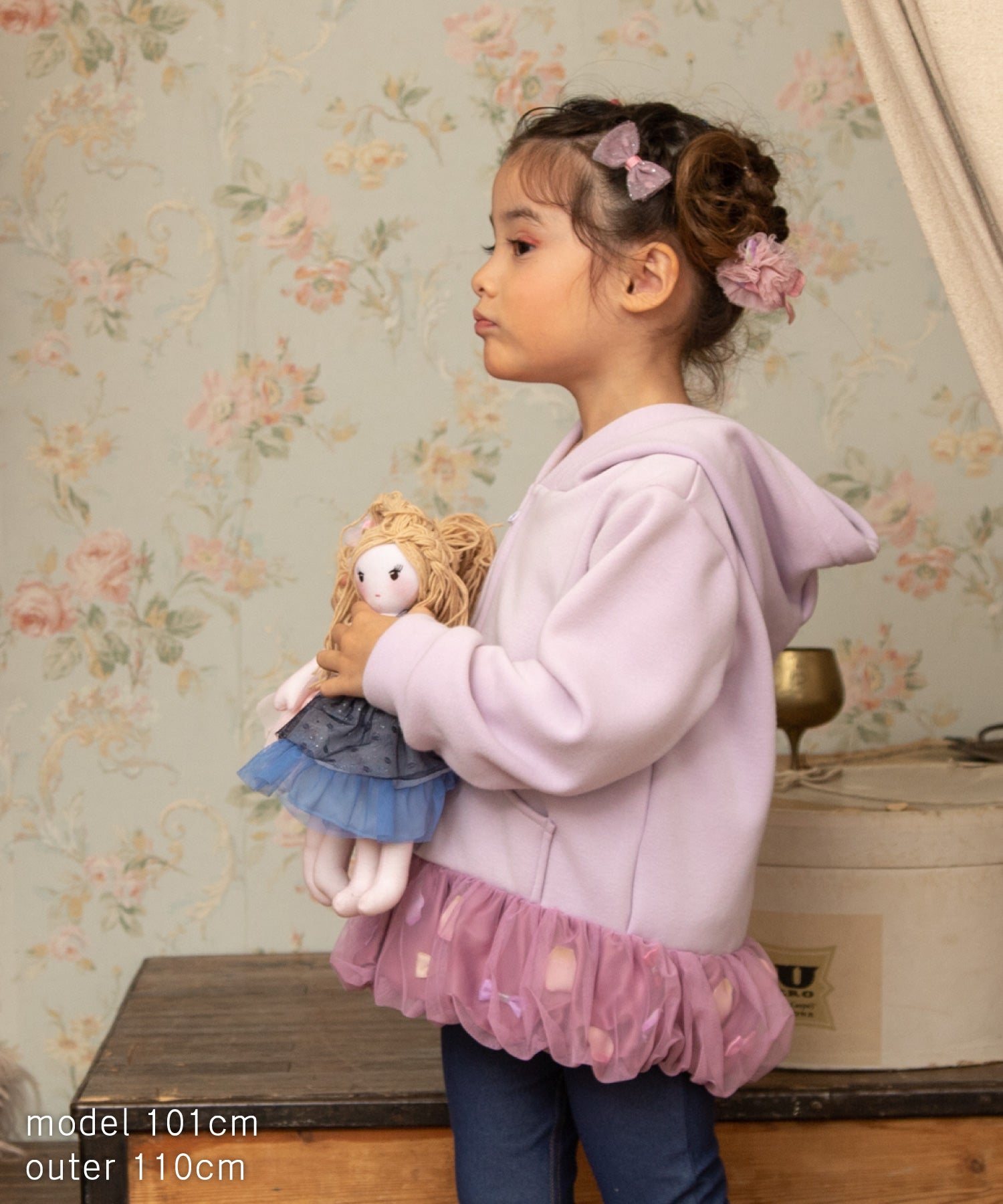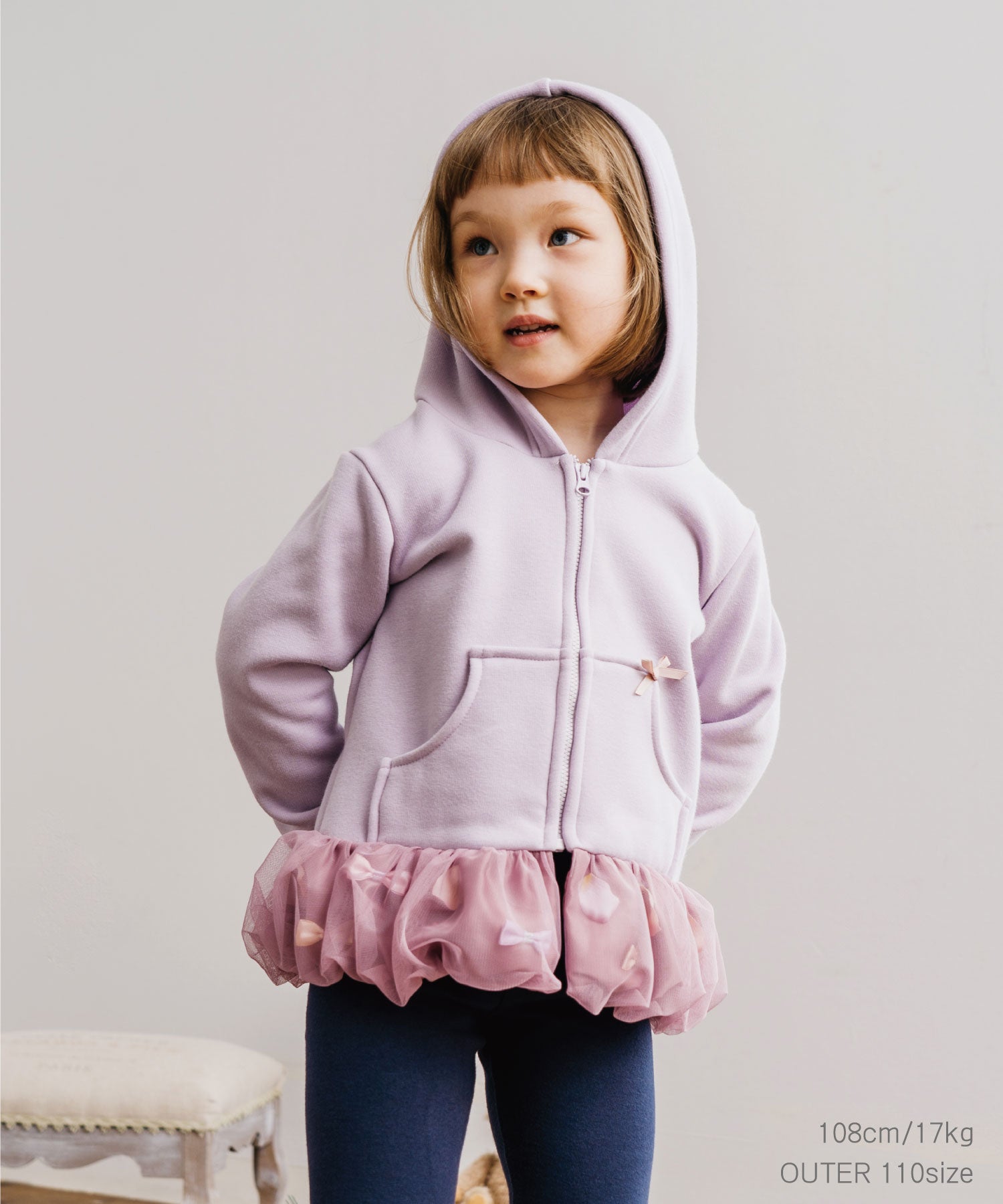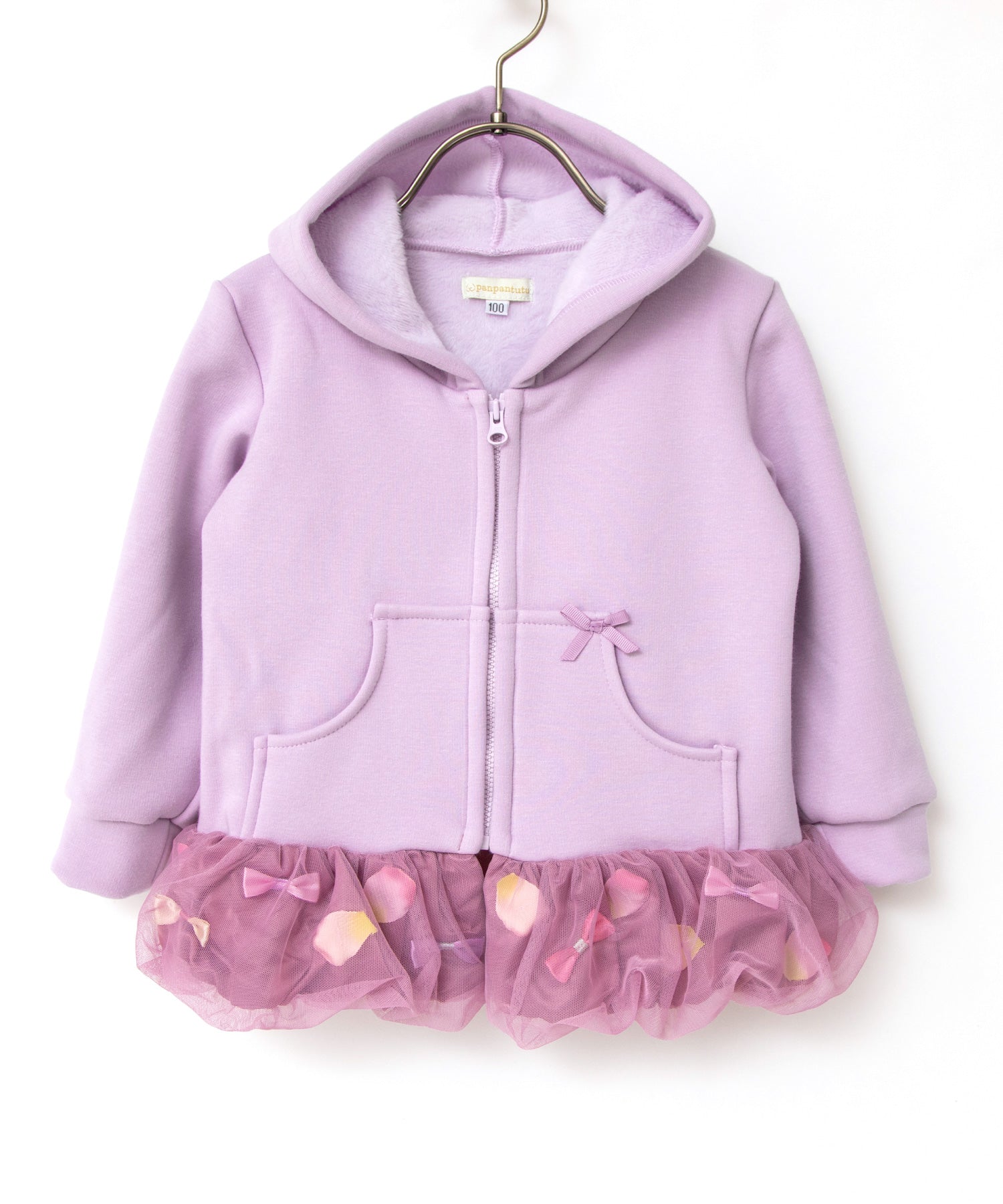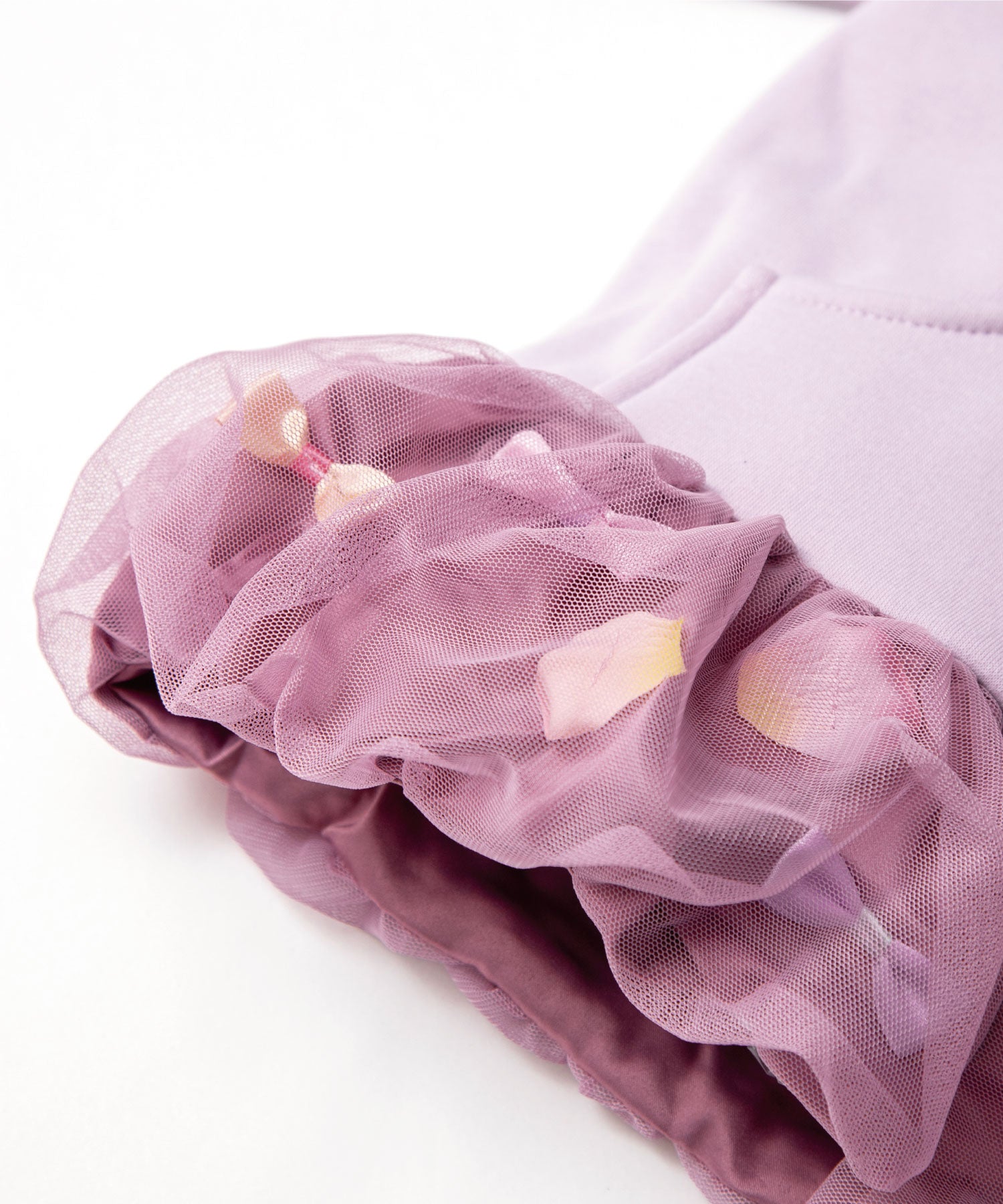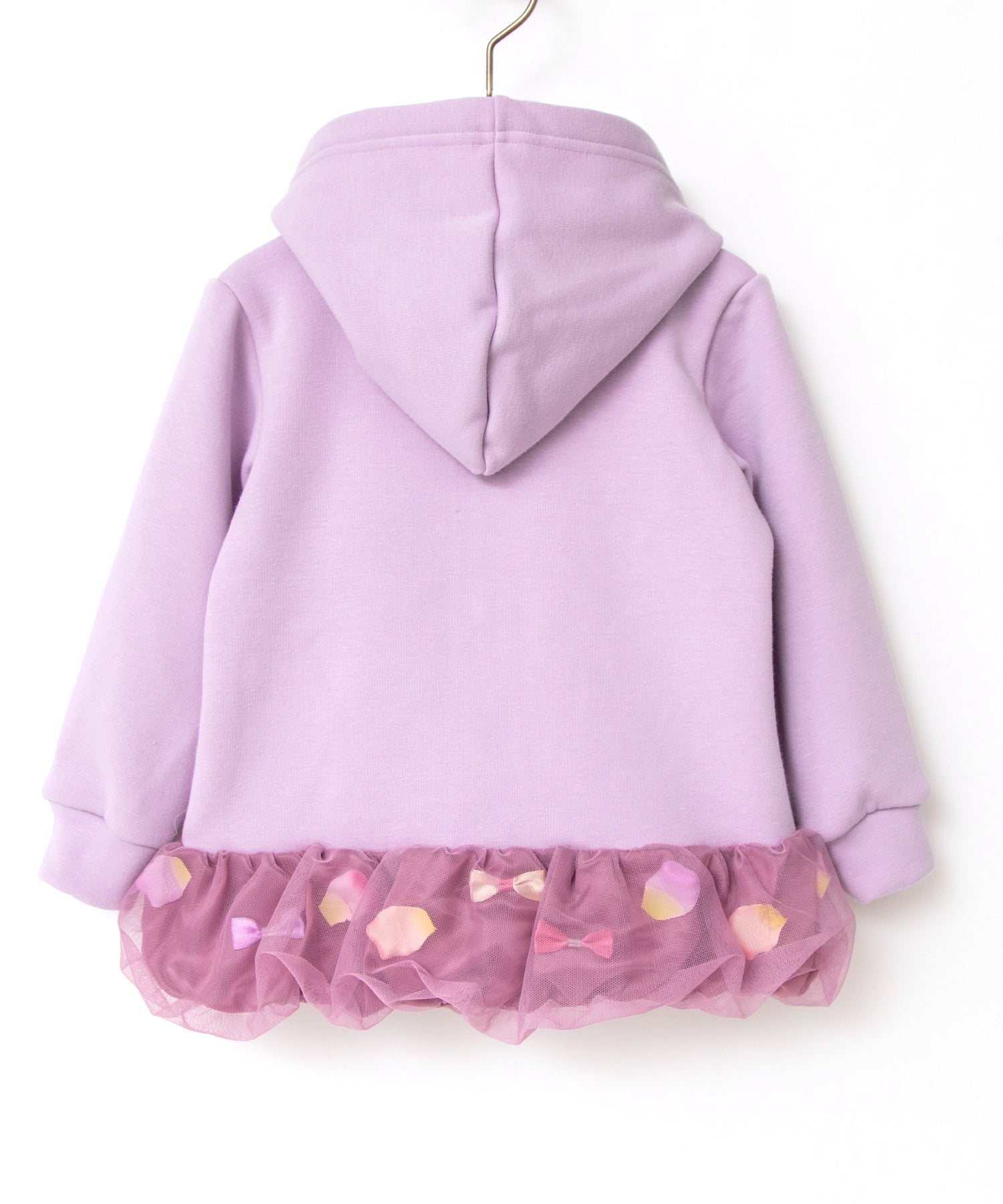 バルーンのような裾の切り替え部分はひらひら花びら、サテンリボンを散りばめて、ふわっとチュールで包み込みました。オリジナルの花びらは、柔らかな素材で厚みもあり、本物の花びらのよう…。花びら& リボンは、一つ一つ生地に縫い付けてあるので、いっぱい動いてもモチーフがかたよらないのも嬉しい。カジュアルな印象のパーカーも着用するだけで、ドレスアップできちゃいます。