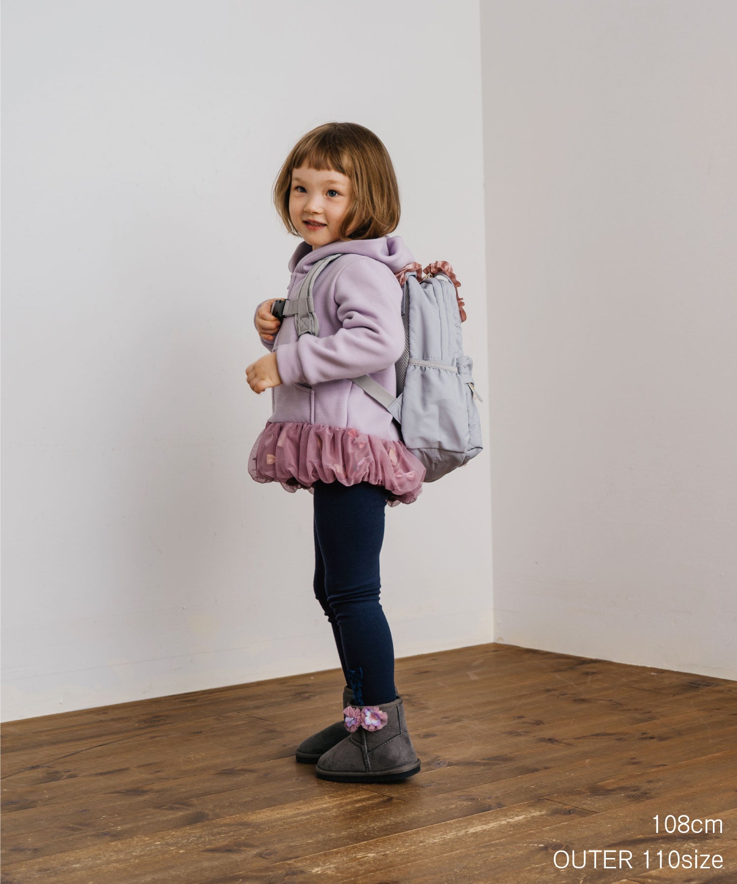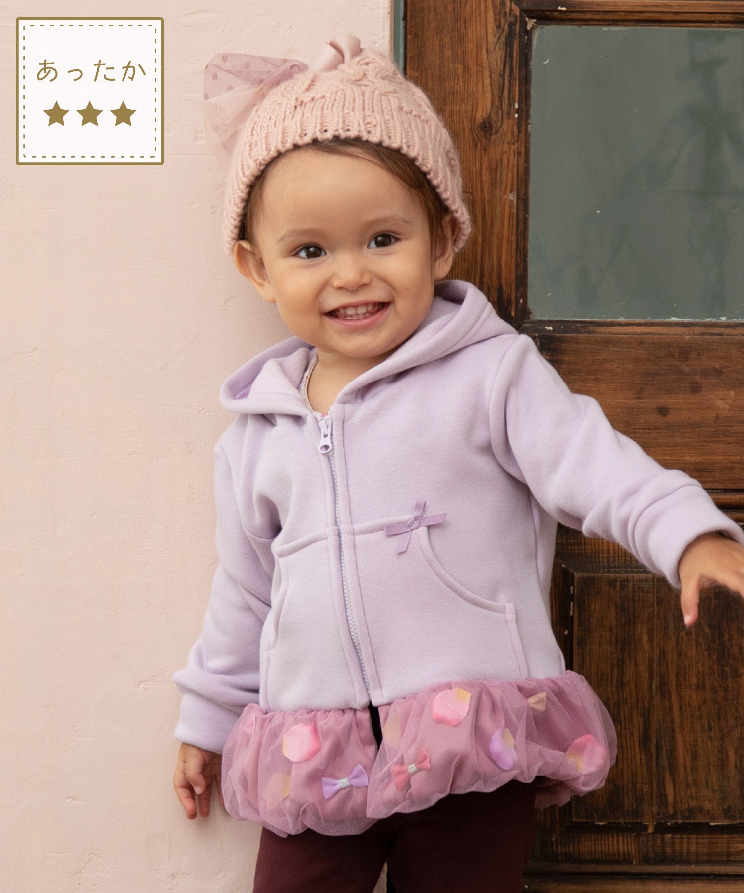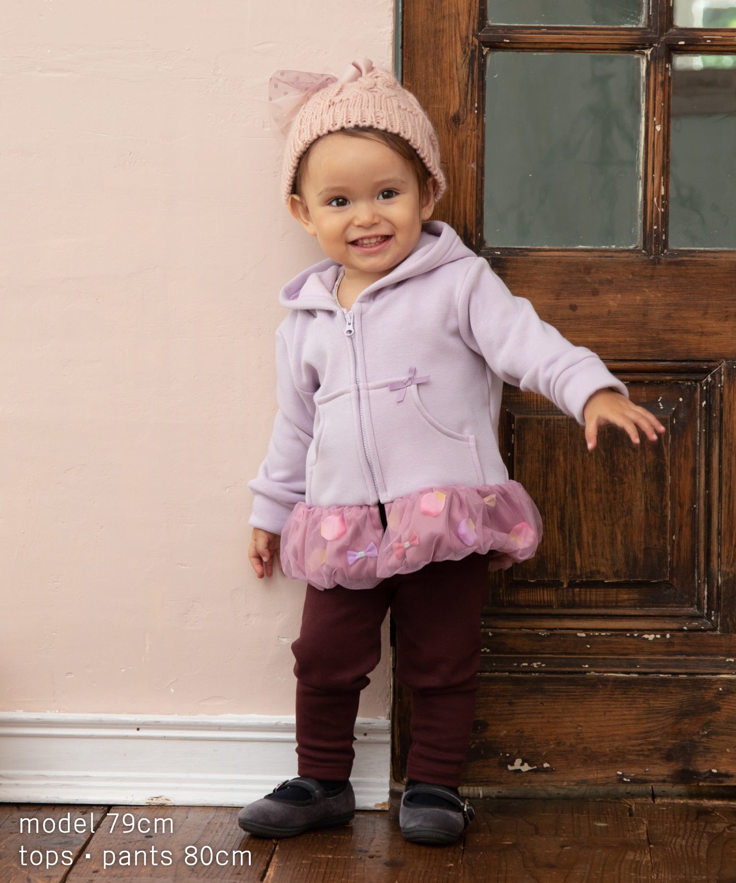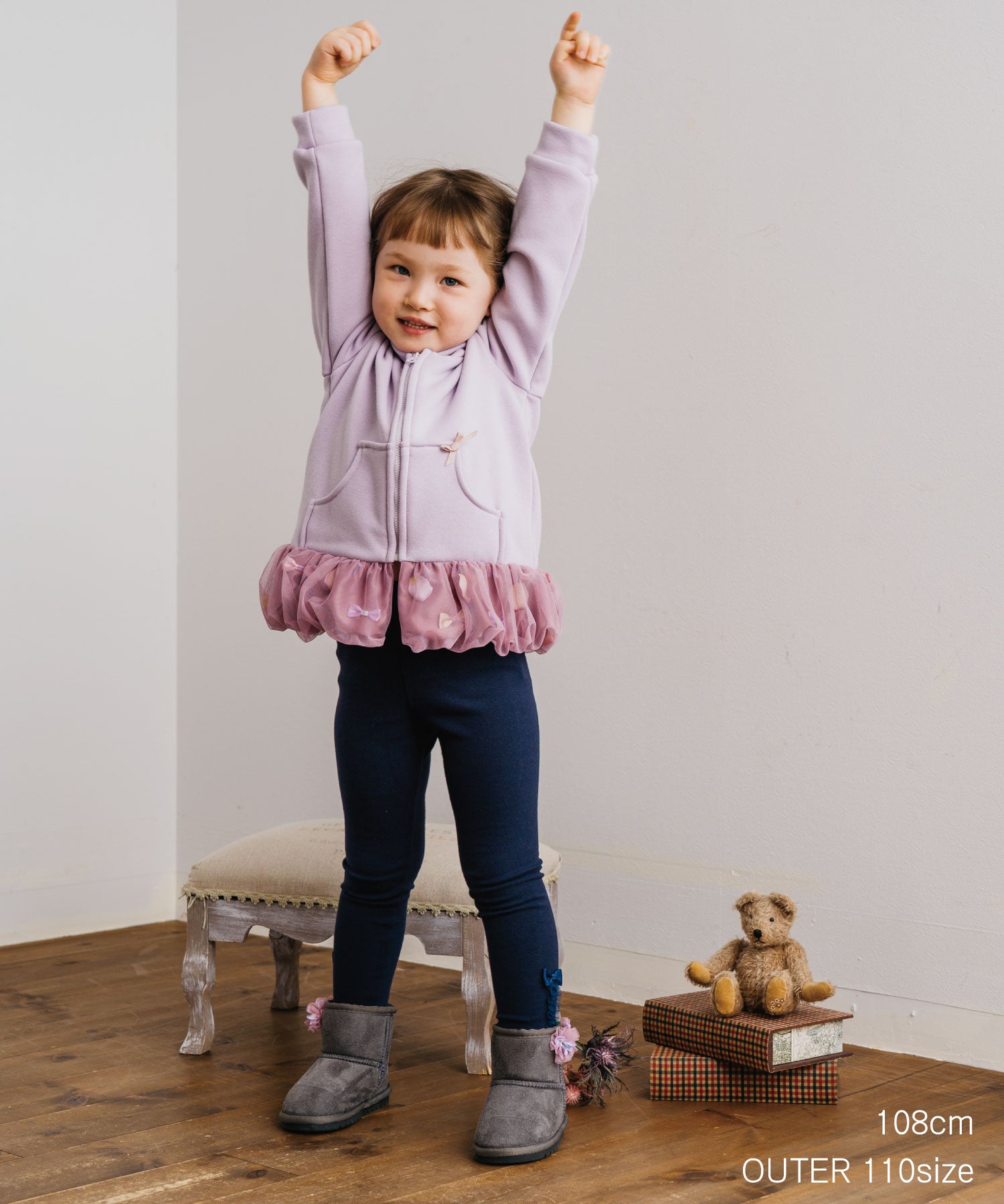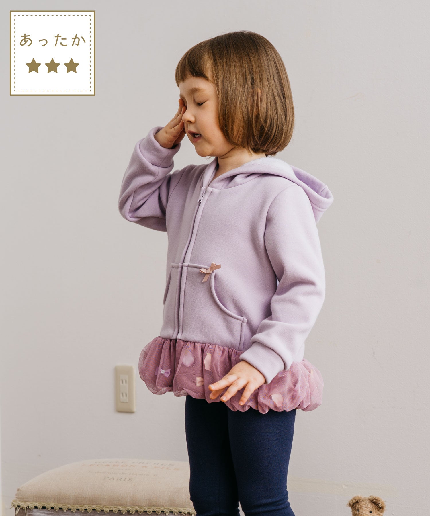 バルーンのような裾の切り替え部分はひらひら花びら、サテンリボンを散りばめて、ふわっとチュールで包み込みました。オリジナルの花びらは、柔らかな素材で厚みもあり、本物の花びらのよう…。花びら& リボンは、一つ一つ生地に縫い付けてあるので、いっぱい動いてもモチーフがかたよらないのも嬉しい。カジュアルな印象のパーカーも着用するだけで、ドレスアップできちゃいます。
