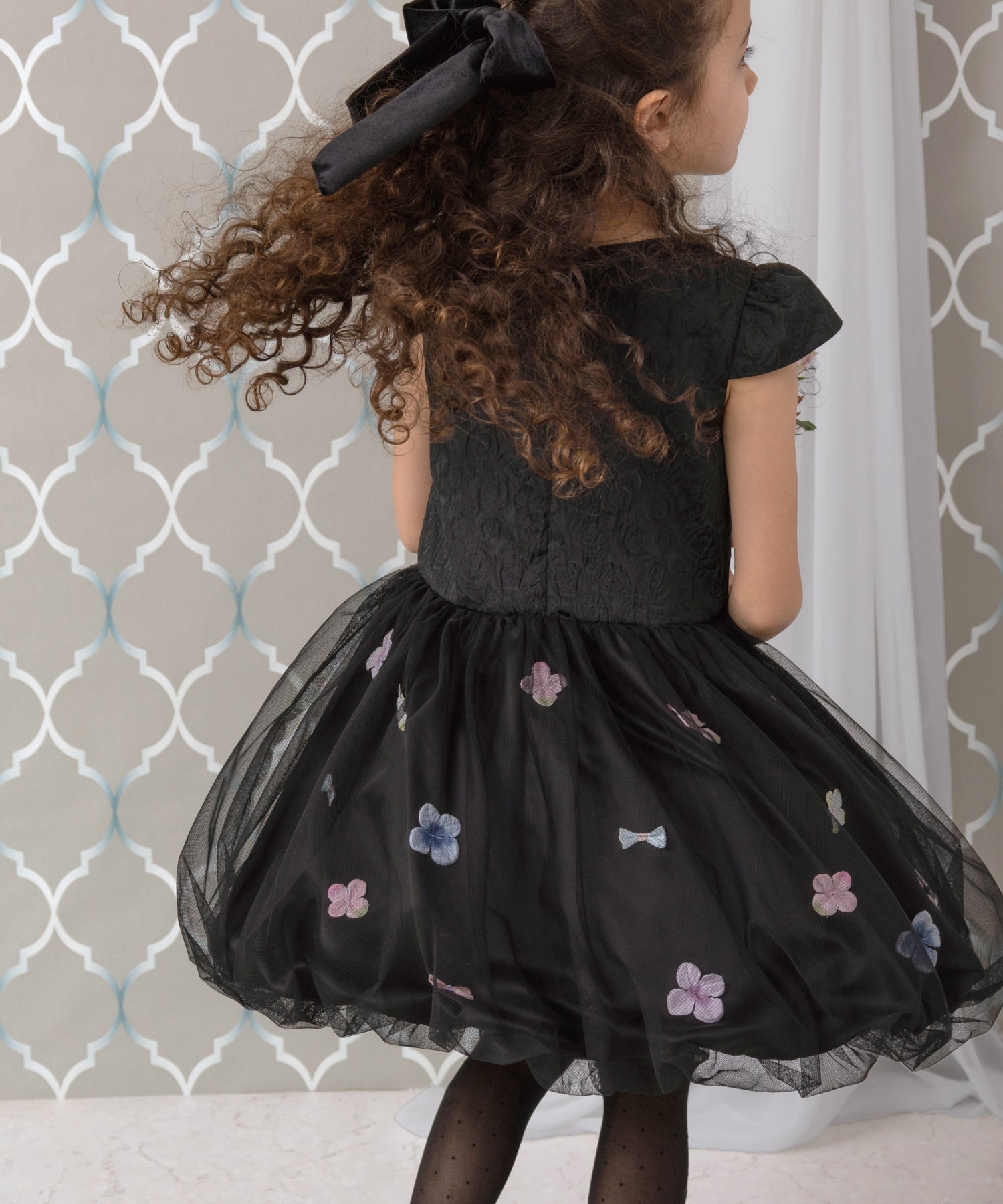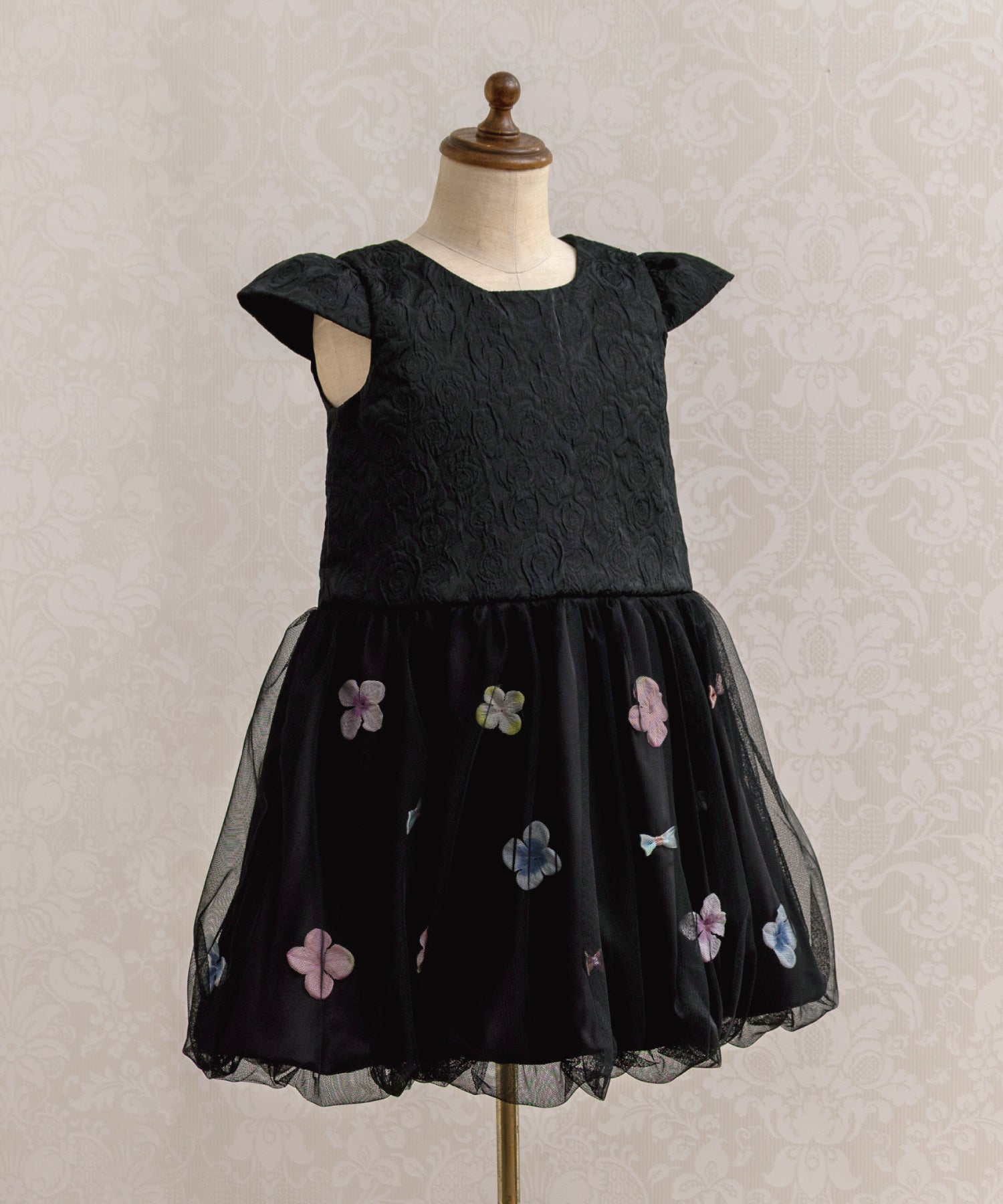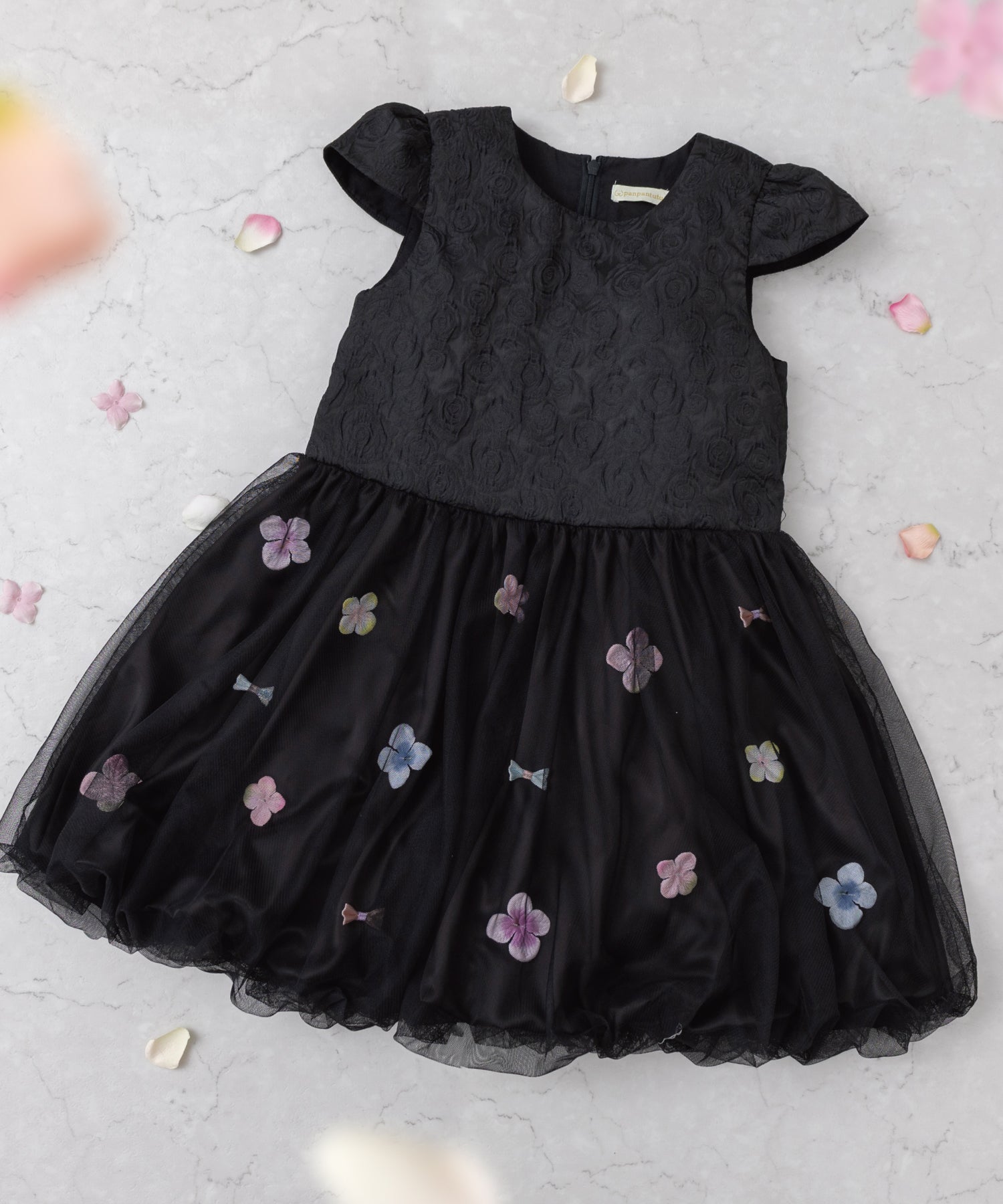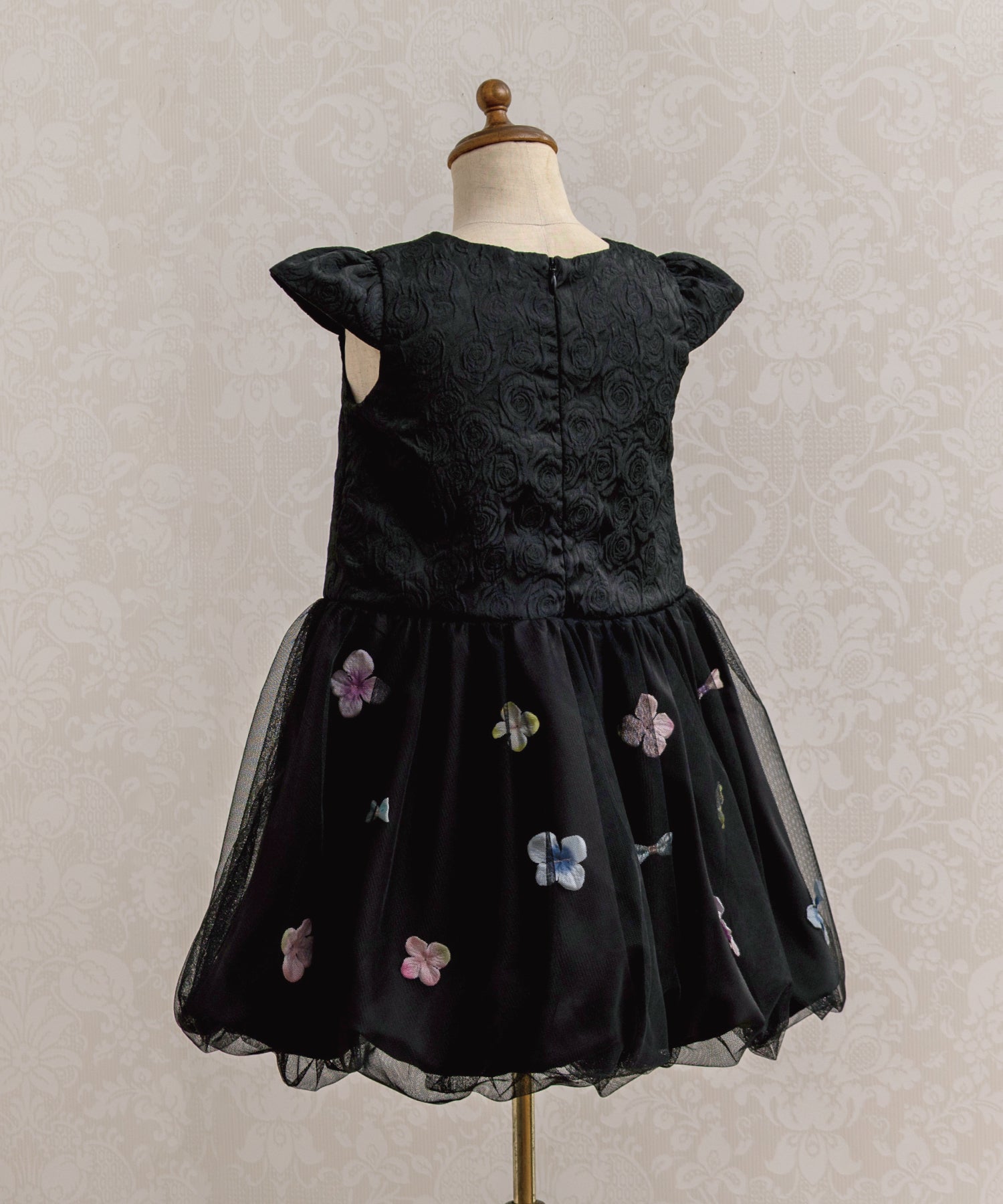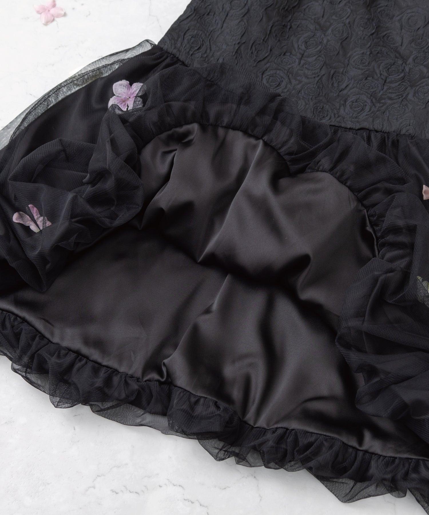 黒のサテン生地にたっぷりと散りばめたお花とリボンが、まるで夜のガーデンのよう。
