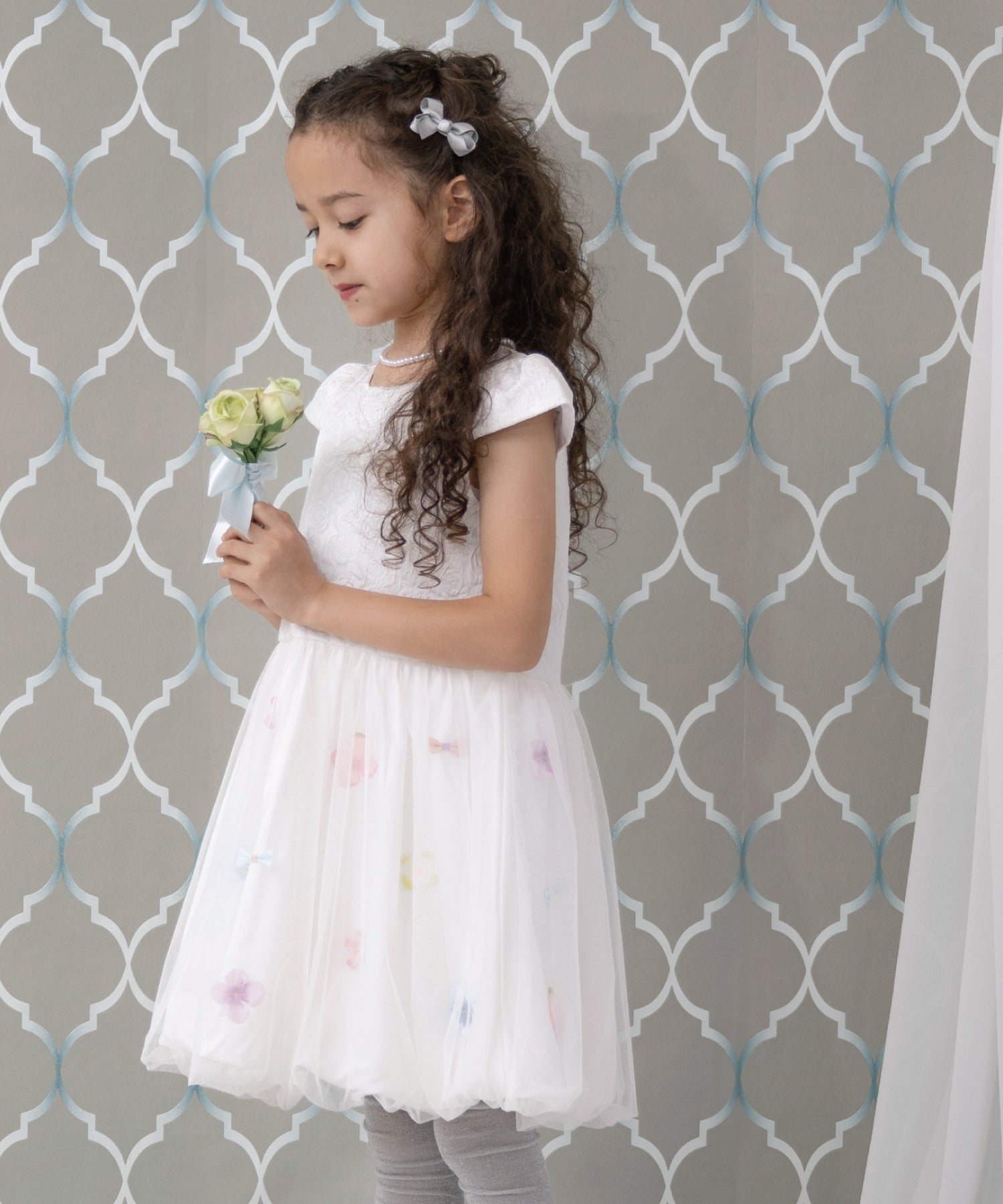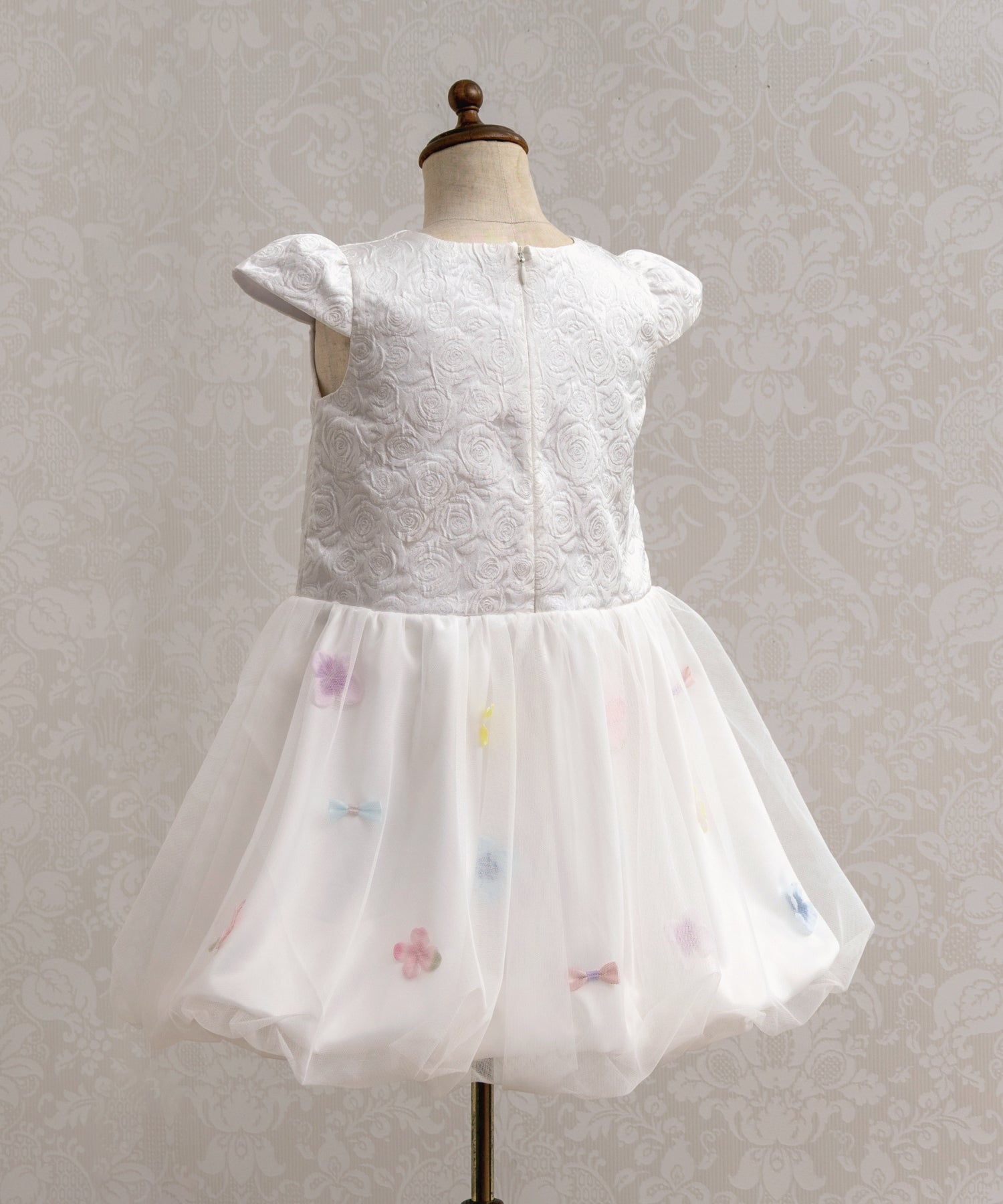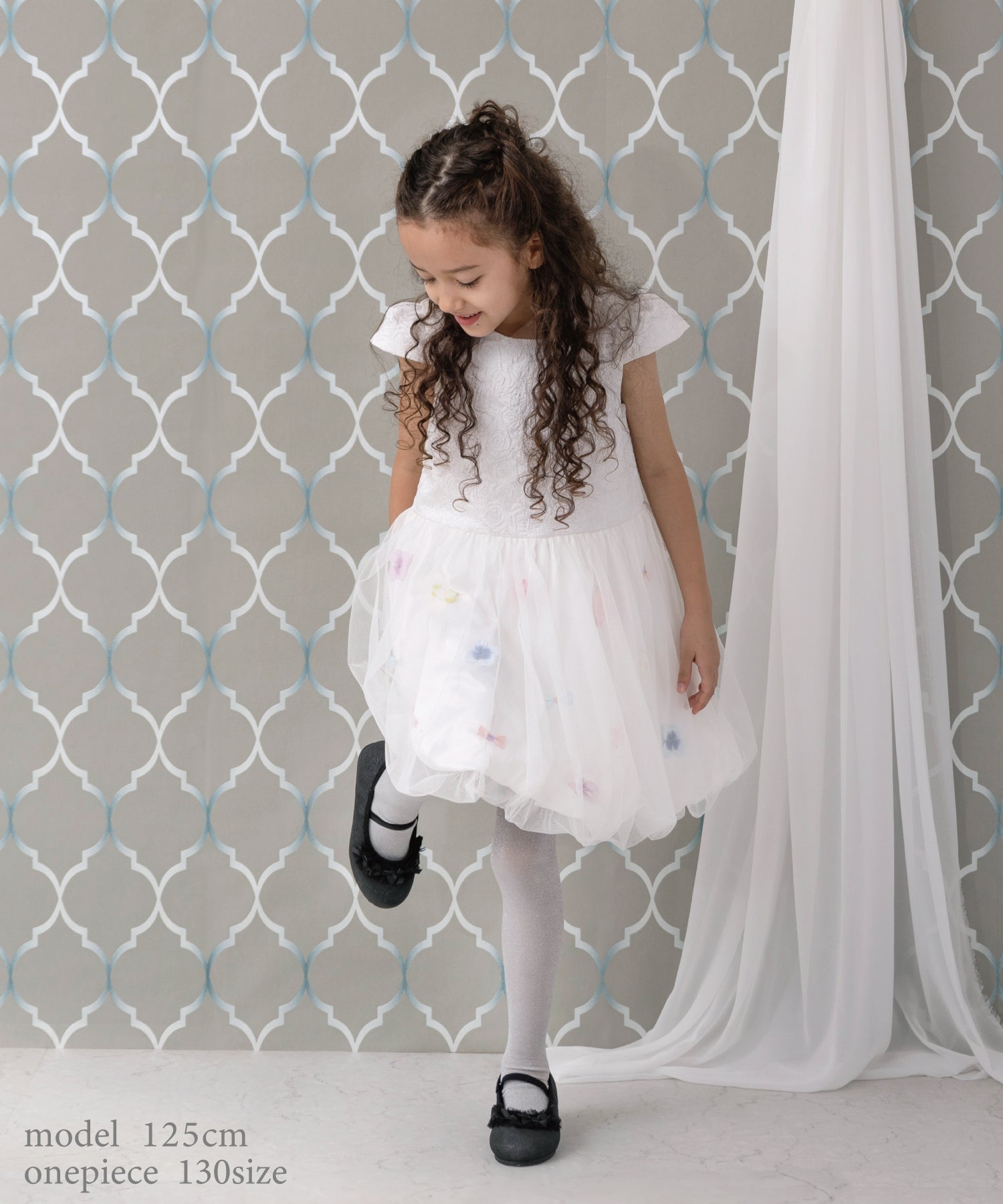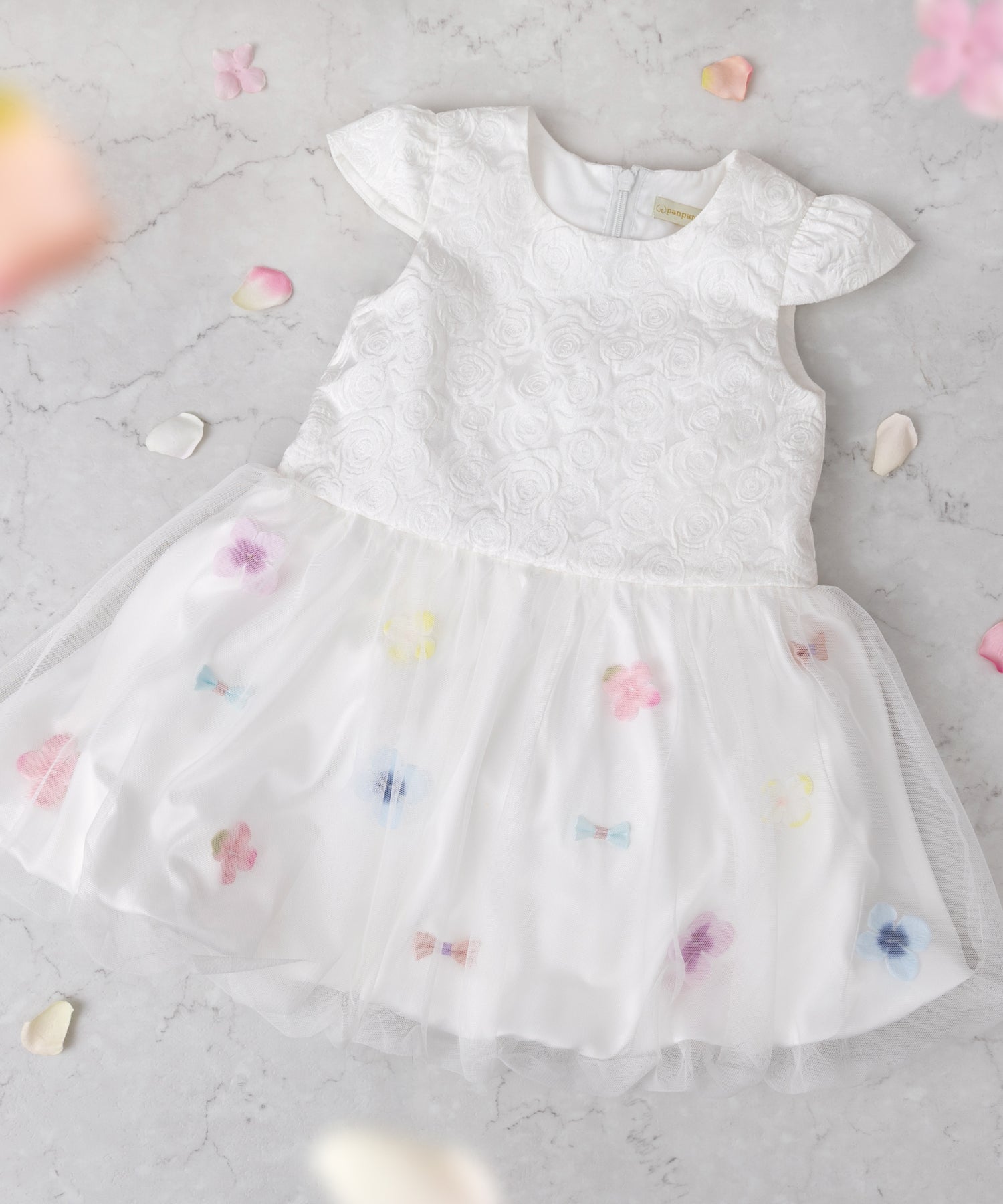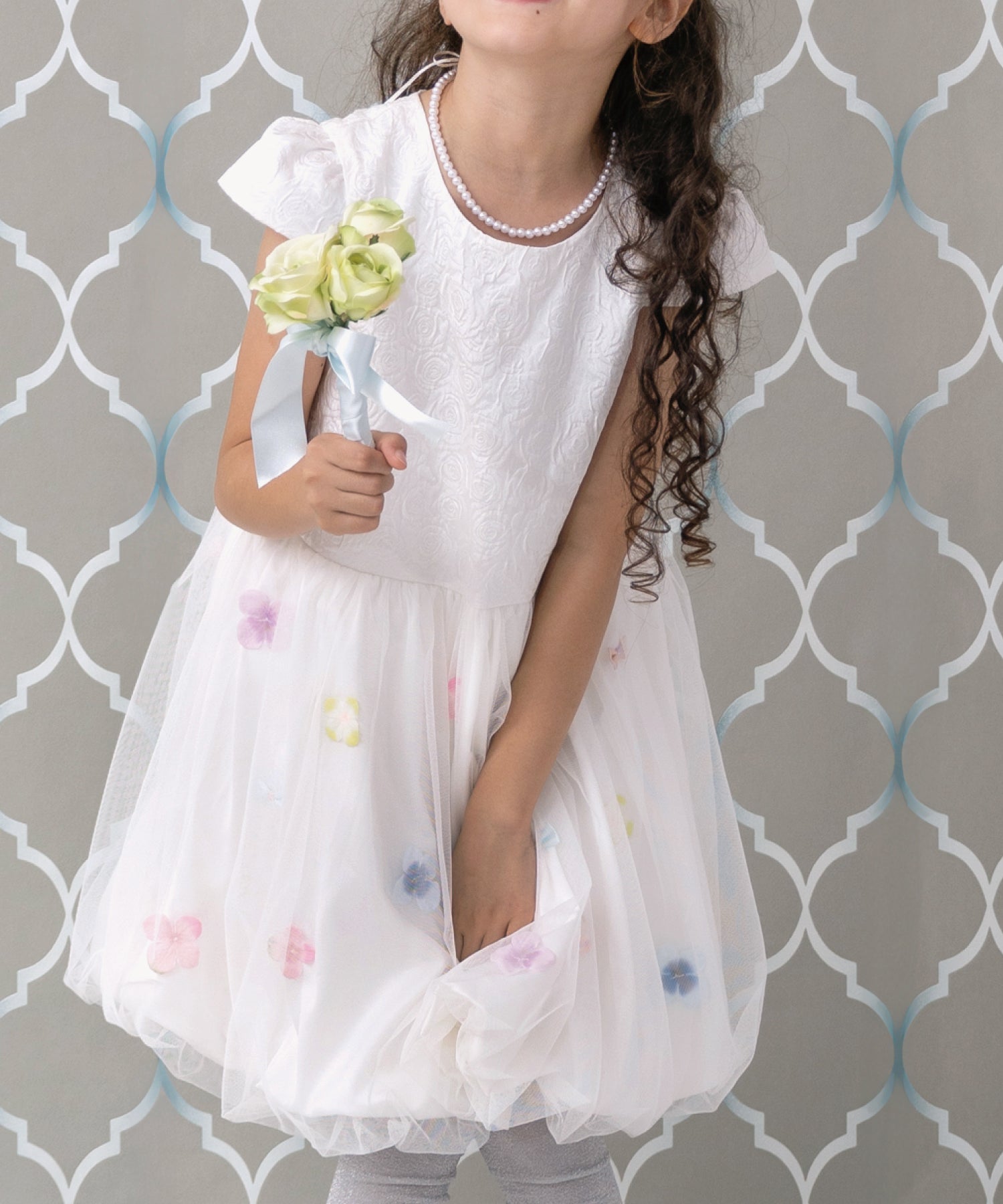 白のサテン生地にたっぷりと散りばめたお花とリボン。まるで小さな花嫁さんのようにピュアなワンピース。