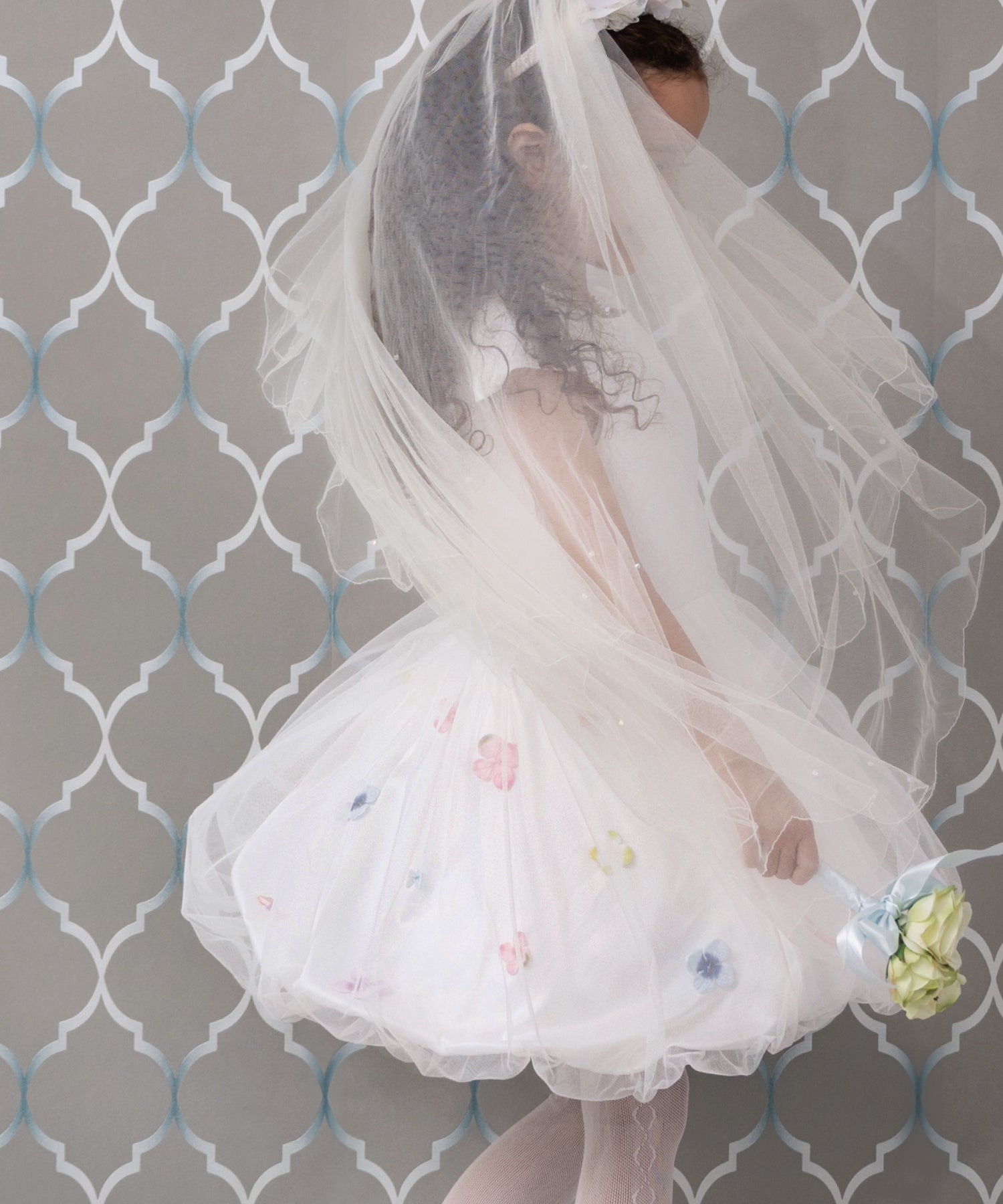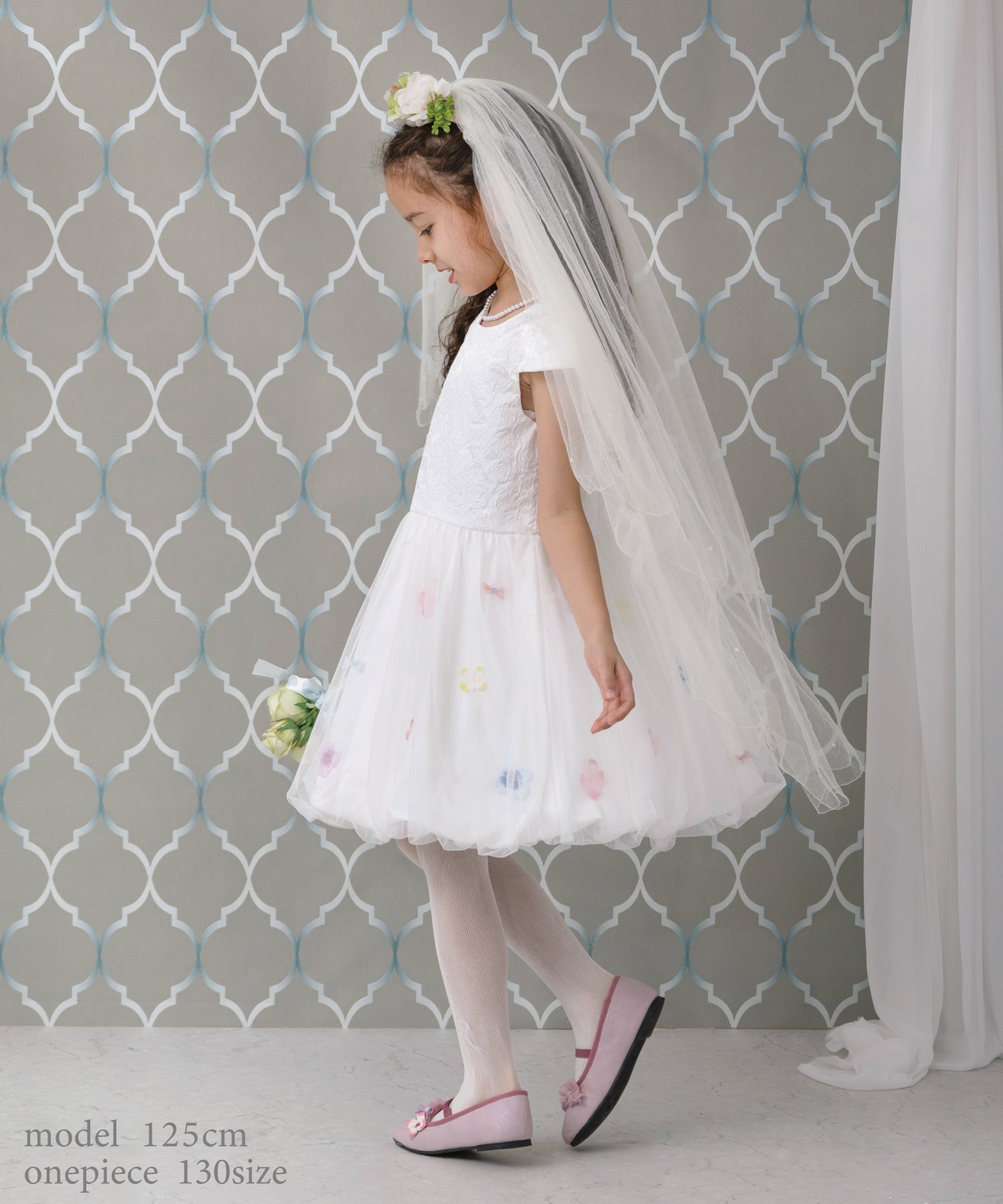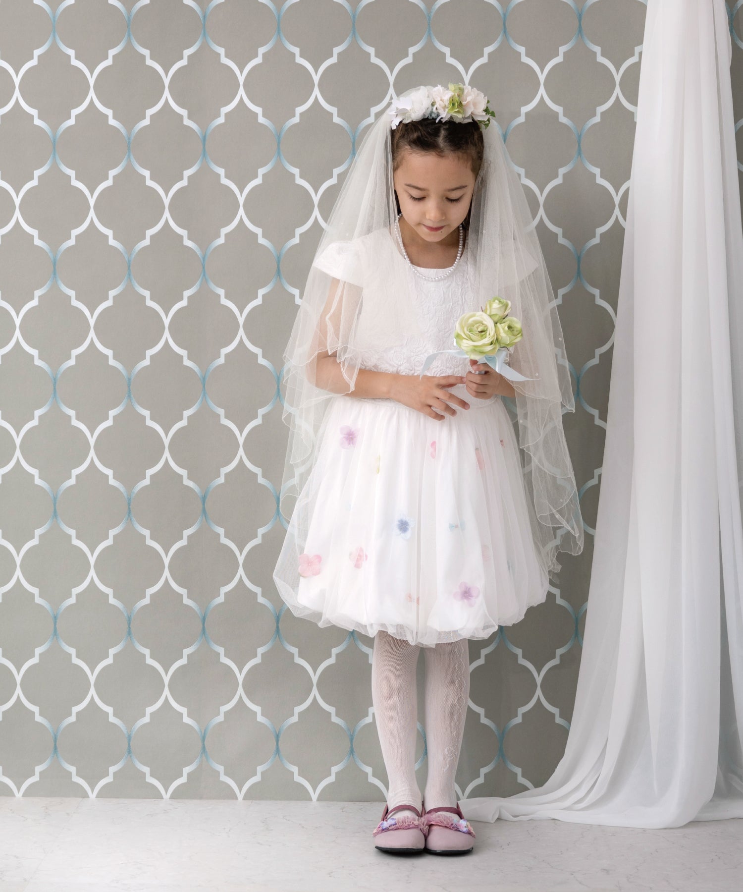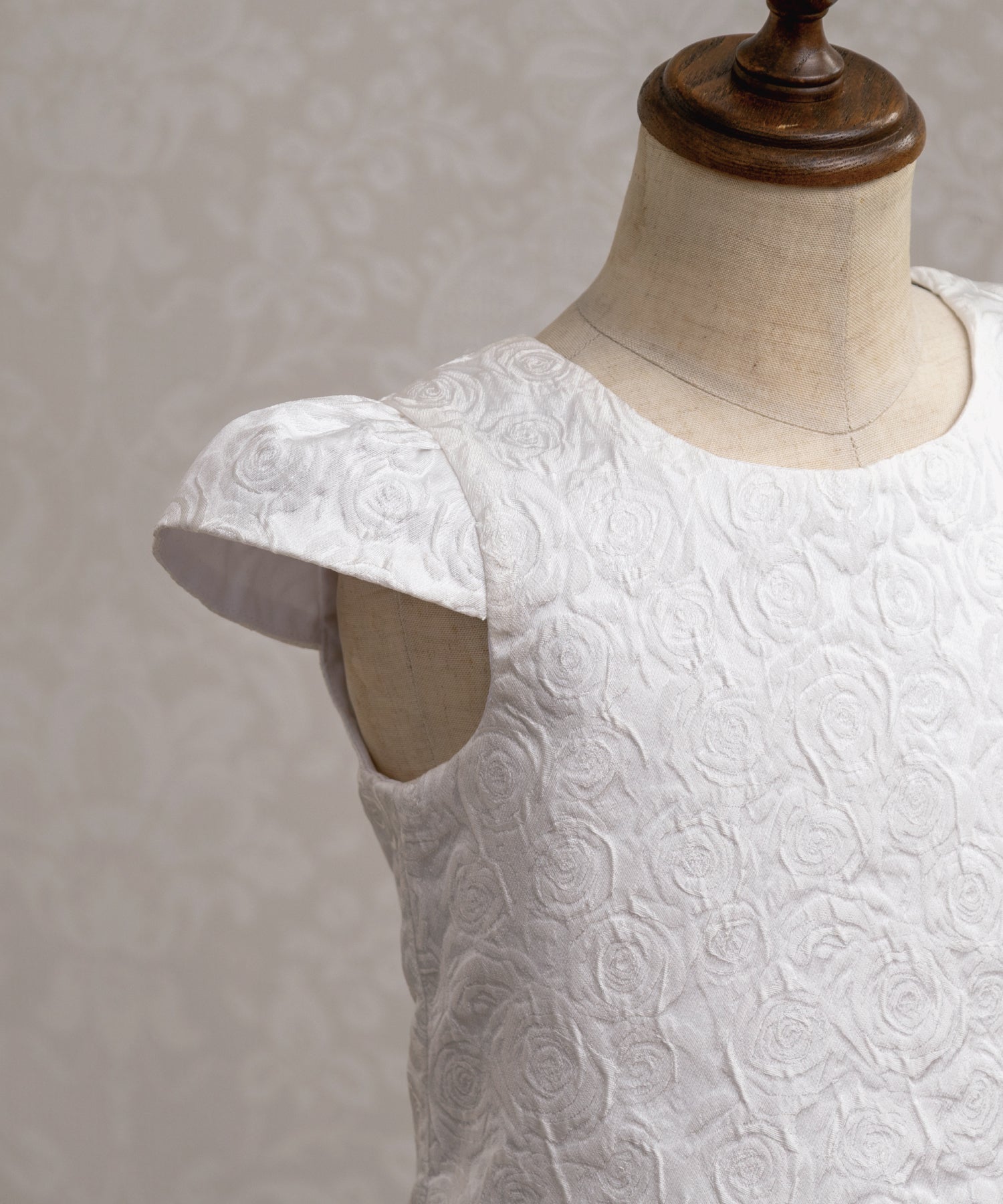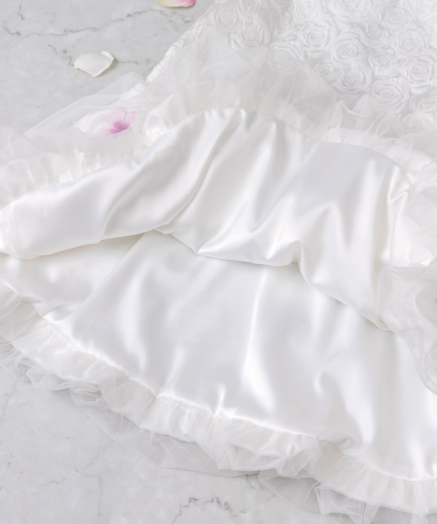 白のサテン生地にたっぷりと散りばめたお花とリボン。まるで小さな花嫁さんのようにピュアなワンピース。