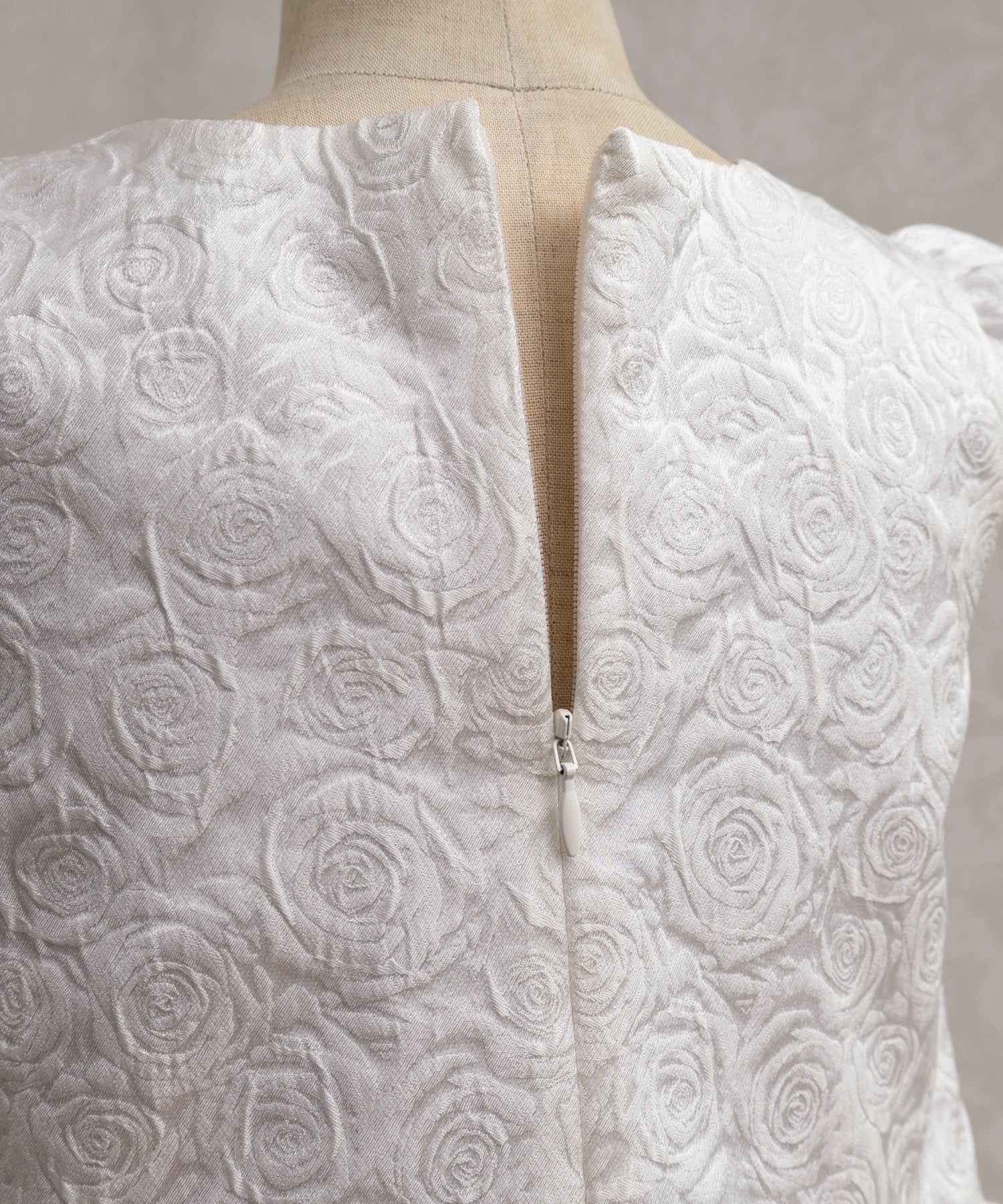 トップスはローズ柄のジャガード織でエレガントな雰囲気。程よく肩が隠れるキャップスリーブ。