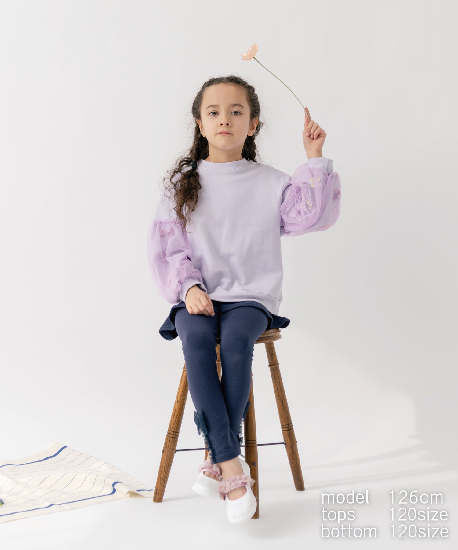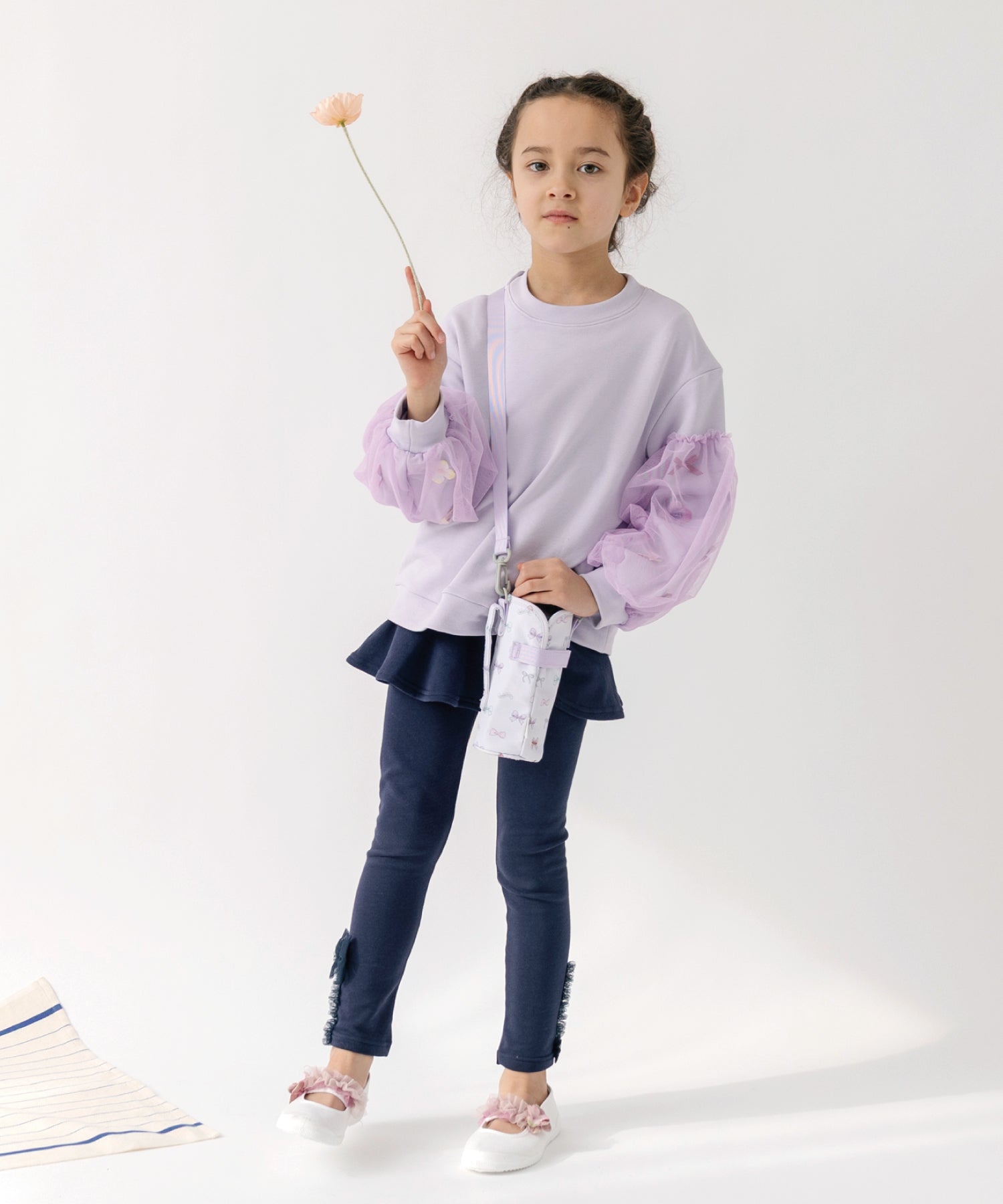 裾には左右でデザインの異なるチュールリボンをあしらい、さりげない遊び心をプラス。