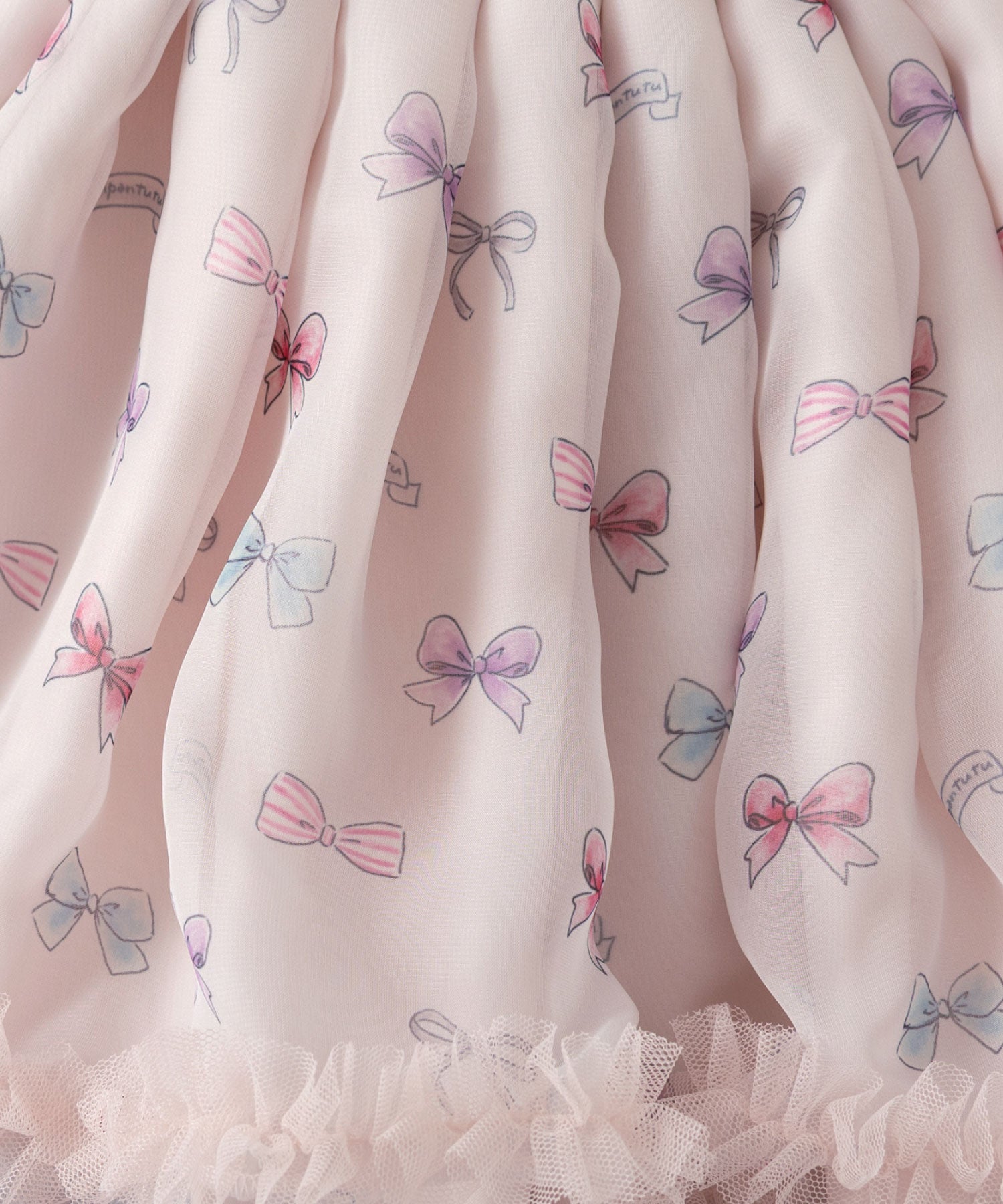 サテンベースにリボン柄のシフォンを重ね、裾には3段のグラデーションチュールを施しました。