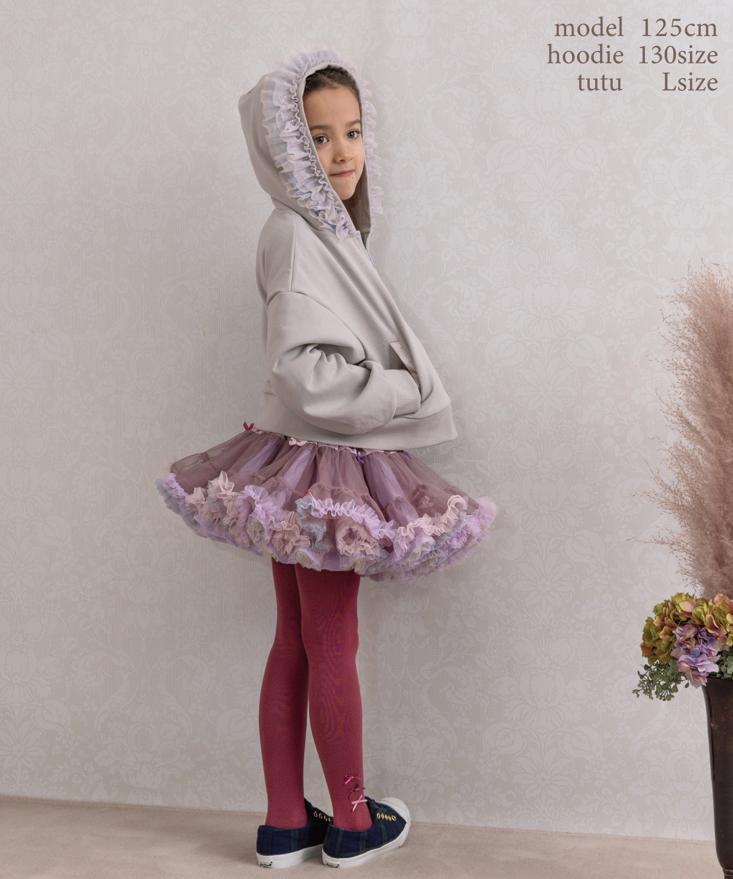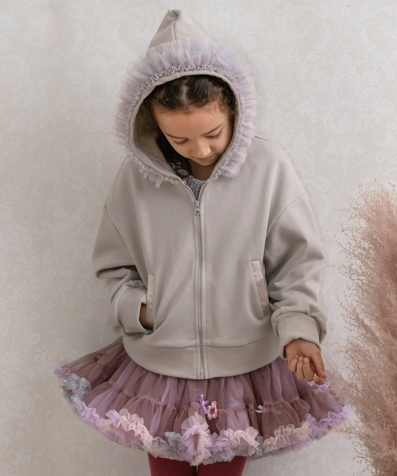 フードにミルフィーユのようにあしらわれたチュールフリルがポイント。ミルクピンク・ブルー・キラキラチュールのグラデーション。