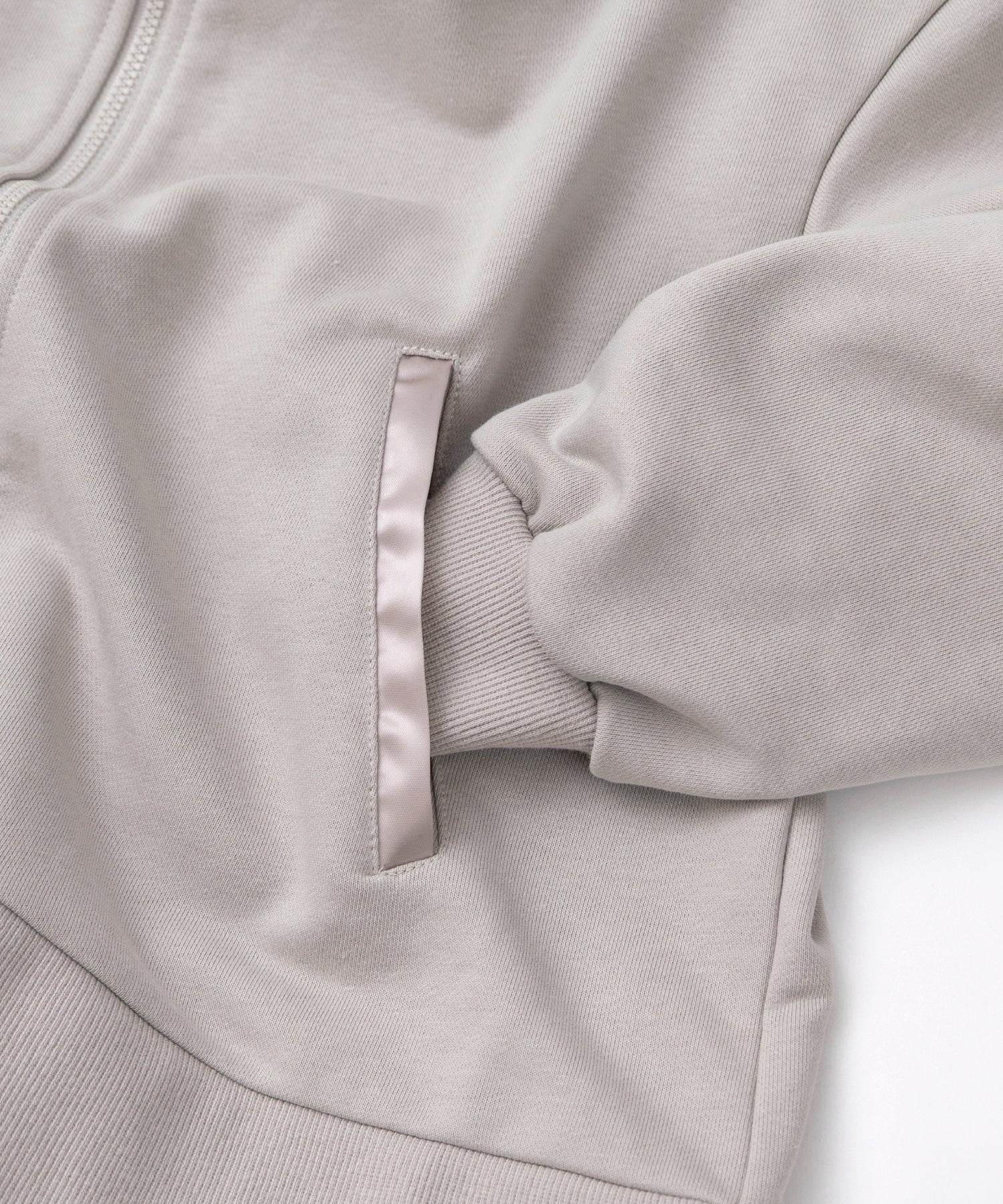 ポケット口はサテン生地でリッチさをプラス。 ベースはストレッチのきいたスウェット素材で、着心地抜群。