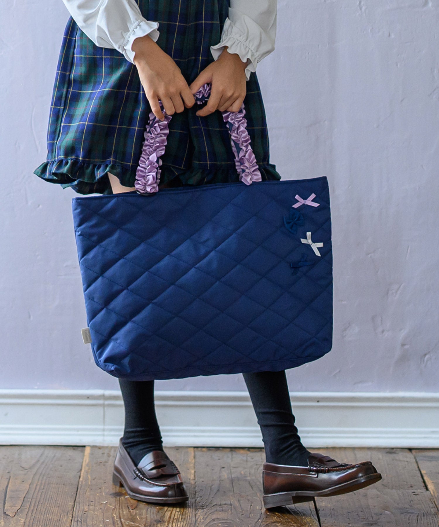 ベースはマットキルト素材。持ち手のボリュームのあるサテンフリルが高級感あふれるデザイン。内側は全て撥水素材でデイリーユースにも安心。全てネームタグつき。