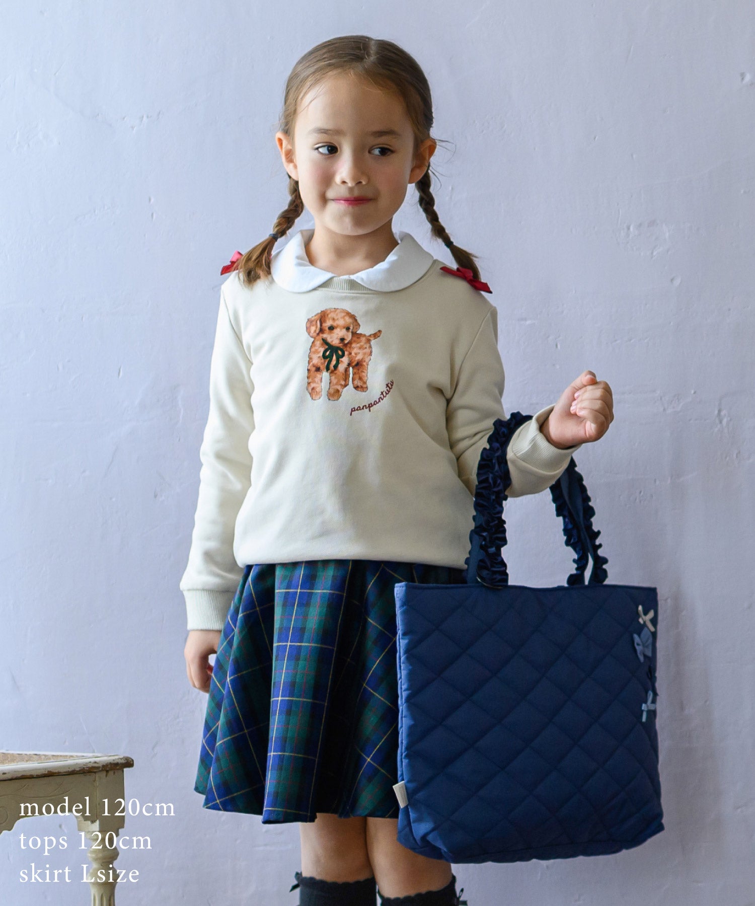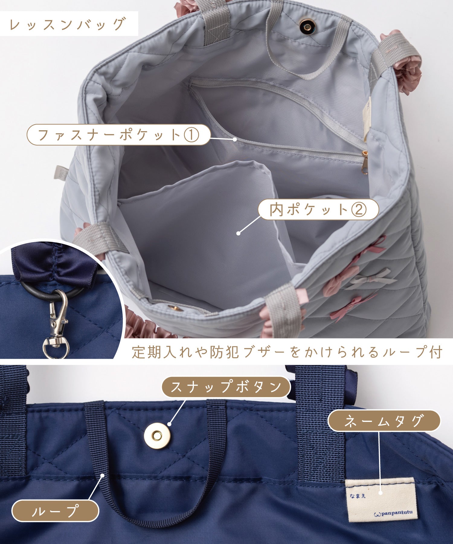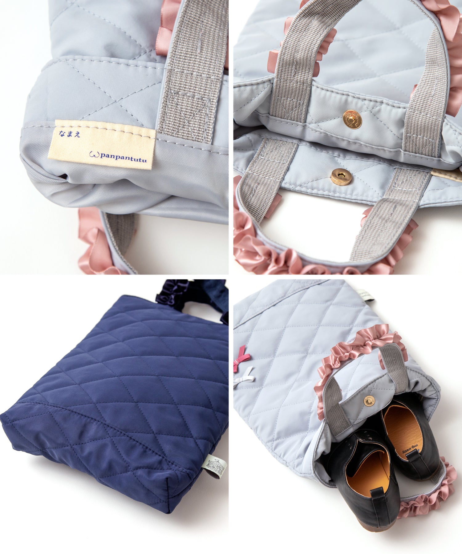 ベースはマットキルト素材。持ち手のボリュームのあるサテンフリルが高級感あふれるデザイン。内側は全て撥水素材でデイリーユースにも安心。全てネームタグつき。