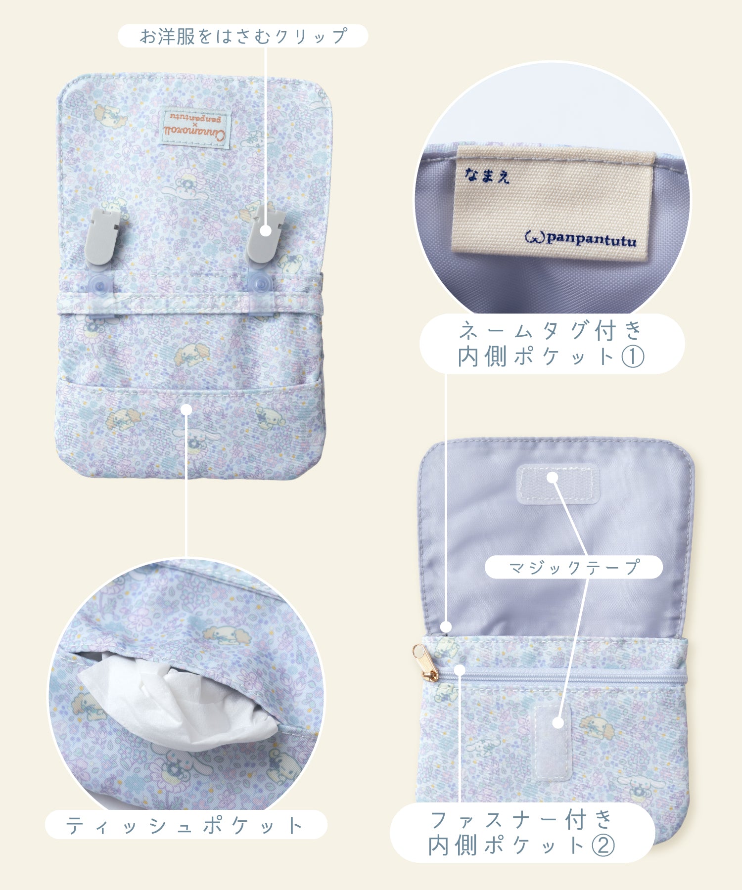 ①開けてすぐハンカチなど取り出せるネームタグ付きポケット。