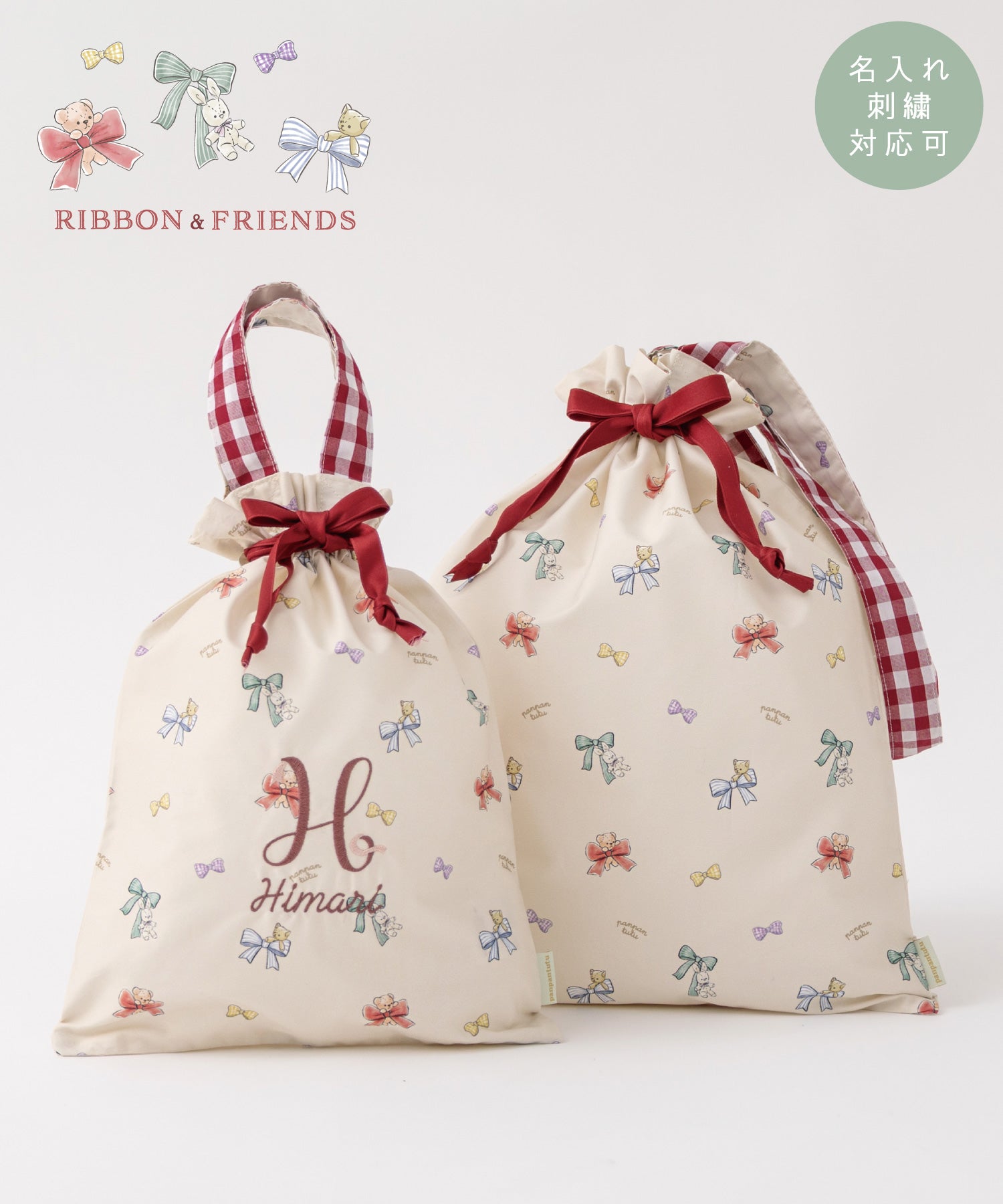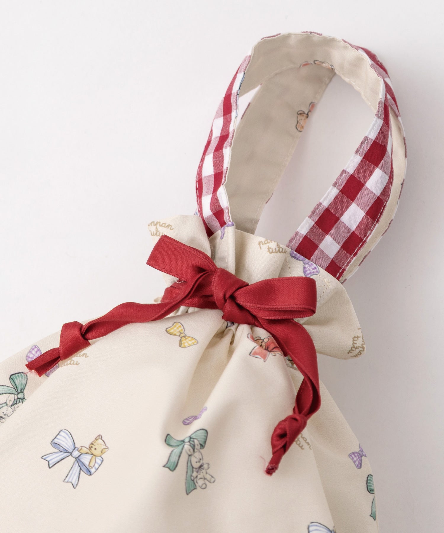 絵本の中から飛び出してきたような小さなオトモダチがいっぱいの巾着トート。レトロなギンガムチェックがアクセント。