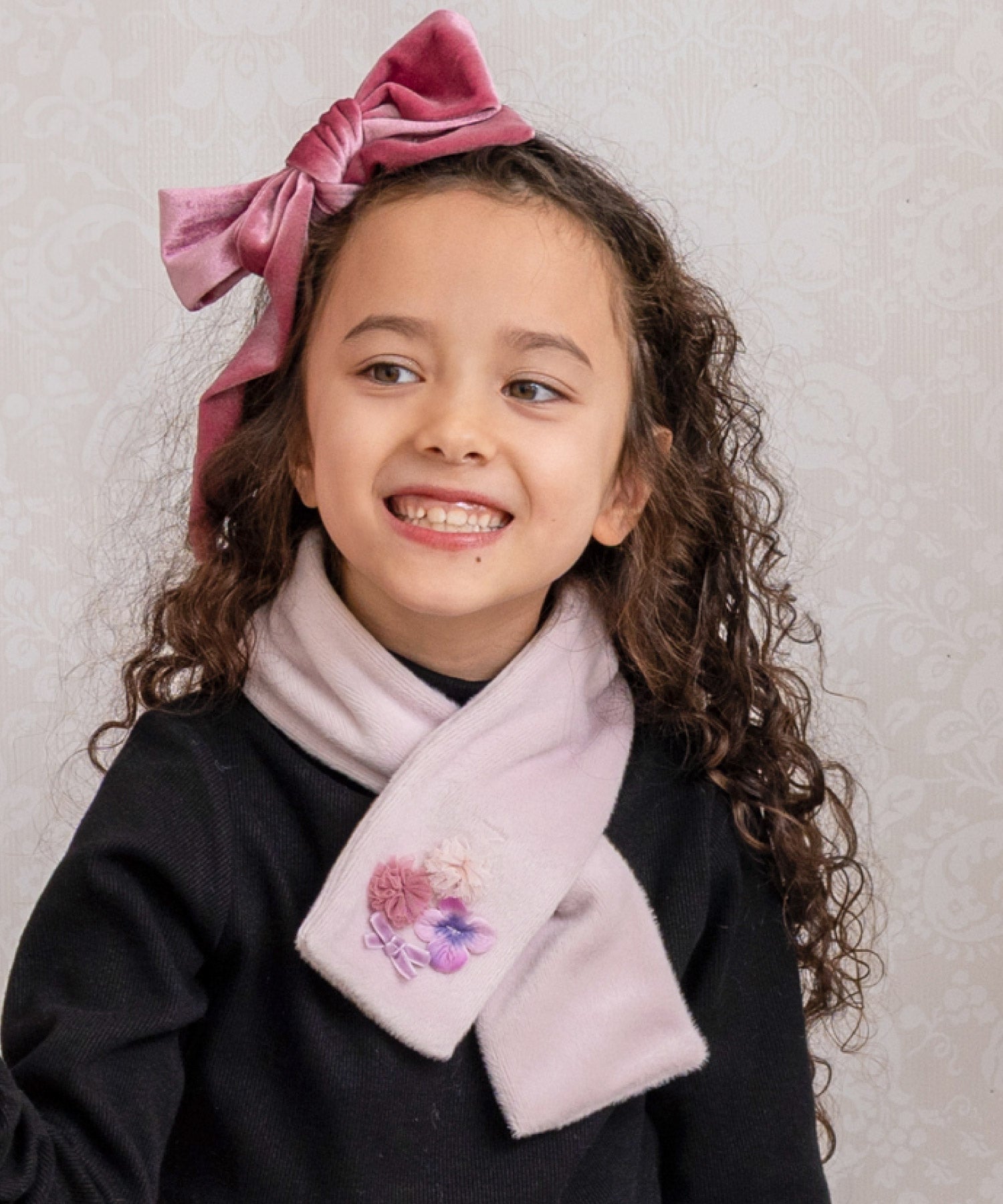 あったか冬の必須アイテムのマフラー。もこもこのマフラーに花とリボンをちりばめました。異なる2色のチュールポンポンもついてさらにキュートに。フリース素材なのであたたかく、お子様でも扱いやすい素材です。マフラーを差し込むベルトがついているので元気に動き回ってもはずれにくく暖かさをキープしてくれます。