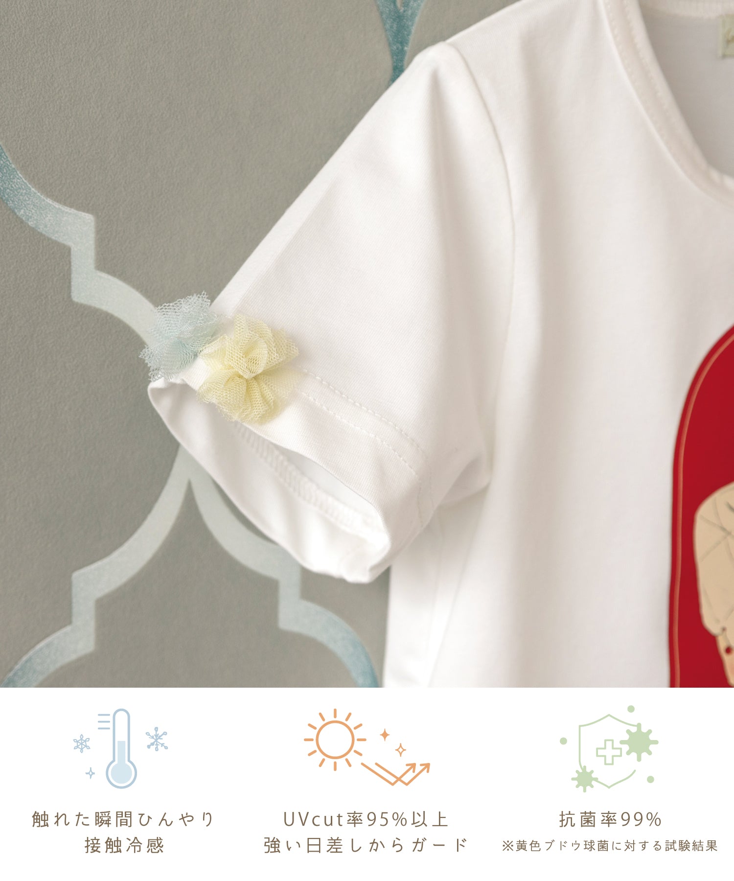 かわいいのはもちろん、着るだけでで紫外線対策ができるUVcut素材。伸縮性のあるカットソー生地で、快適な着心地。
