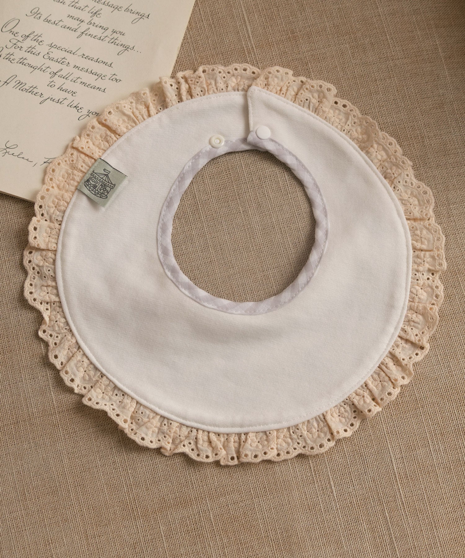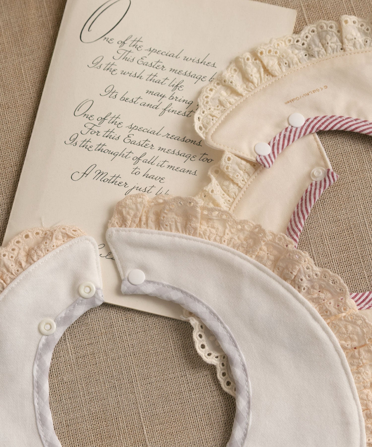 赤ちゃんが動いてビブがぐるぐる回っても、360度可愛く使えます。お食事の時だけではなく、コーディネートのワンポイントに。