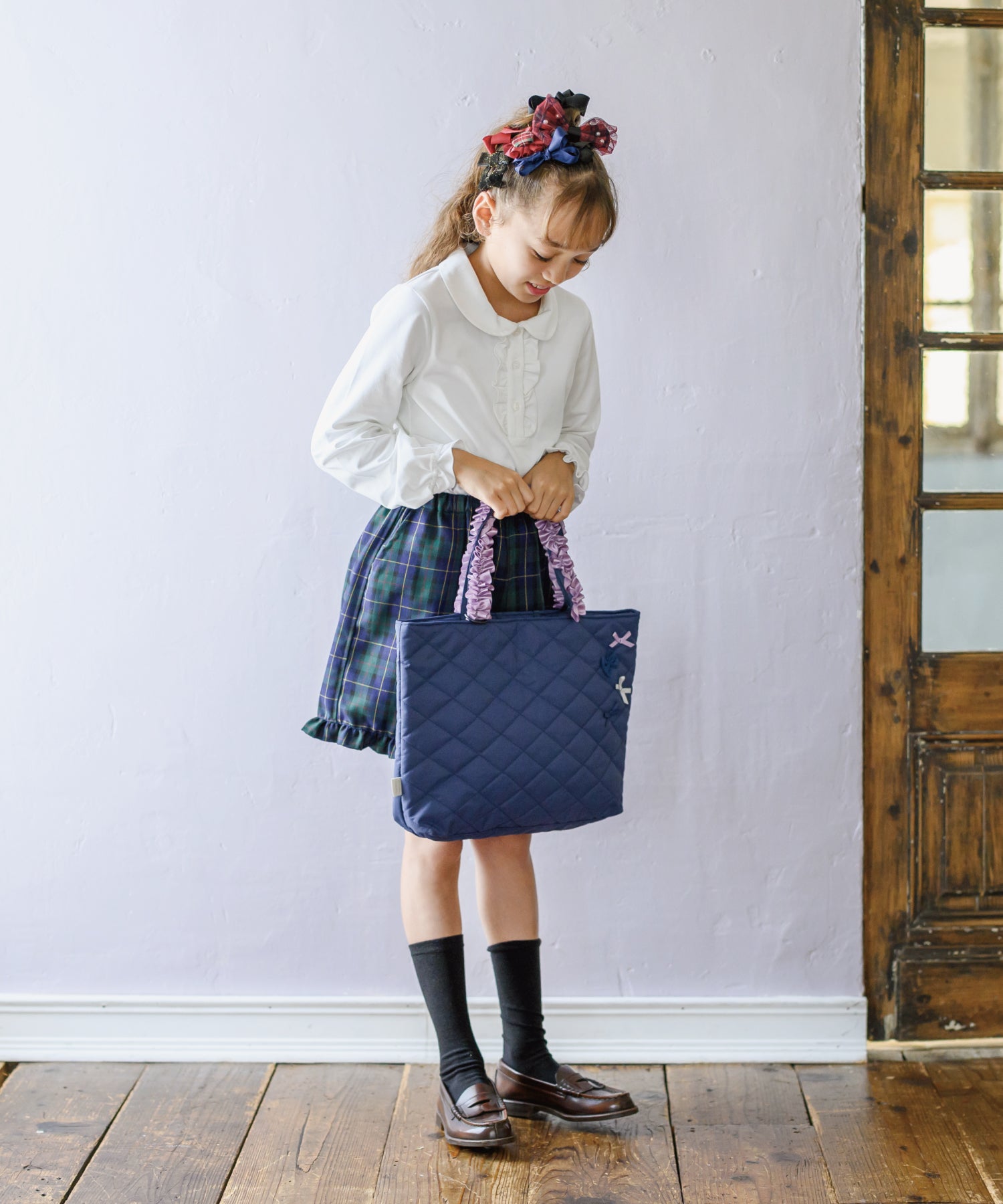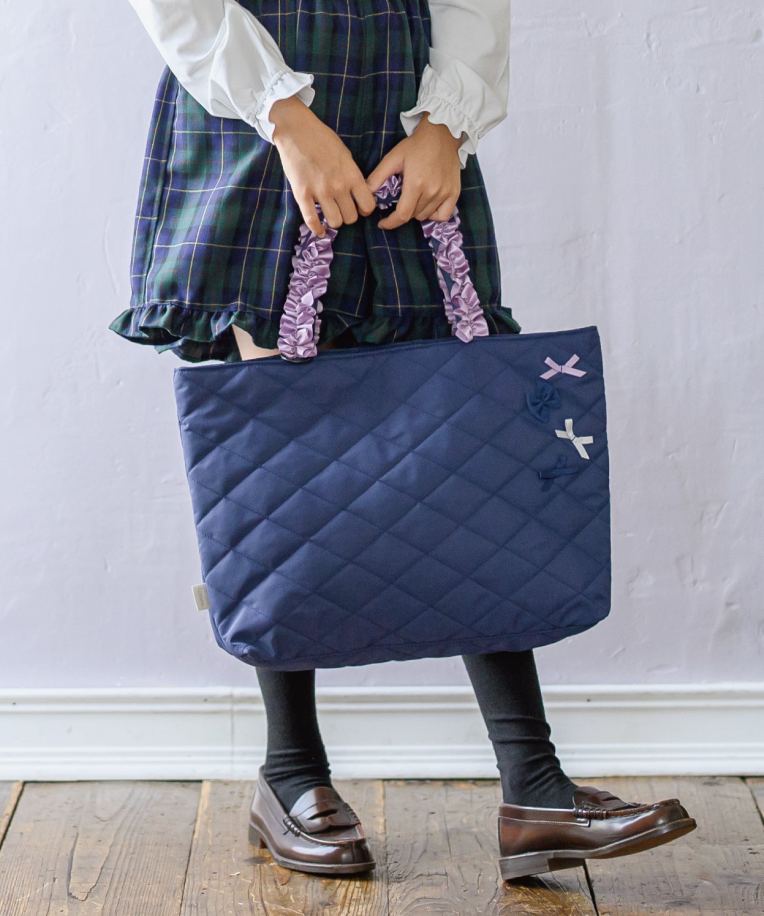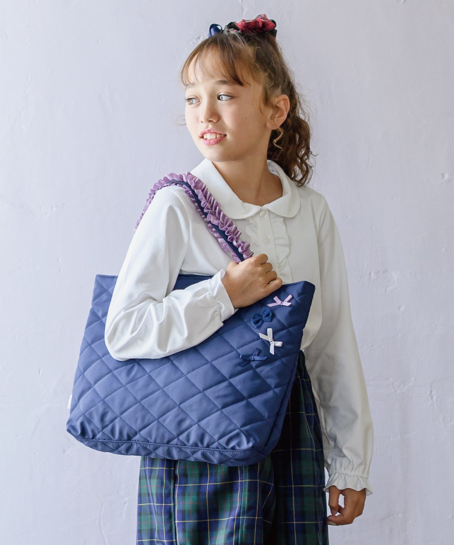 ベースはマットキルト素材。持ち手のボリュームのあるサテンフリルが高級感あふれるデザイン。内側は全て撥水素材でデイリーユースにも安心。全てネームタグつき。