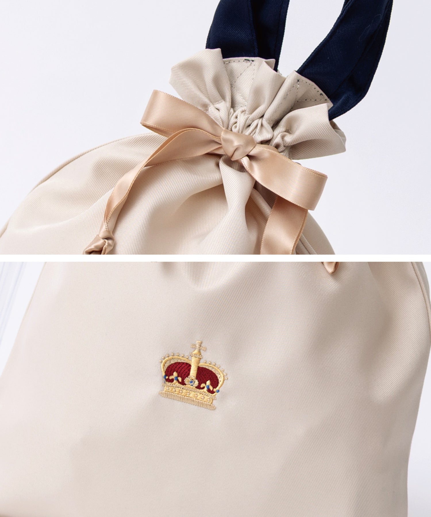 光沢のあるサテン調生地にクラウン刺繍が上品な巾着トート。
