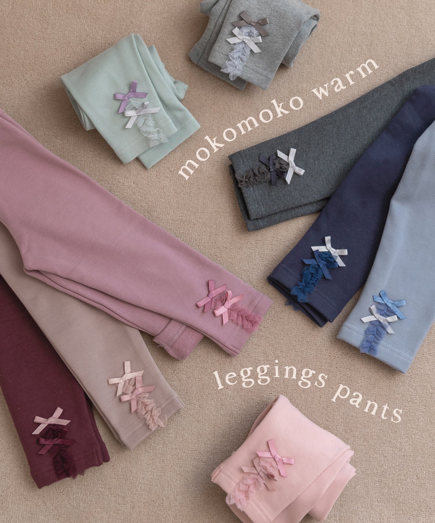 パンツの裏側は裏起毛でさらにあったか。後ろの足もとのチュール& リボンでバックスタイルもキュートに演出。全体をワントーンで仕上げているので合わせやすい。ややゆったりめのシルエットに、股上は深めでインナーをウエストインして冷え対策もばっちり。ウエストゴムで履きやすく、伸縮性も良いので寒い時期のお外遊びやお散歩にヘビロテしそう。