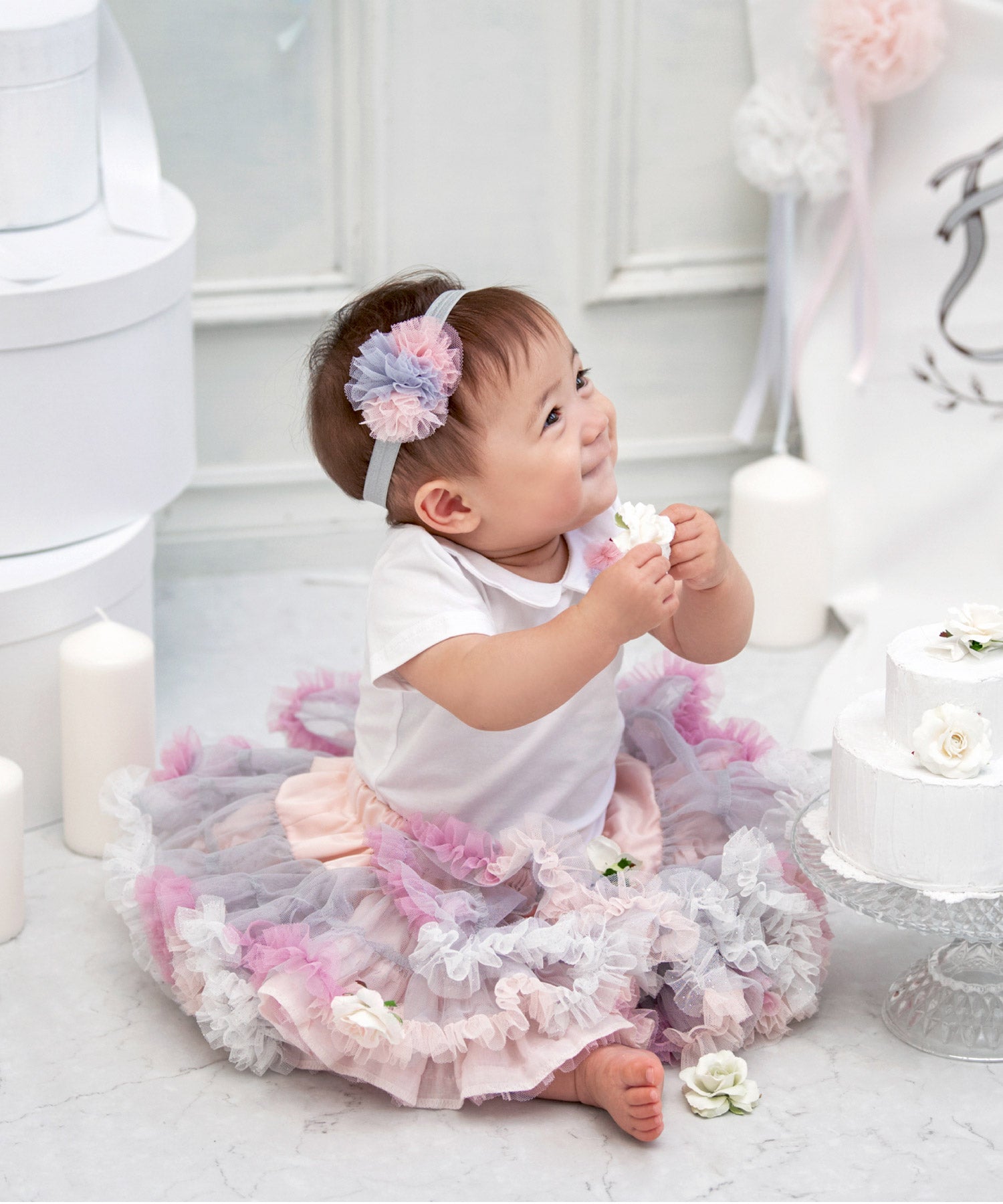 ふんわり優しいピンクに、グレーとホワイトチュール。