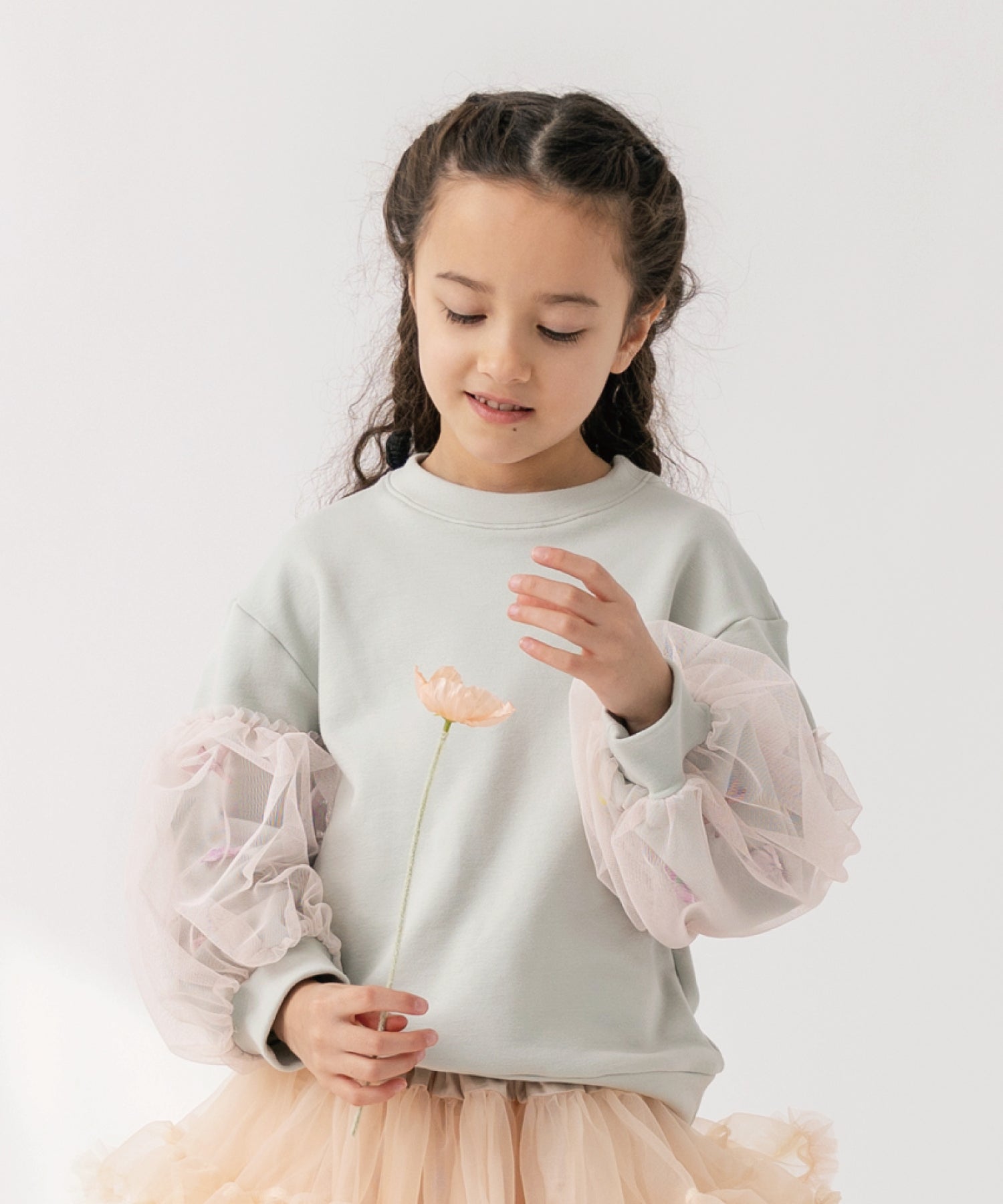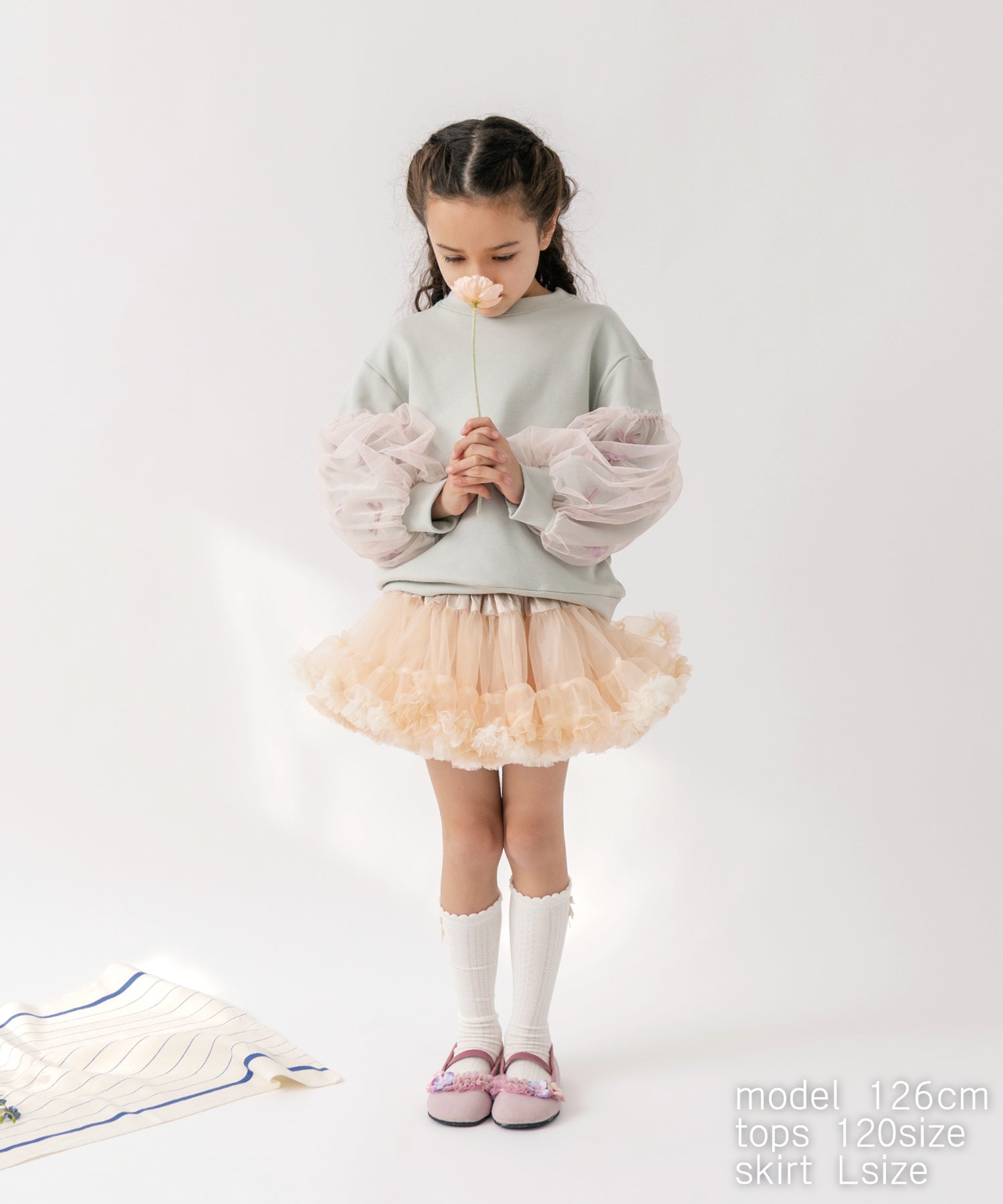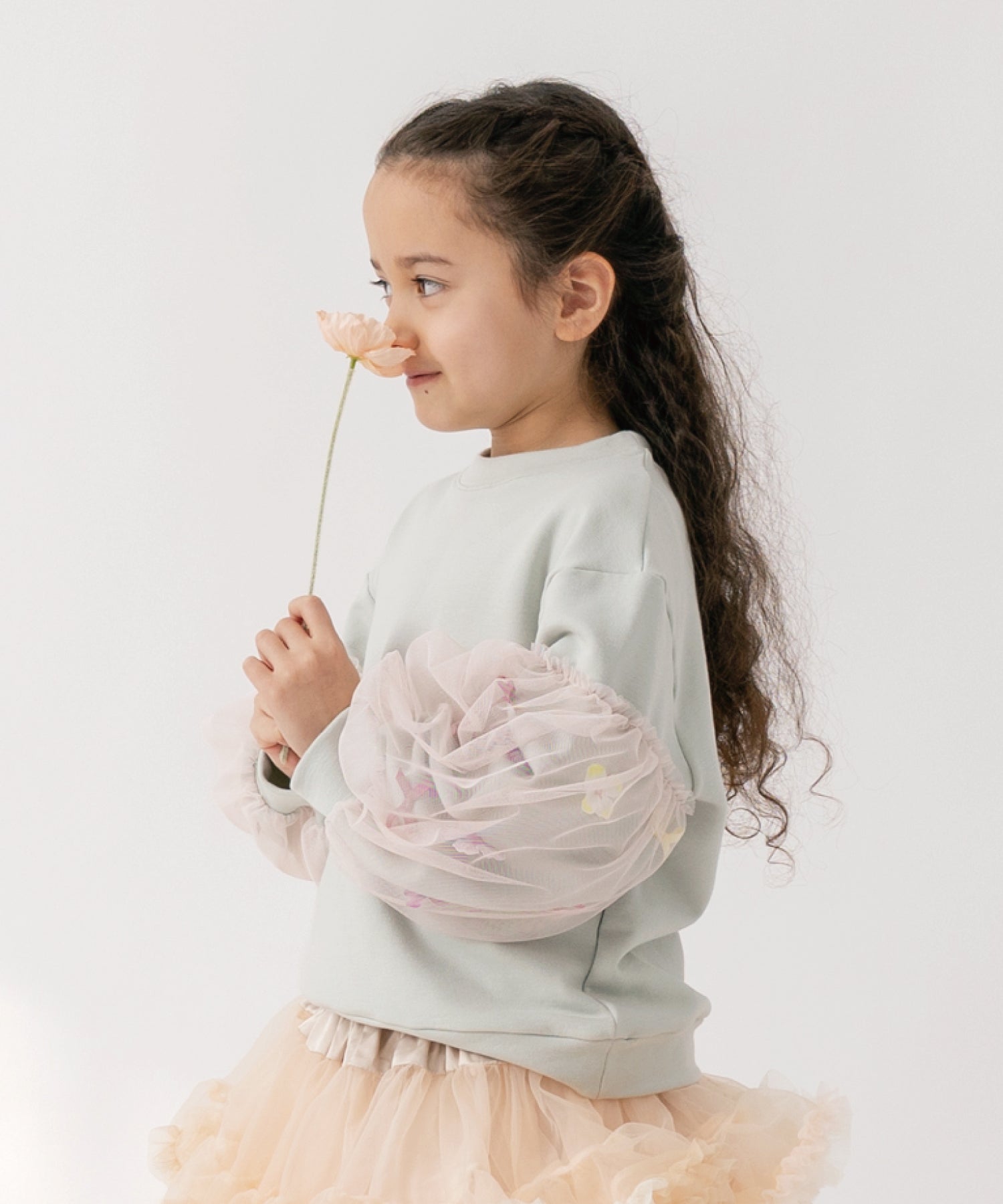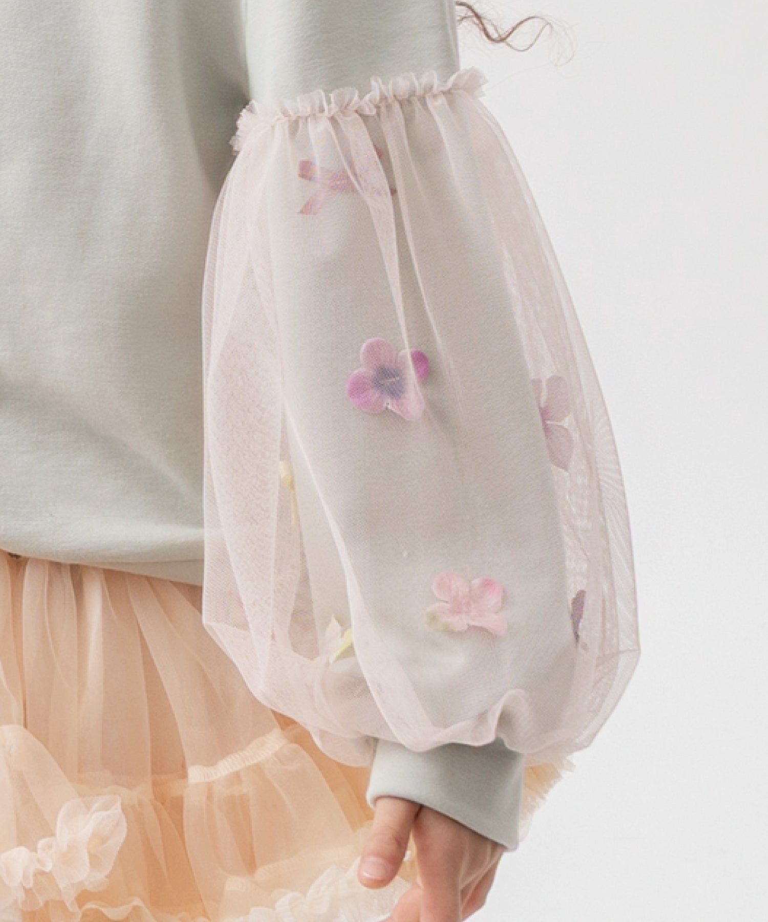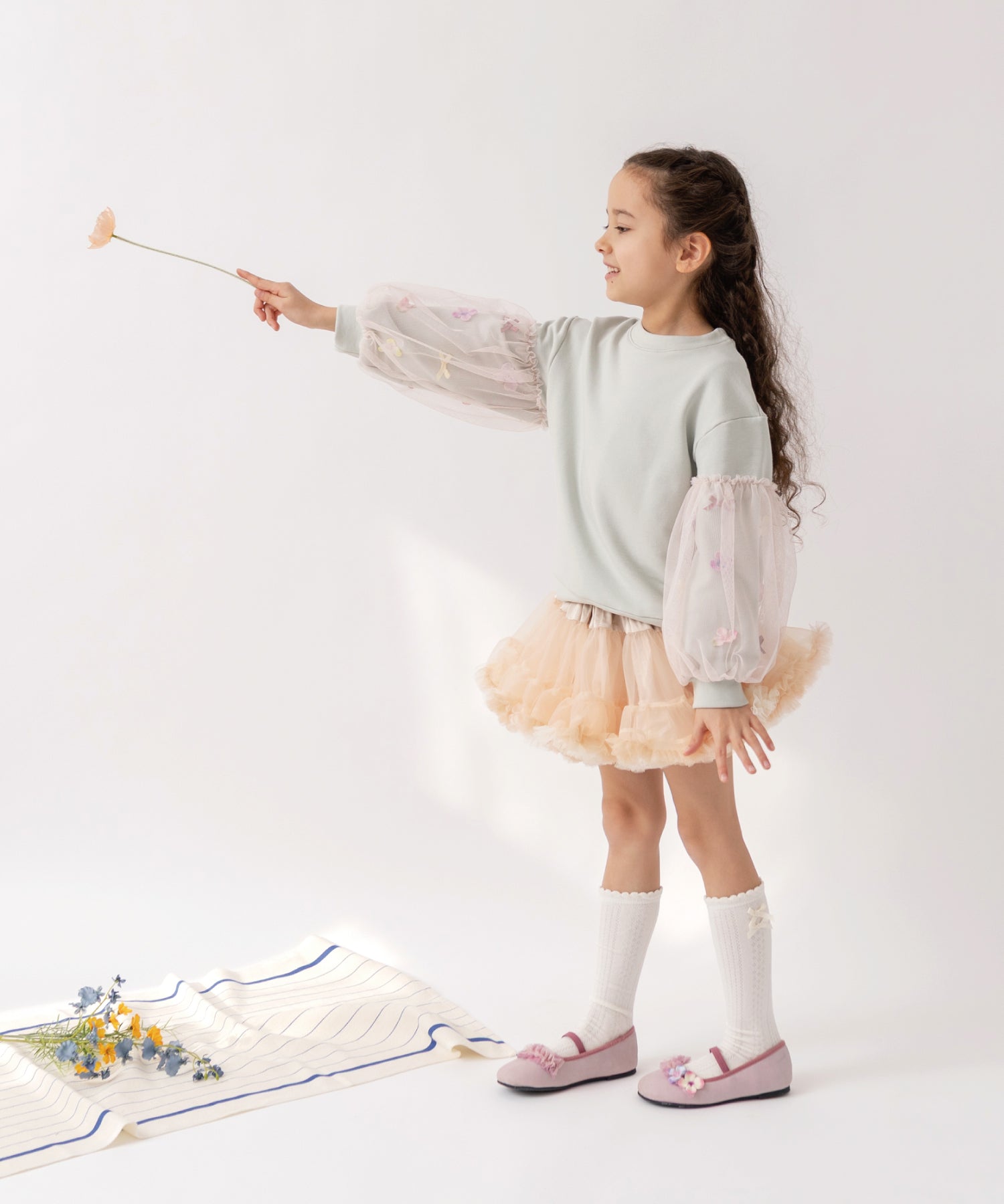 お袖いっぱいに咲くお花とリボンを、ふんわりチュールでやさしく包み込みました。