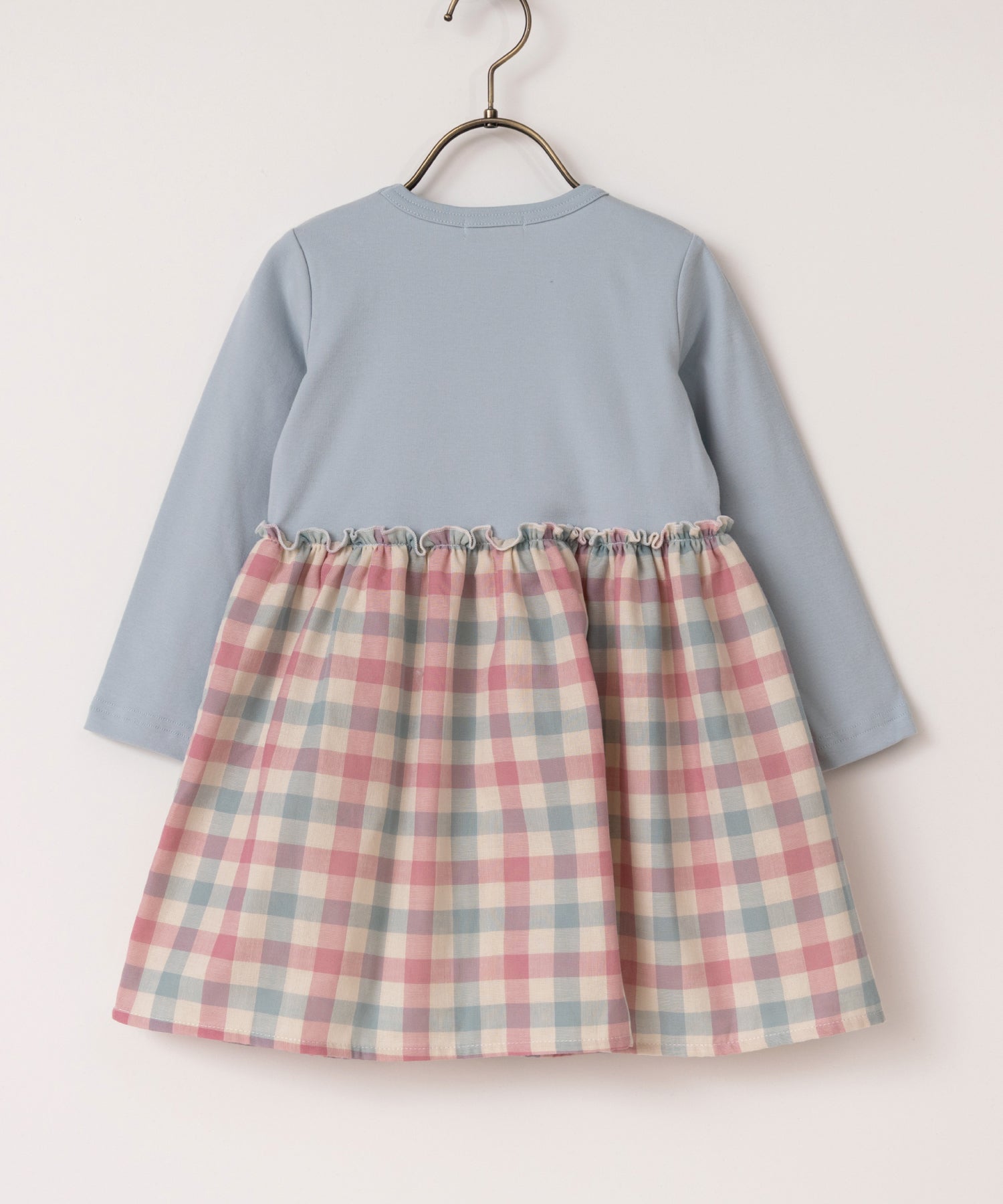 スカートは優しい肌触りのコットンダブルガーゼ。トップスはストレッチのあるカットソー素材で着心地抜群。両肩にトッピングしたピンクのリボンがポイント。