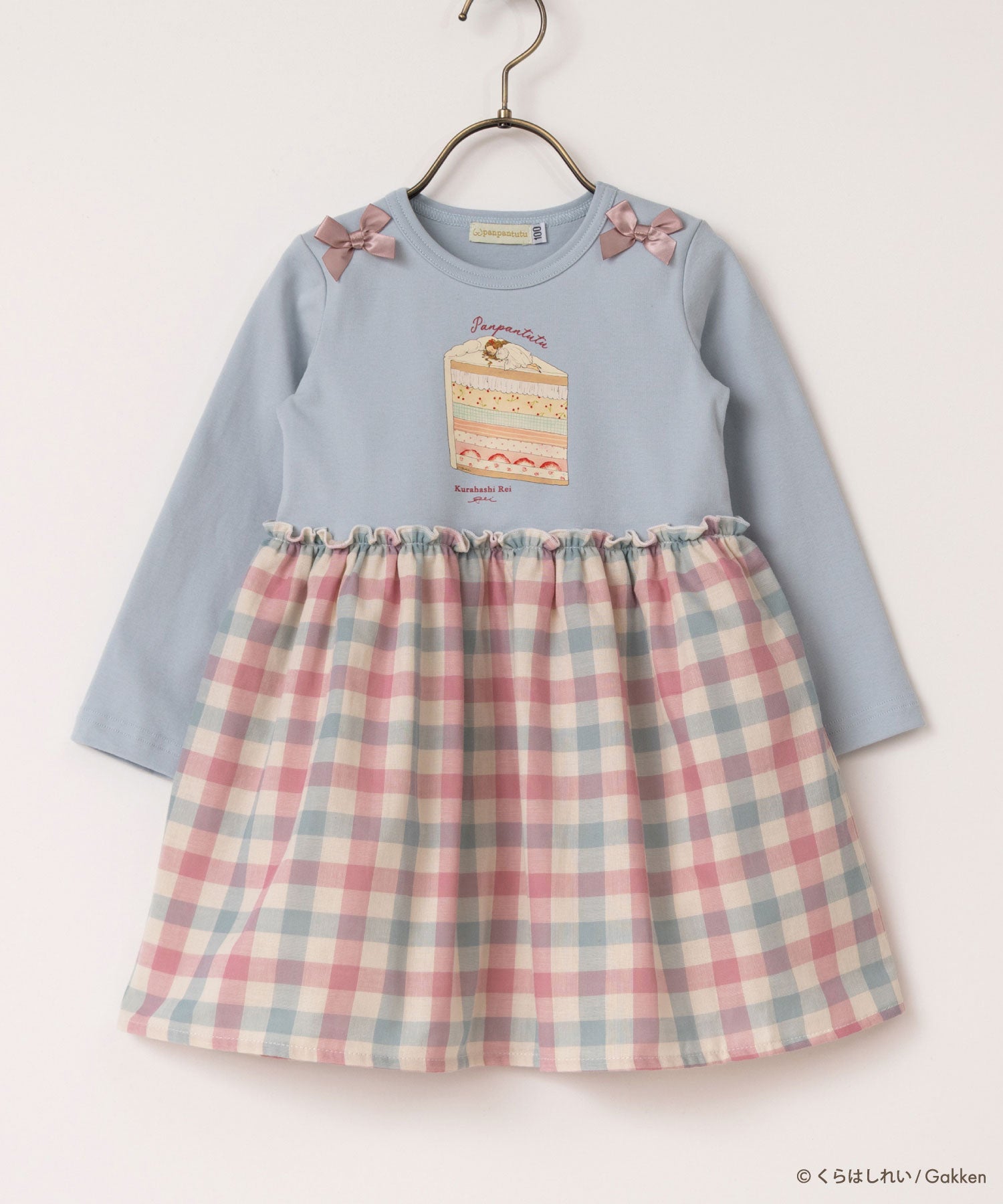 甘いケーキのベッドの上ですやすや...夢を見る女の子と、スカートのチェック柄がどこかレトロなデザイン。