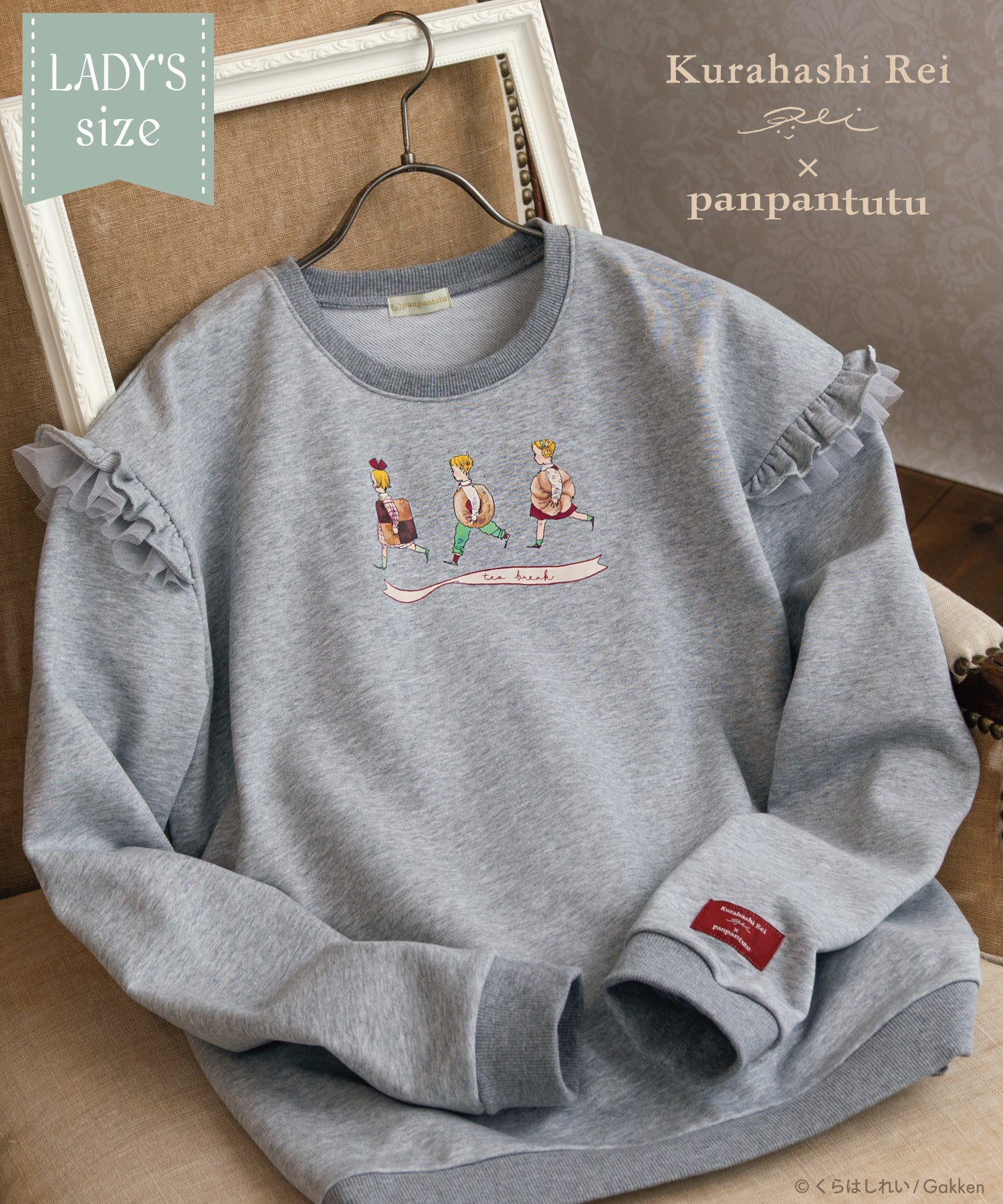 ほどよい厚みのスウェット素材でデイリーに使いやすく、着心地抜群。ゆったりとしたサイズ感。両肩のWフリルと左袖のコラボタグがアクセント。