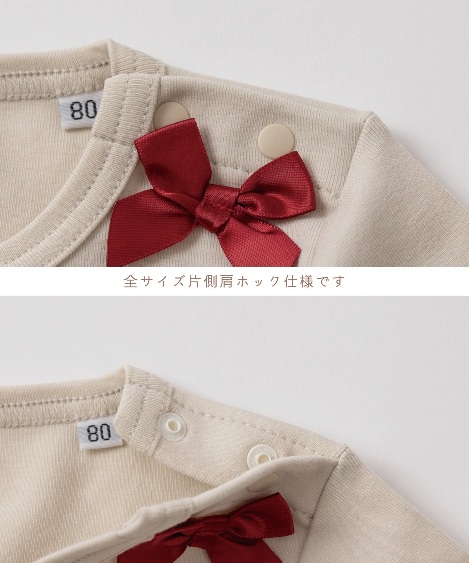 スカートは優しい肌触りのコットンダブルガーゼ。トップスはストレッチのあるカットソー素材で着心地抜群。両肩にトッピングした赤いリボンがポイント。1枚でコーディネートが完成するロンパースワンピはデイリーに大活躍!