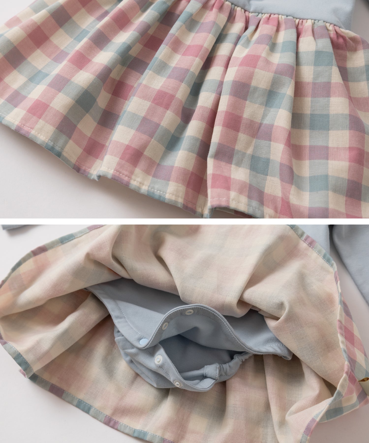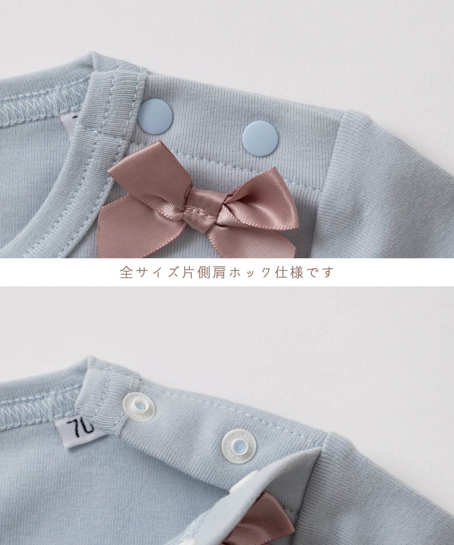 スカートは優しい着心地のコットンダブルガーゼ。 トップスはストレッチのあるカットソー素材で着心地抜群。 両肩にトッピングしたピンクのリボンがポイント。1枚でコーディネートが完成するロンパースワンピはデイリーに大活躍!