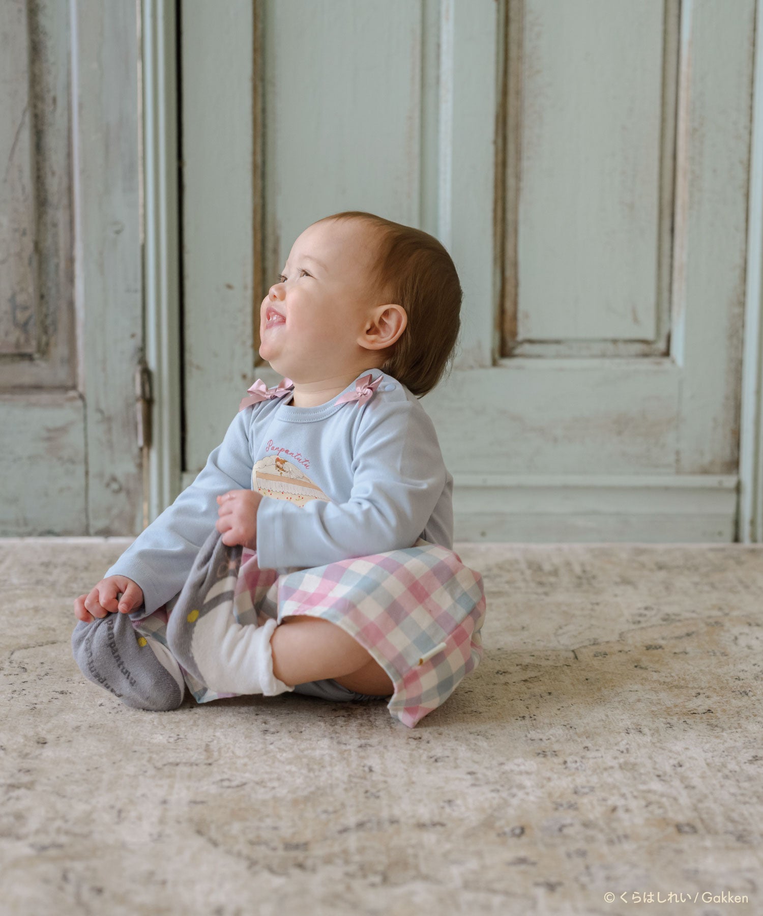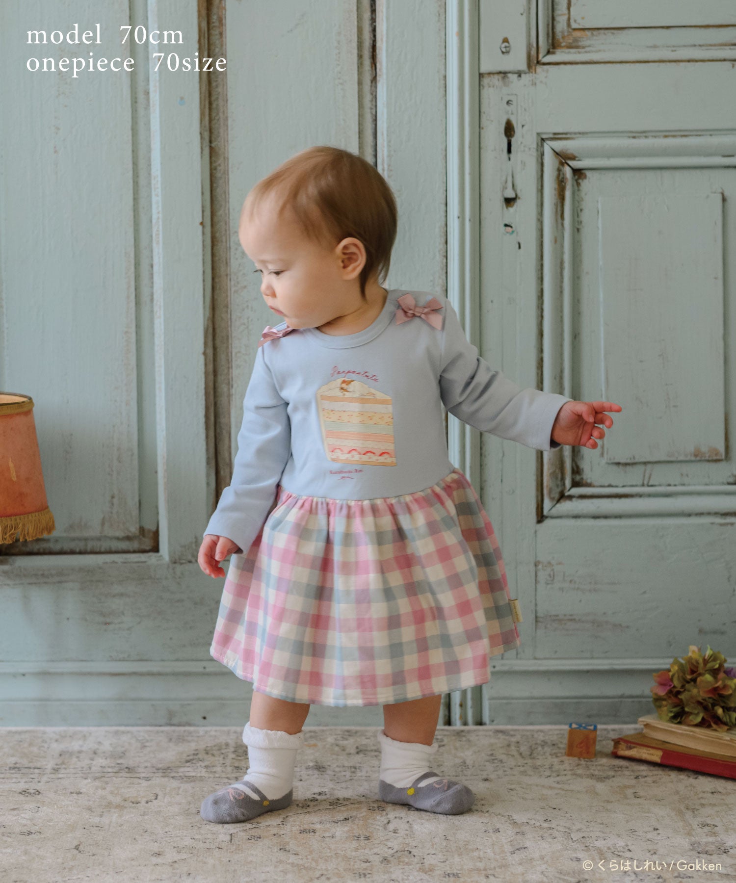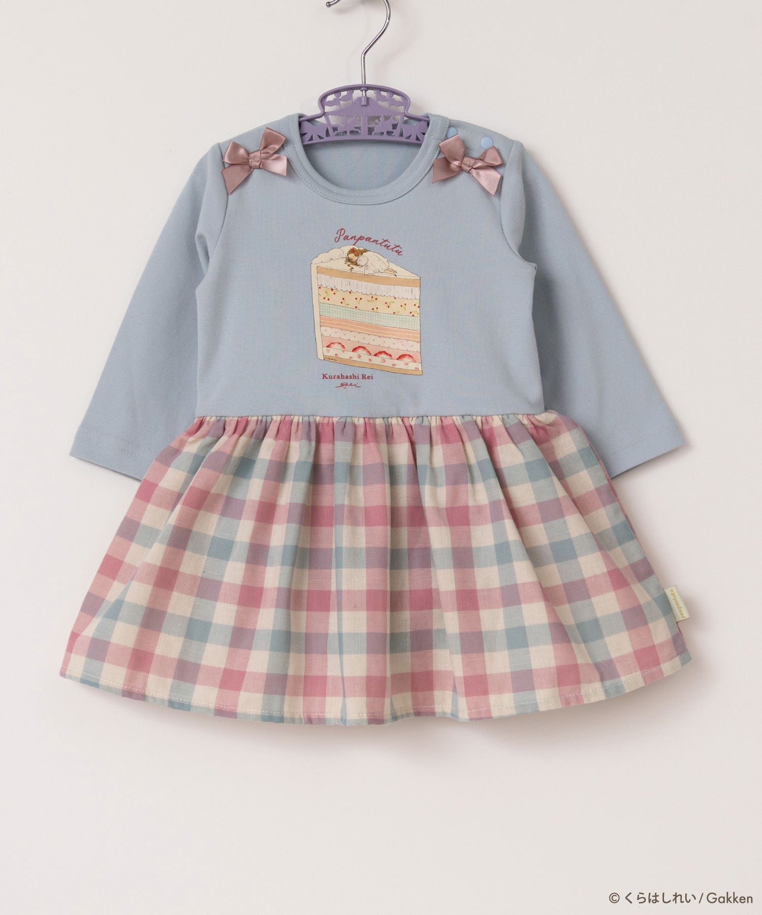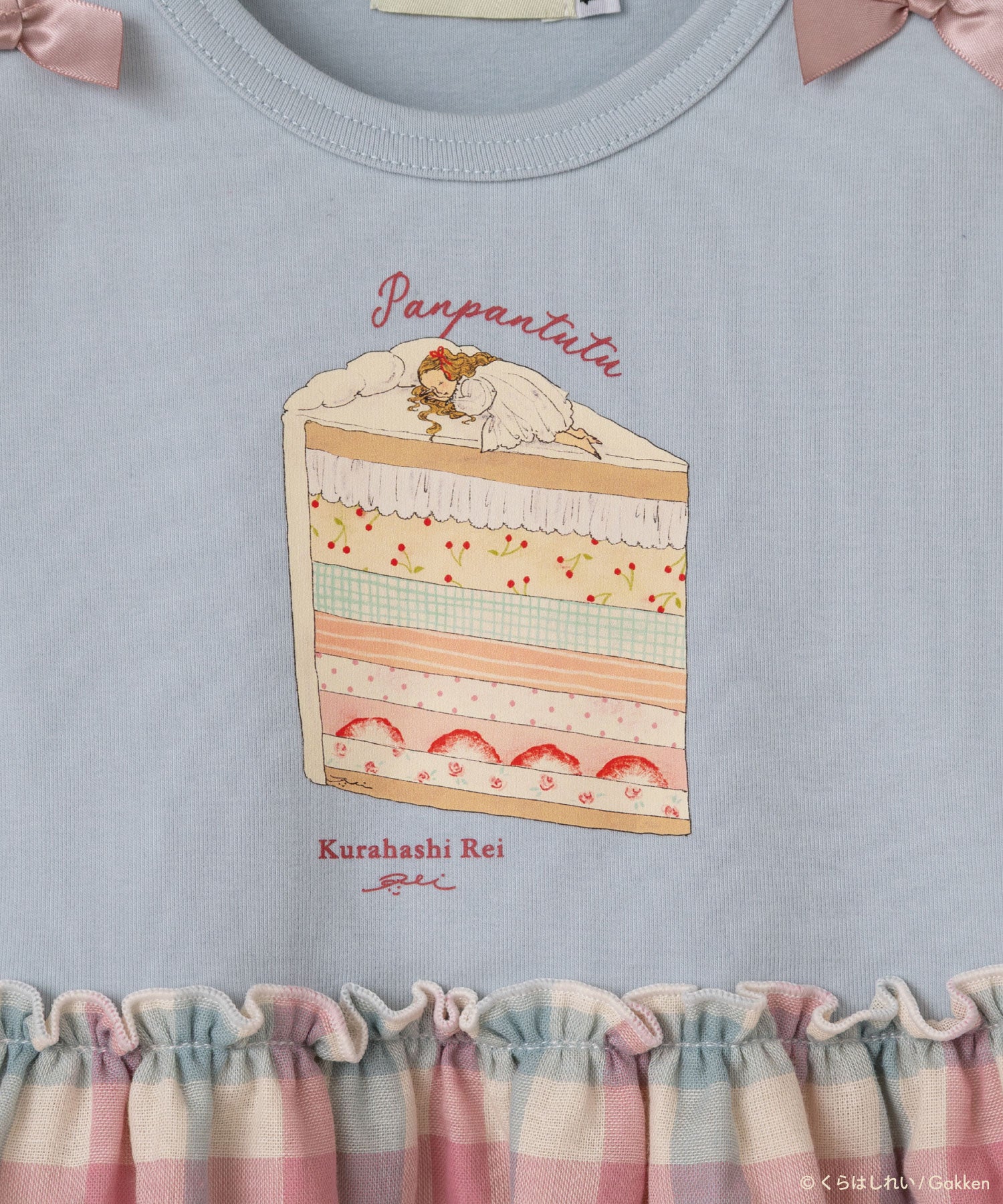 甘いケーキのベッドの上ですやすや...夢見る女の子と、スカートのチェック柄がどこかレトロなデザイン。