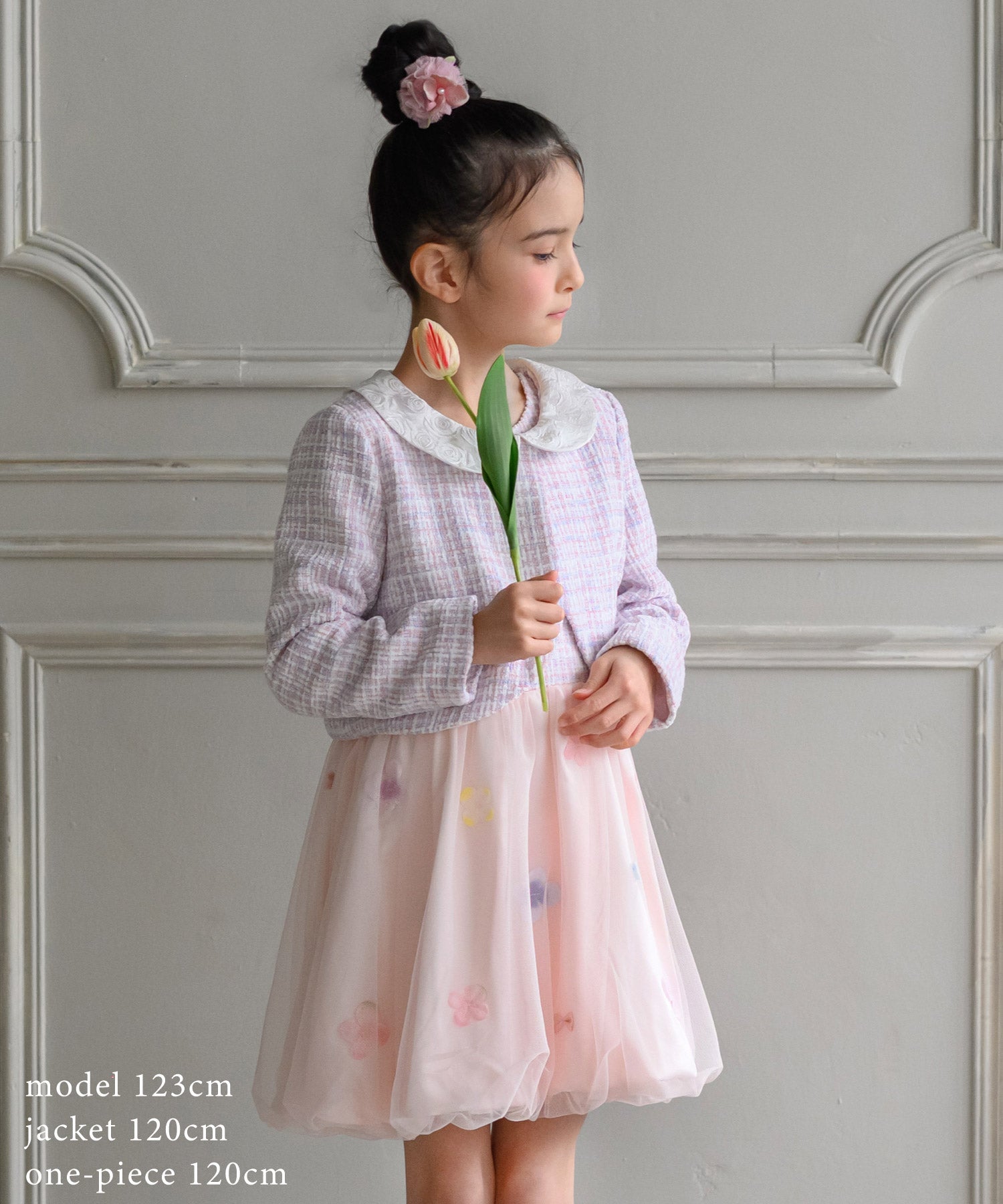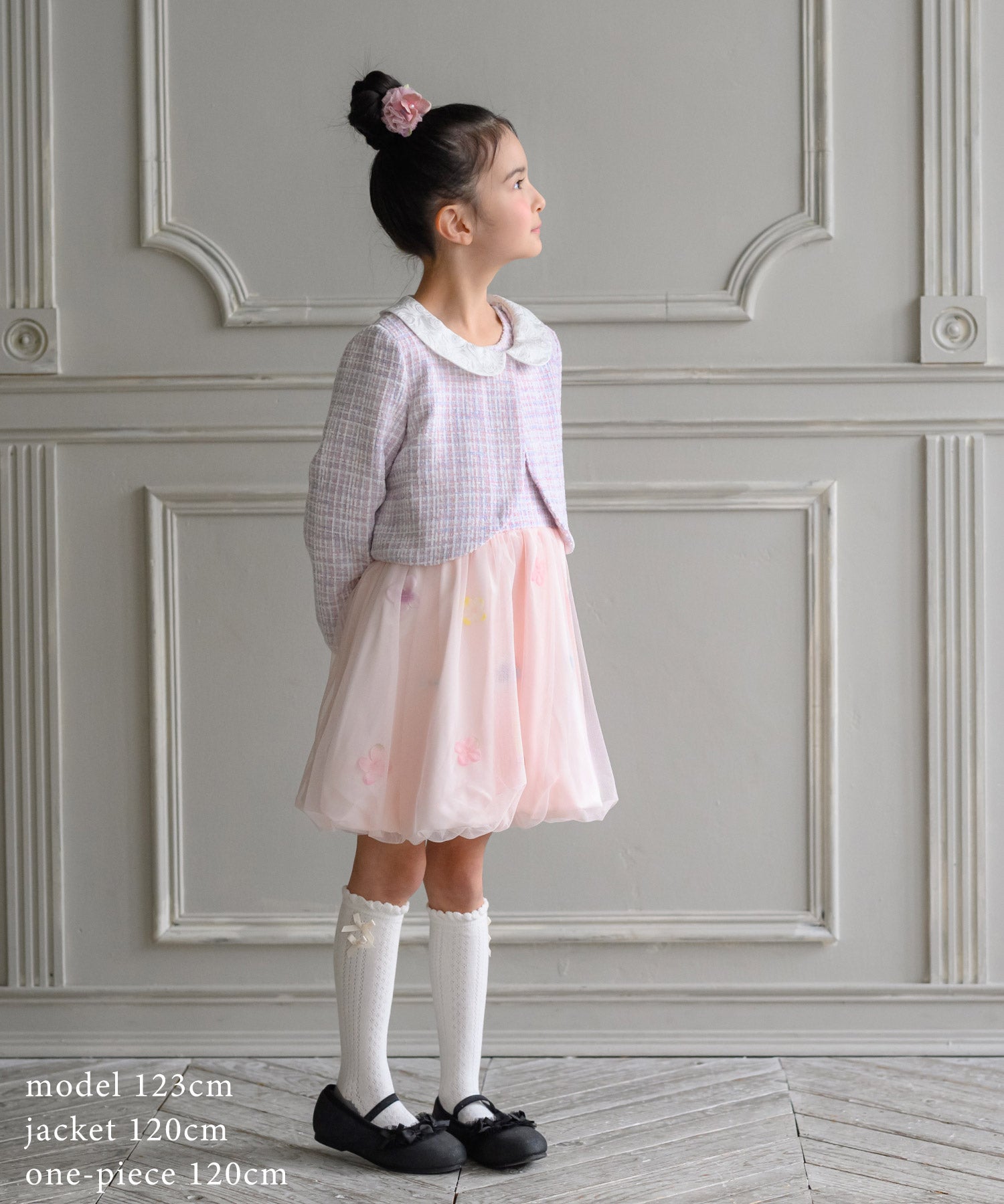 本物みたいな花びら&リボンを、ひとつひとつ丁寧に縫い付けて、ふんわりチュールで包みこみました。身頃はピンク・白・水色の立体感のある織りが上品なツイード素材。ノースリーブタイプなので1枚で着用はもちろん、ブラウスと合わせて普段のお出かけ着としても活躍します。後ろファスナー仕様。