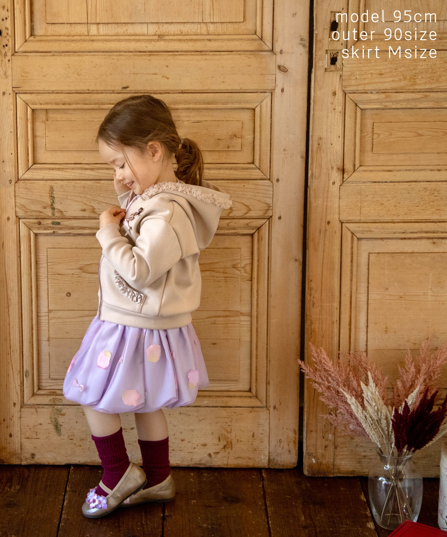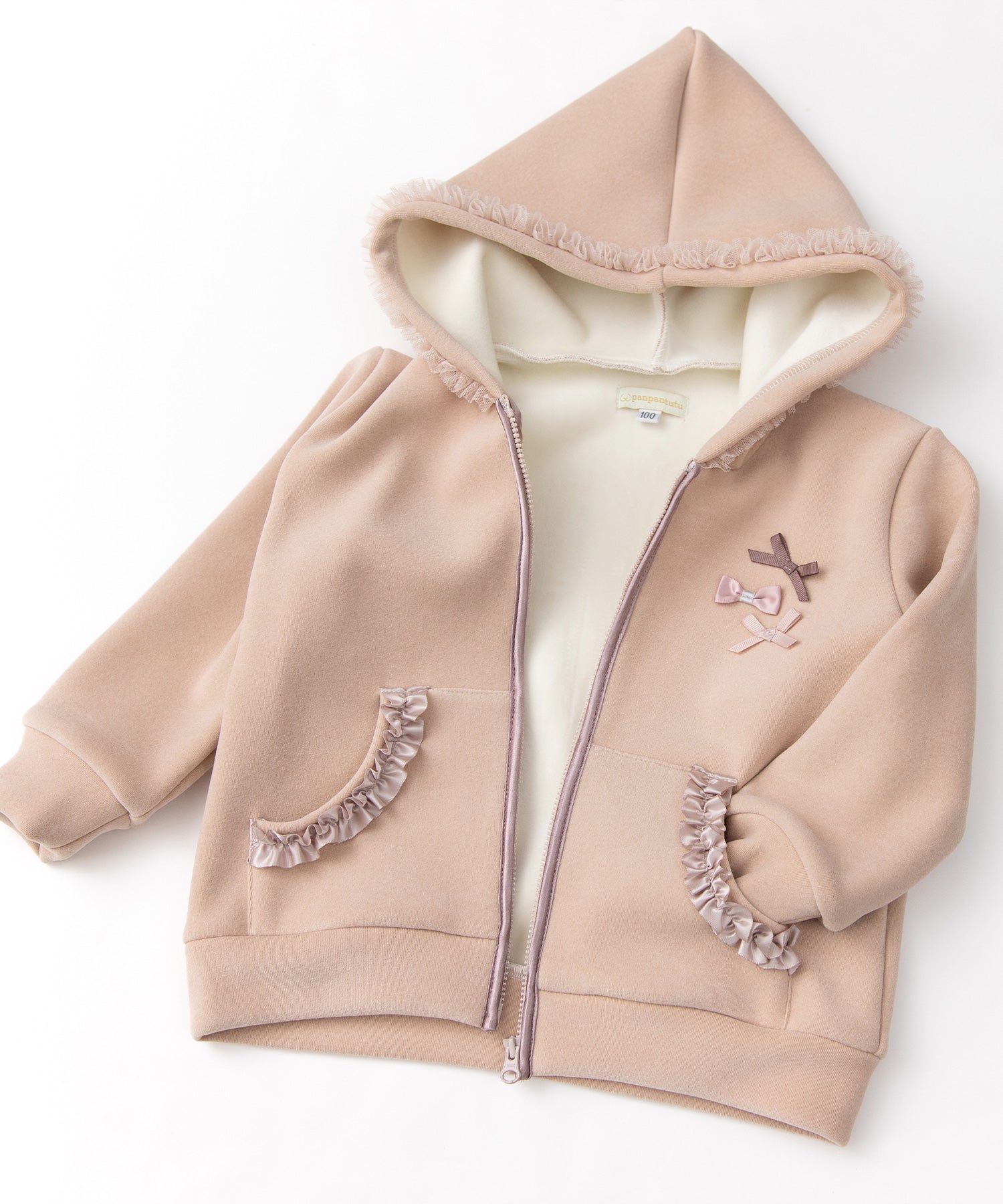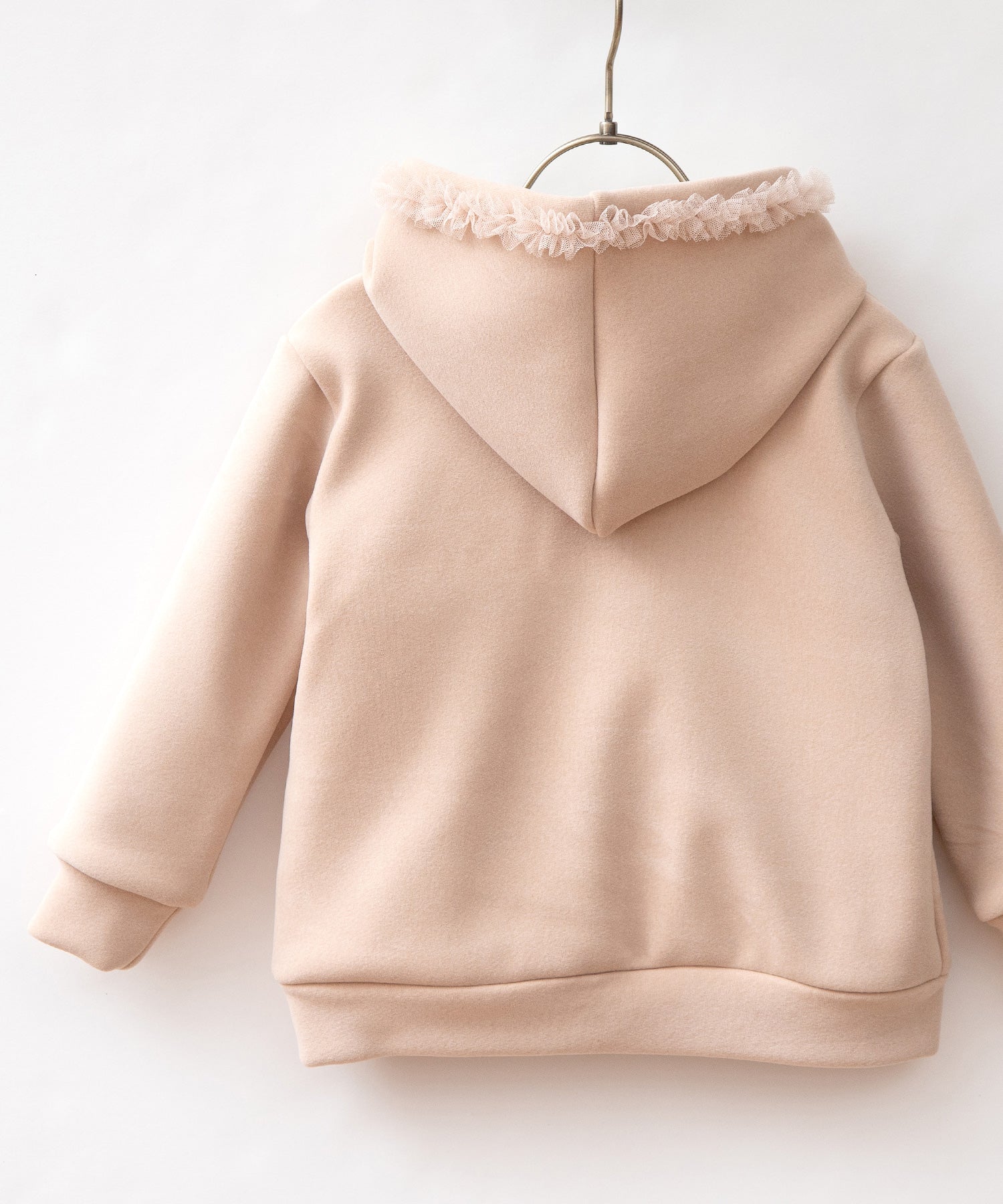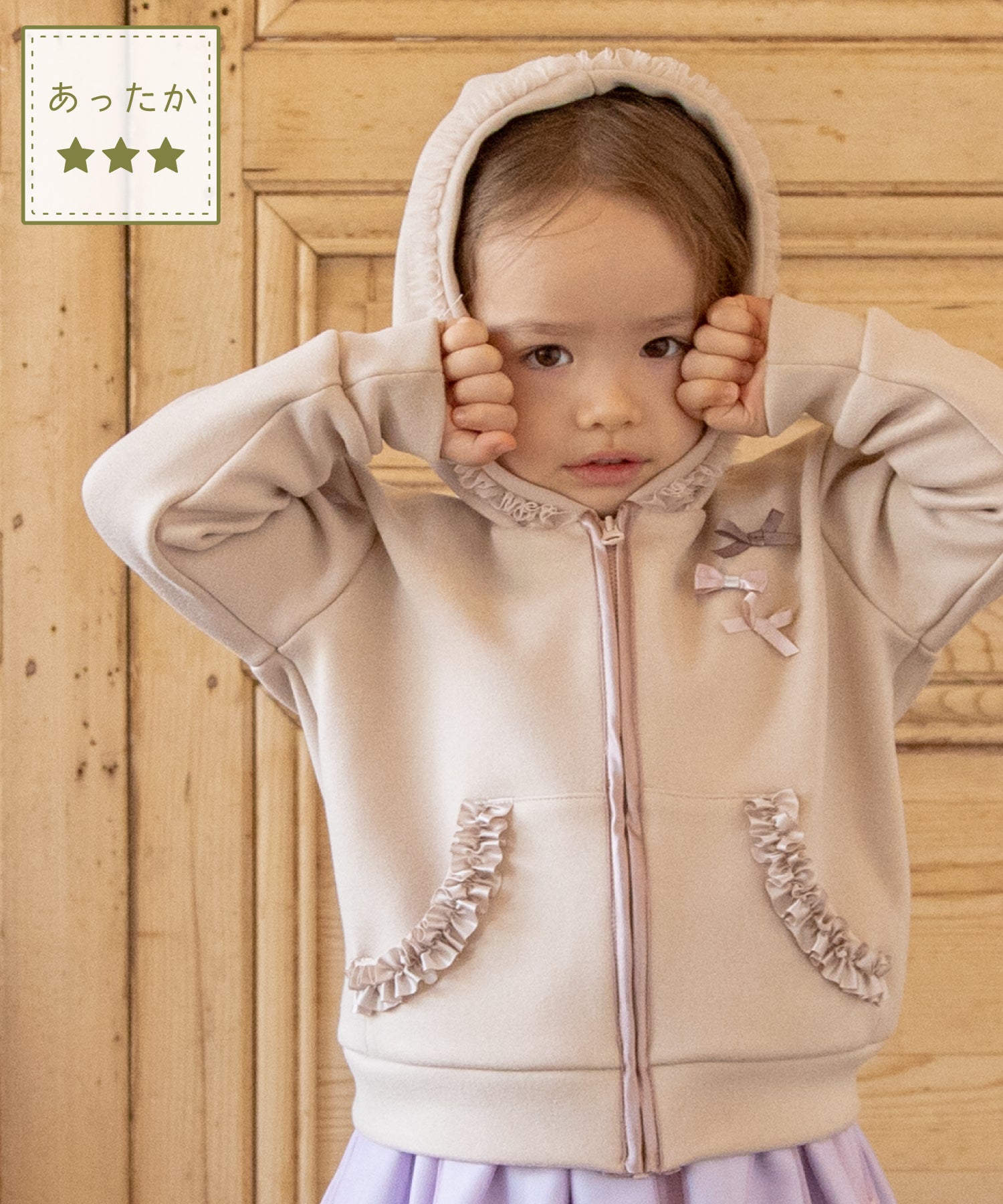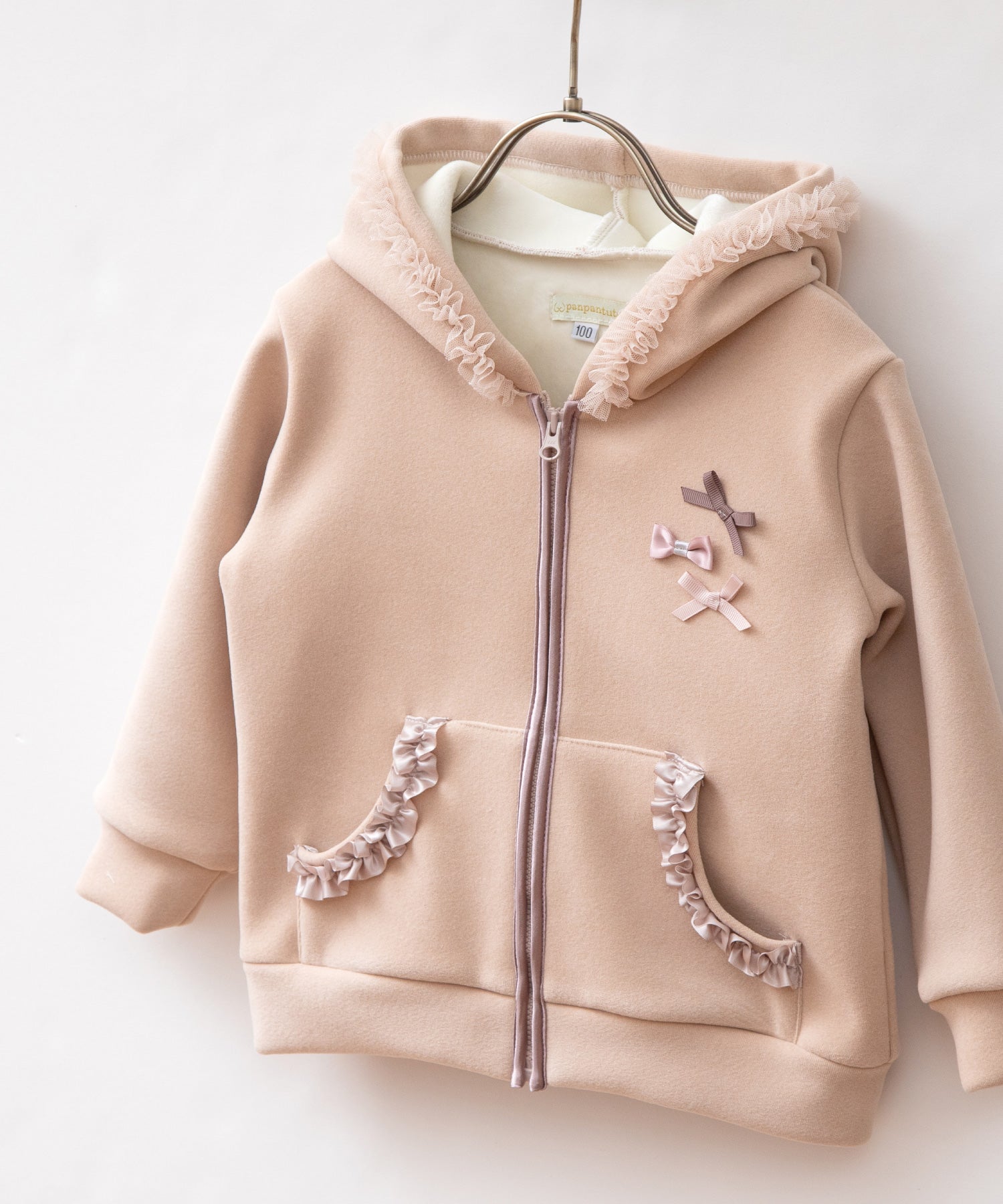 フードにはふわふわのチュールフリルをたっぷりと縁取り、かぶっても愛らしいシルエットに…前ポケットには光沢感のあるサテン生地のフリルをあしらいフレンチガーリーなスタイルを楽しめます。胸元にはプチリボンを3つ飾り付け、よりガーリーさをプラス。