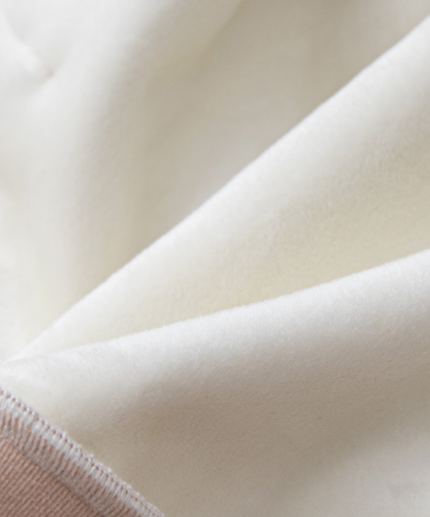 まるで絨毯のようなしっとりとした手触りと柔らかな素材感で、ほっこり温かくふんわりとした着心地です。ベースはのびのびと動きやすいスウェット生地。裏起毛仕様でさらに生地の厚みが増し、ちょっとしたお出かけやお外遊びのときに、アウター代わりとしてもおすすめ。