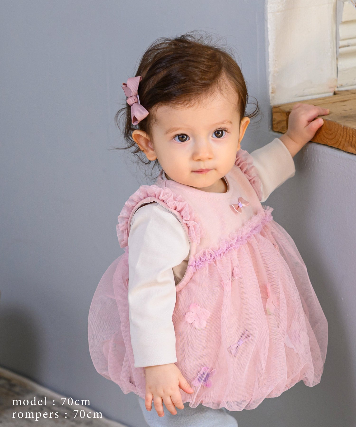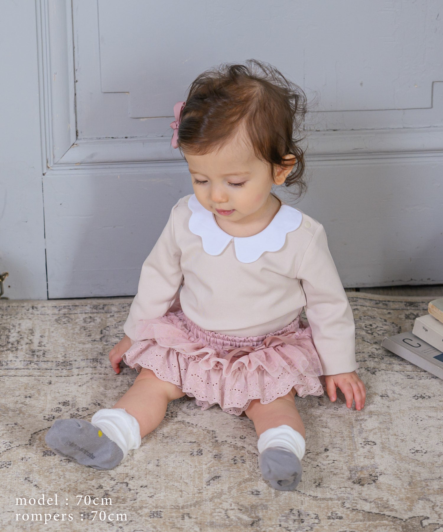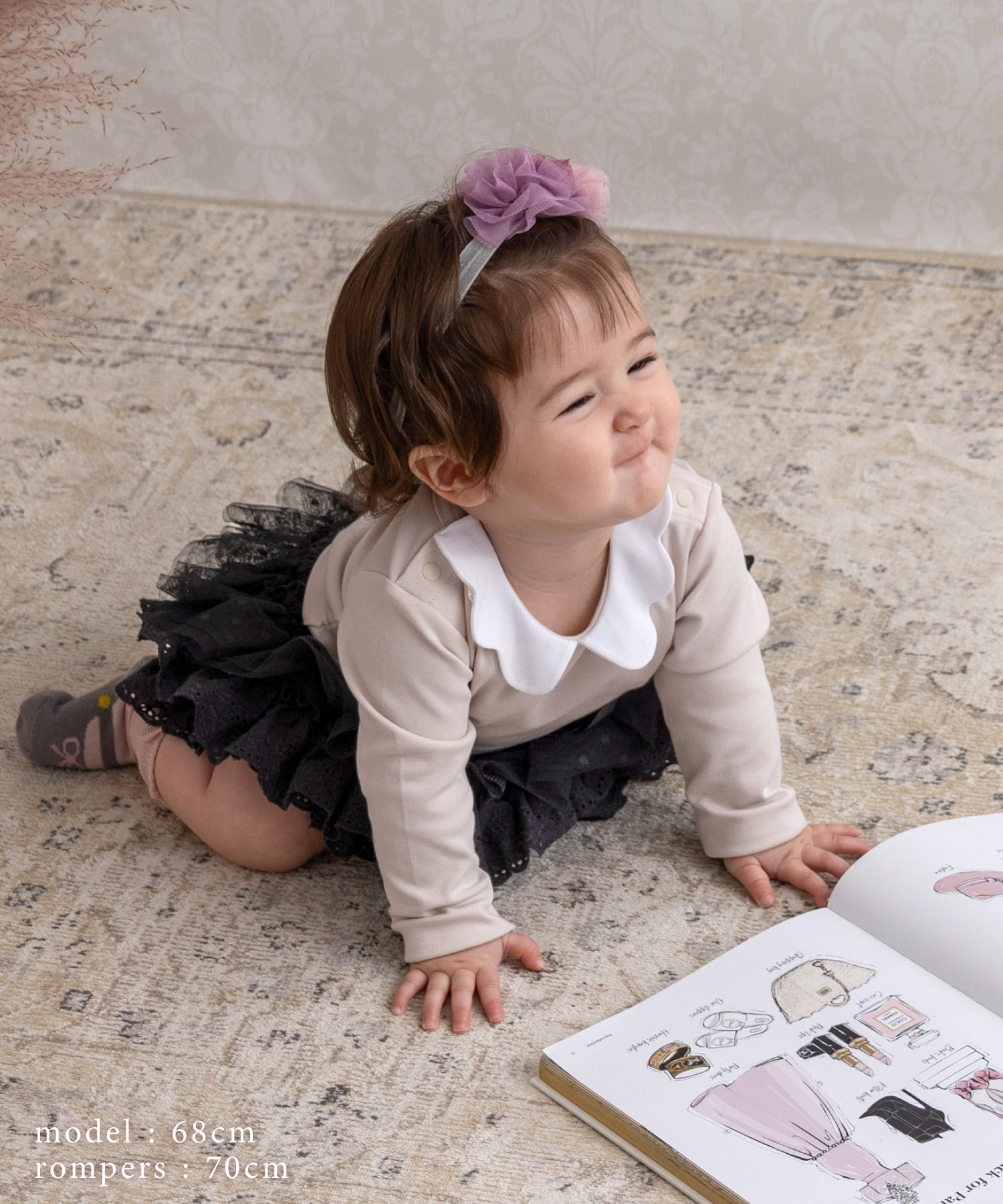 無地ベースの長袖ロンパースは着回し抜群!ブルマやチュチュと合わせてキュートなおすましベビーコーデに。