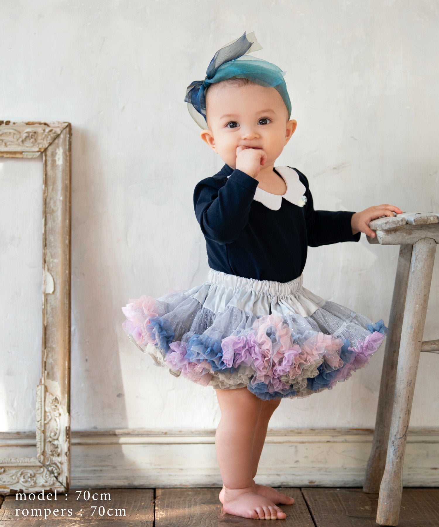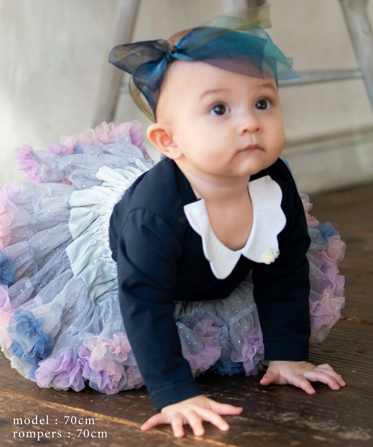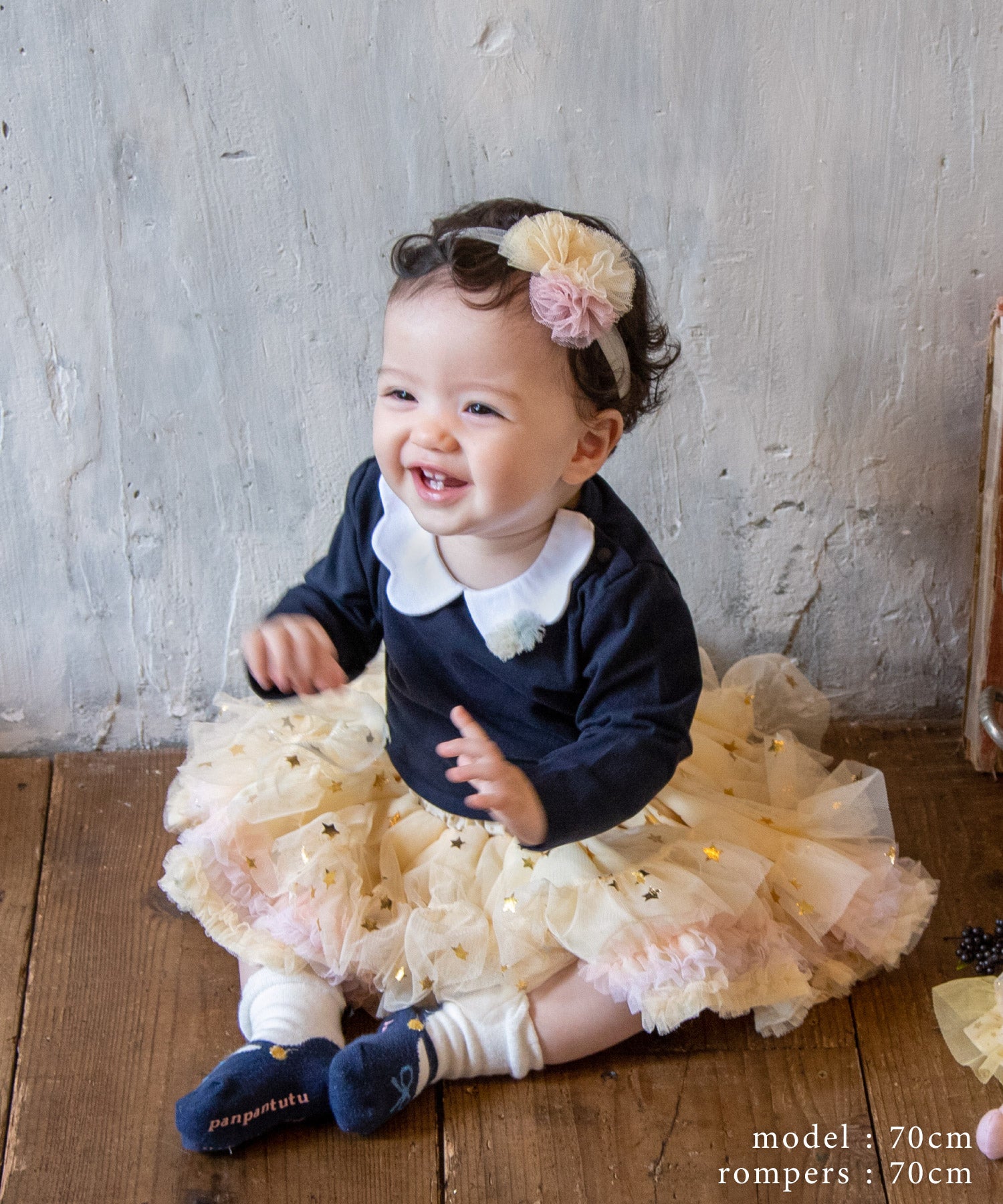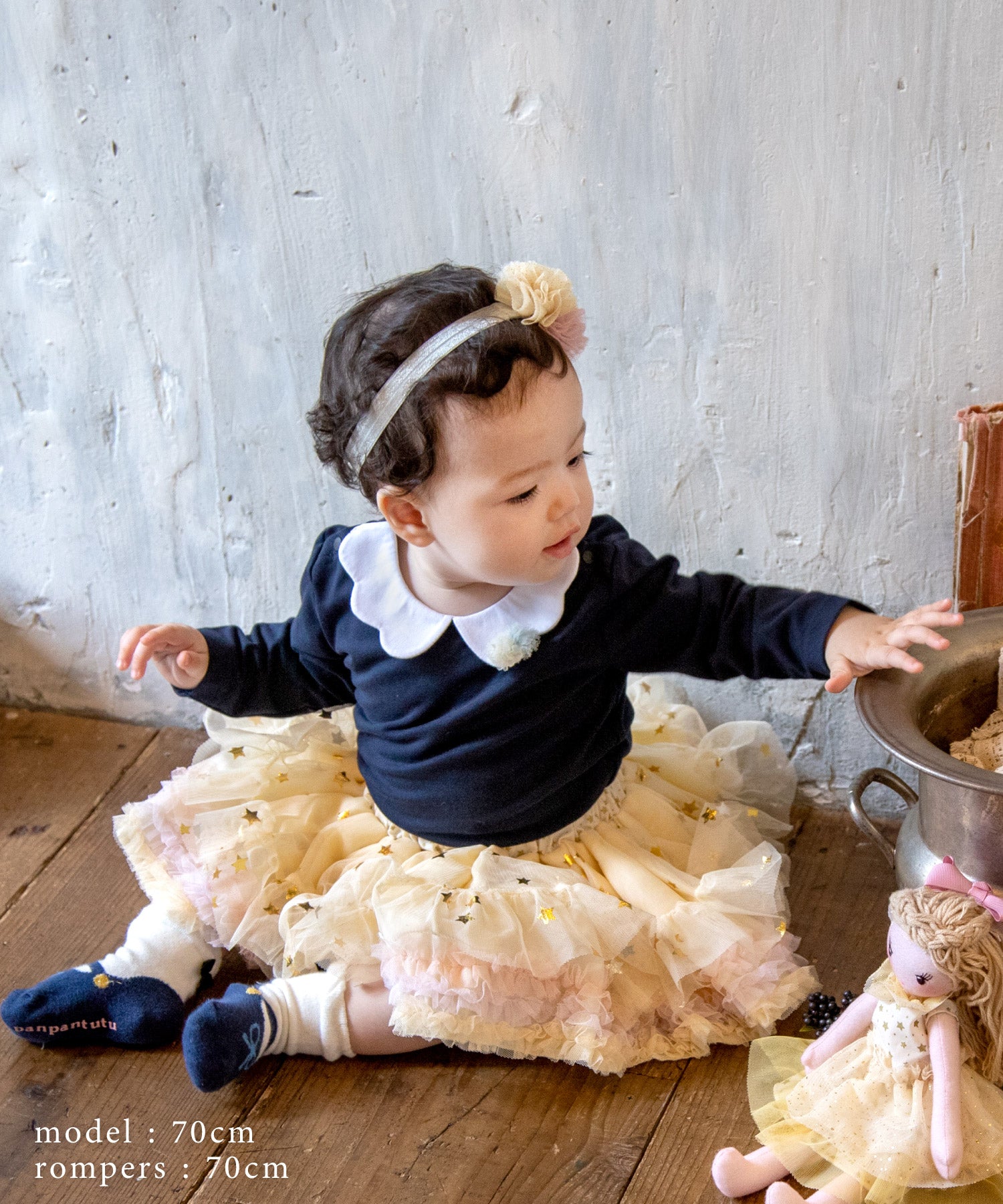 シックなネイビーに、天使の羽のような襟付き。チュールポンポンがアクセント。通年着用できるストレッチ素材で快適に過ごせます。肩と股部分はホック仕様でお着替えも簡単。無地ベースだから着回し抜群。ブルマやチュチュと合わせて、キュートに着こなせます。同シリーズの長袖トップスとあわせて姉妹コーデもおすすめ。