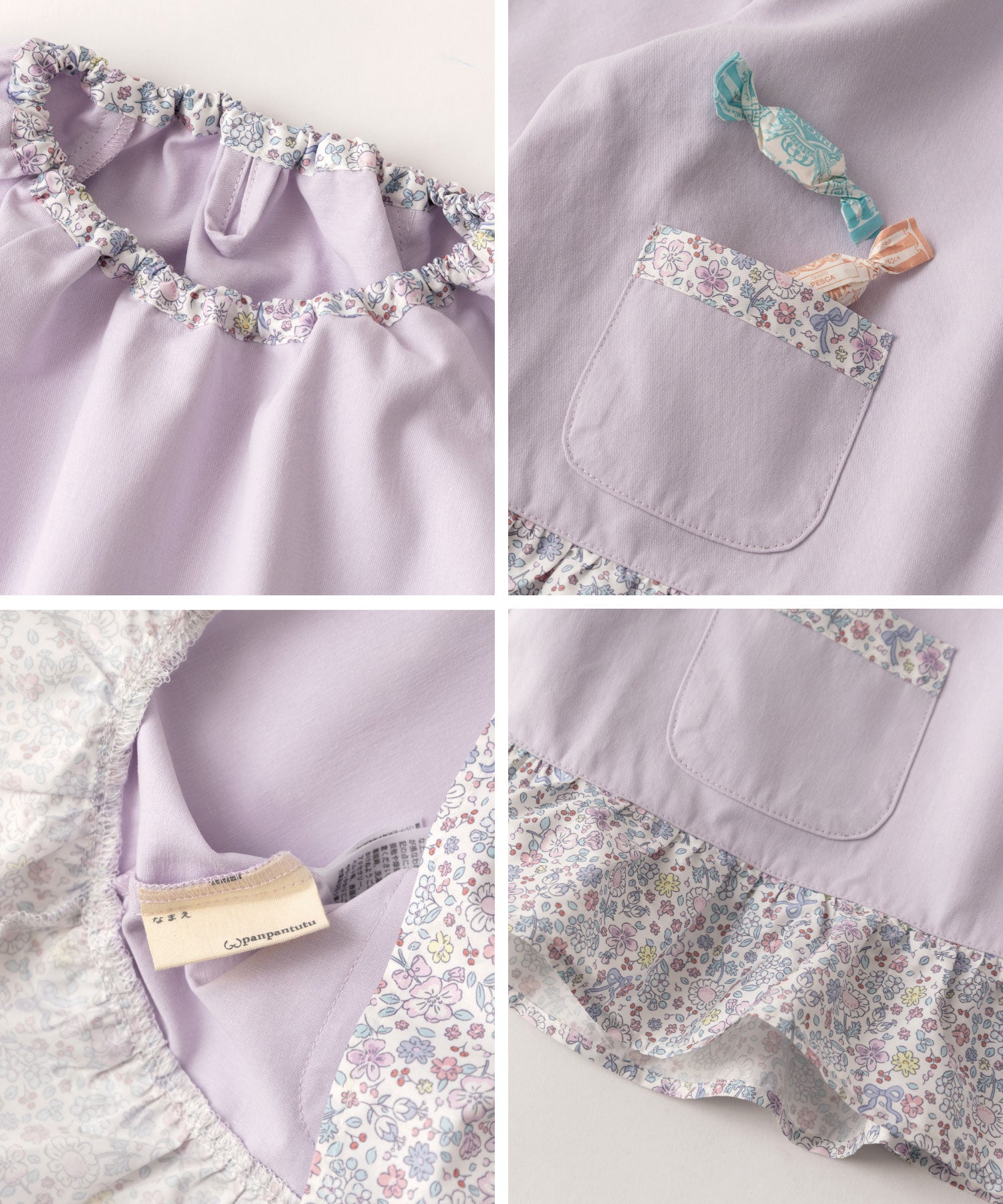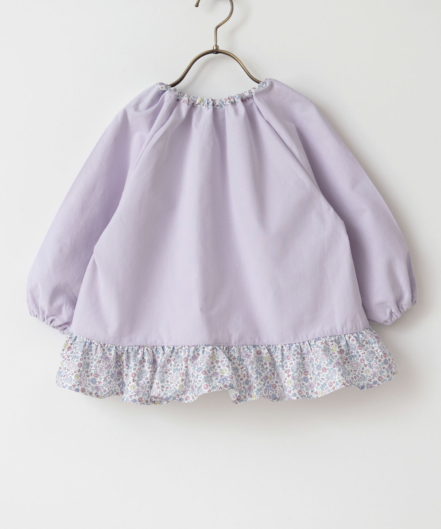 ラベンダーカラーに優雅なプティフルール柄を施した、女の子らしいスモック。