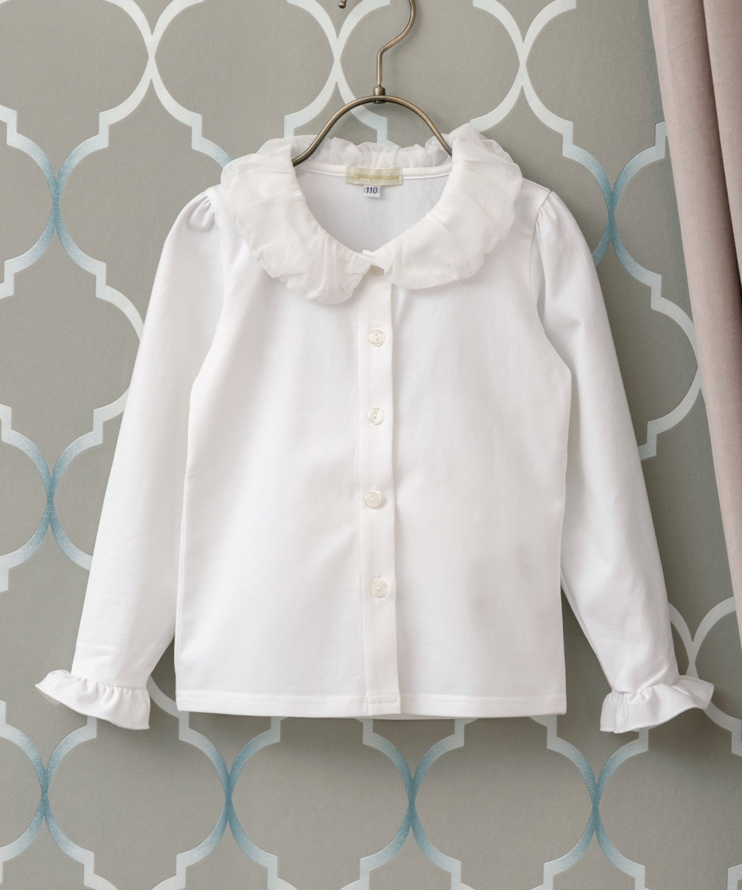 ふんわりな丸えりが顔まわりを優しい印象に。袖口のフリルをカーディガンなどの羽織りから見せてもとってもかわいい。セーターやトレーナーと合わせてちらっと見せるチュールをワンポイントにしても。