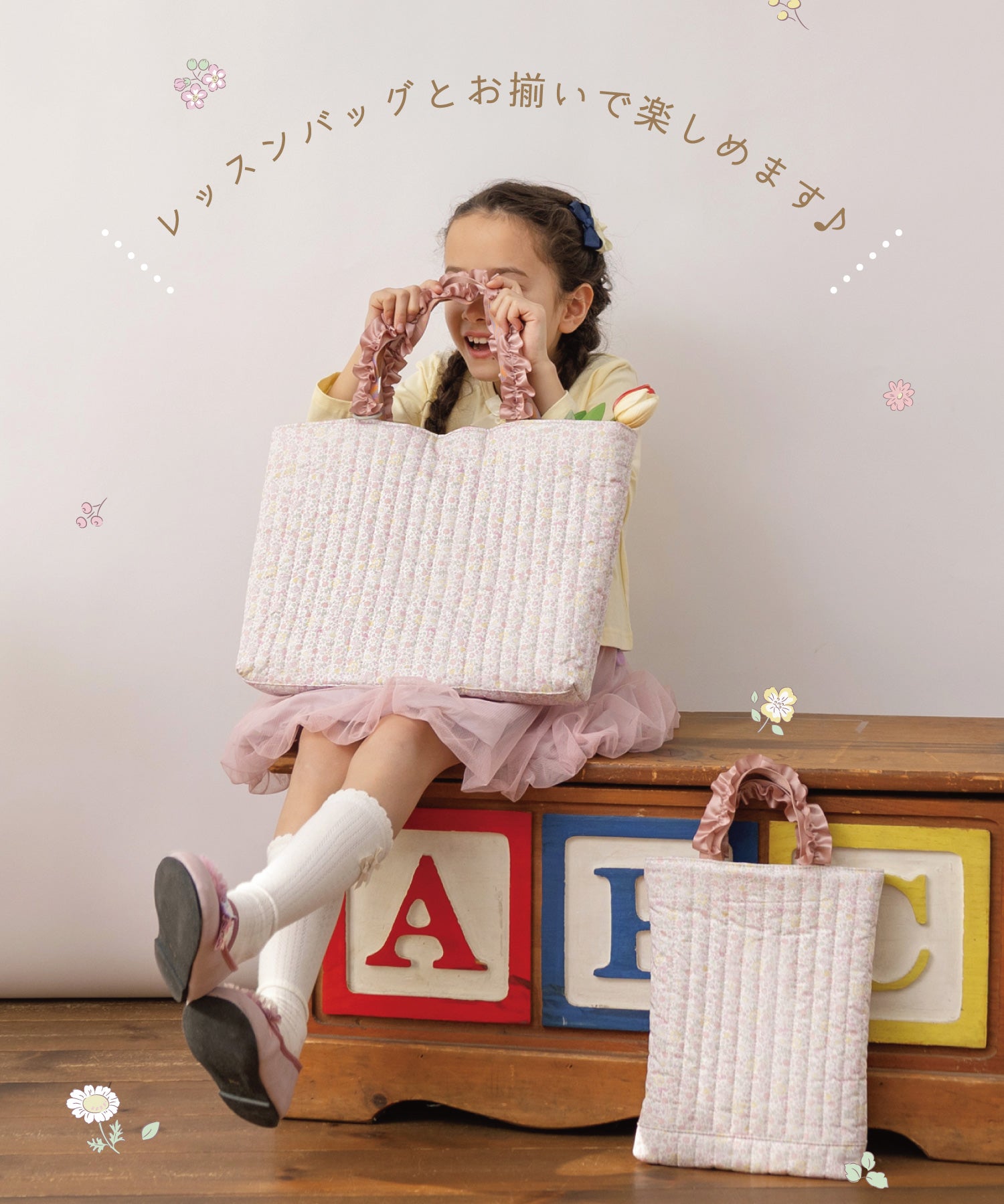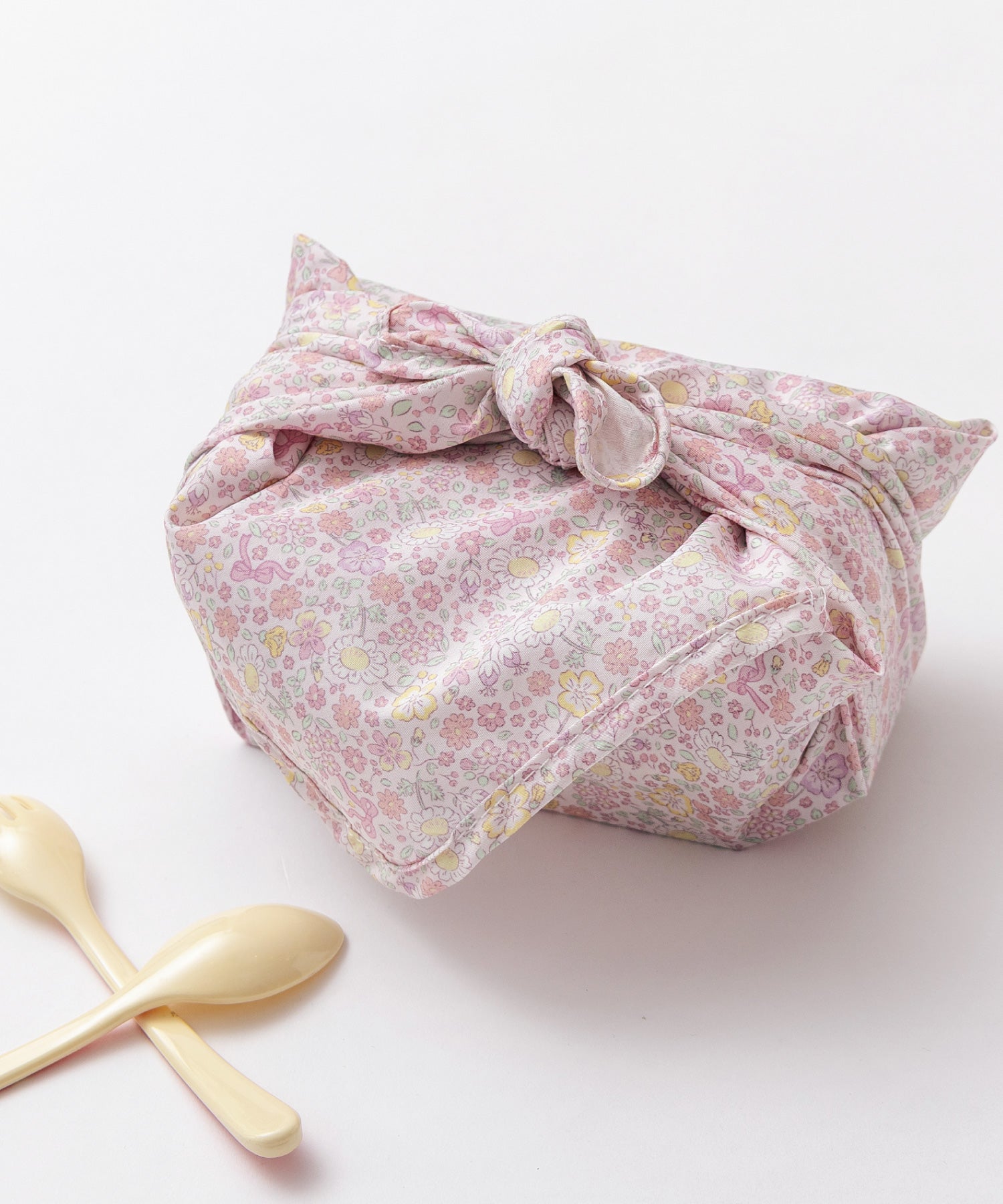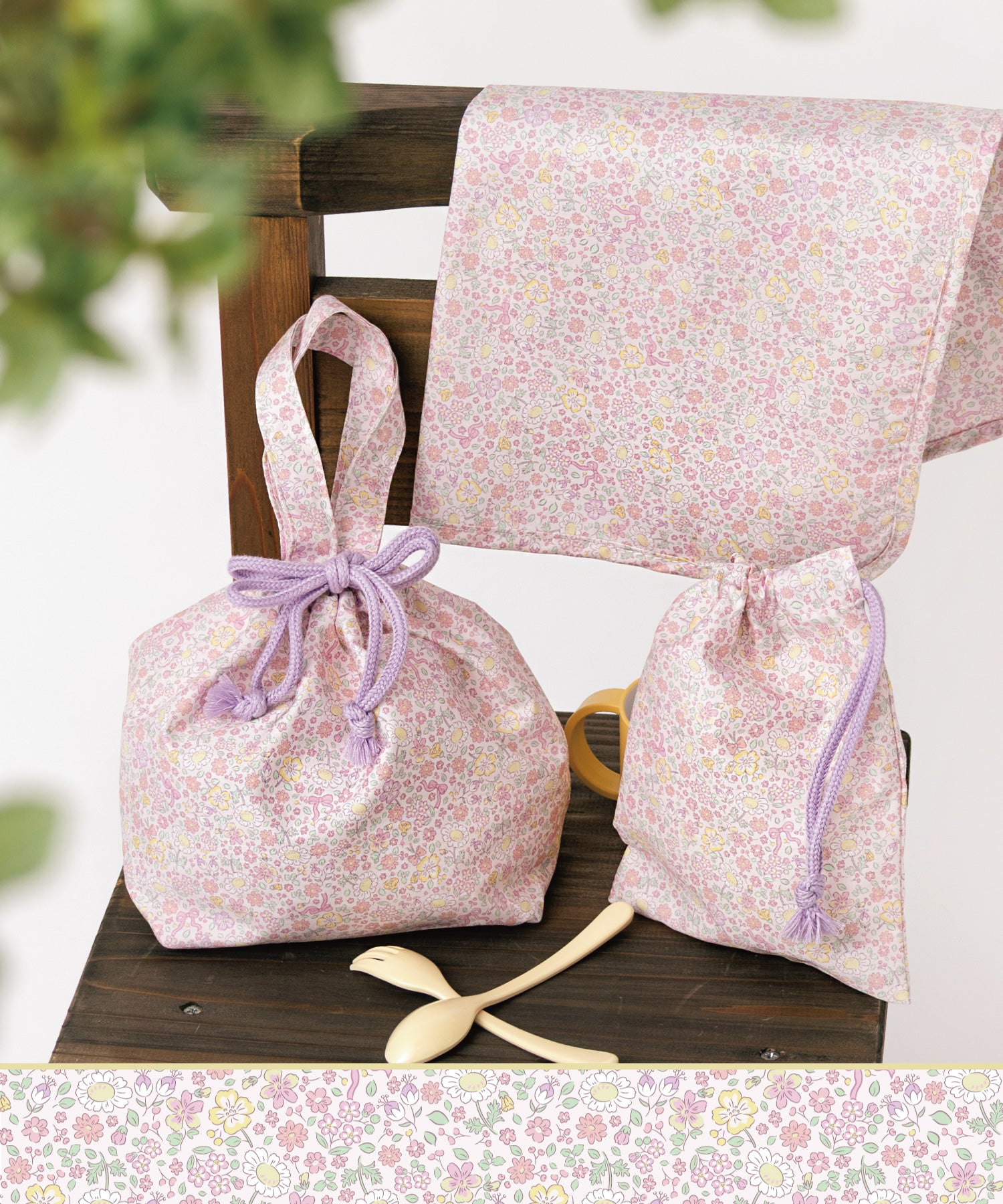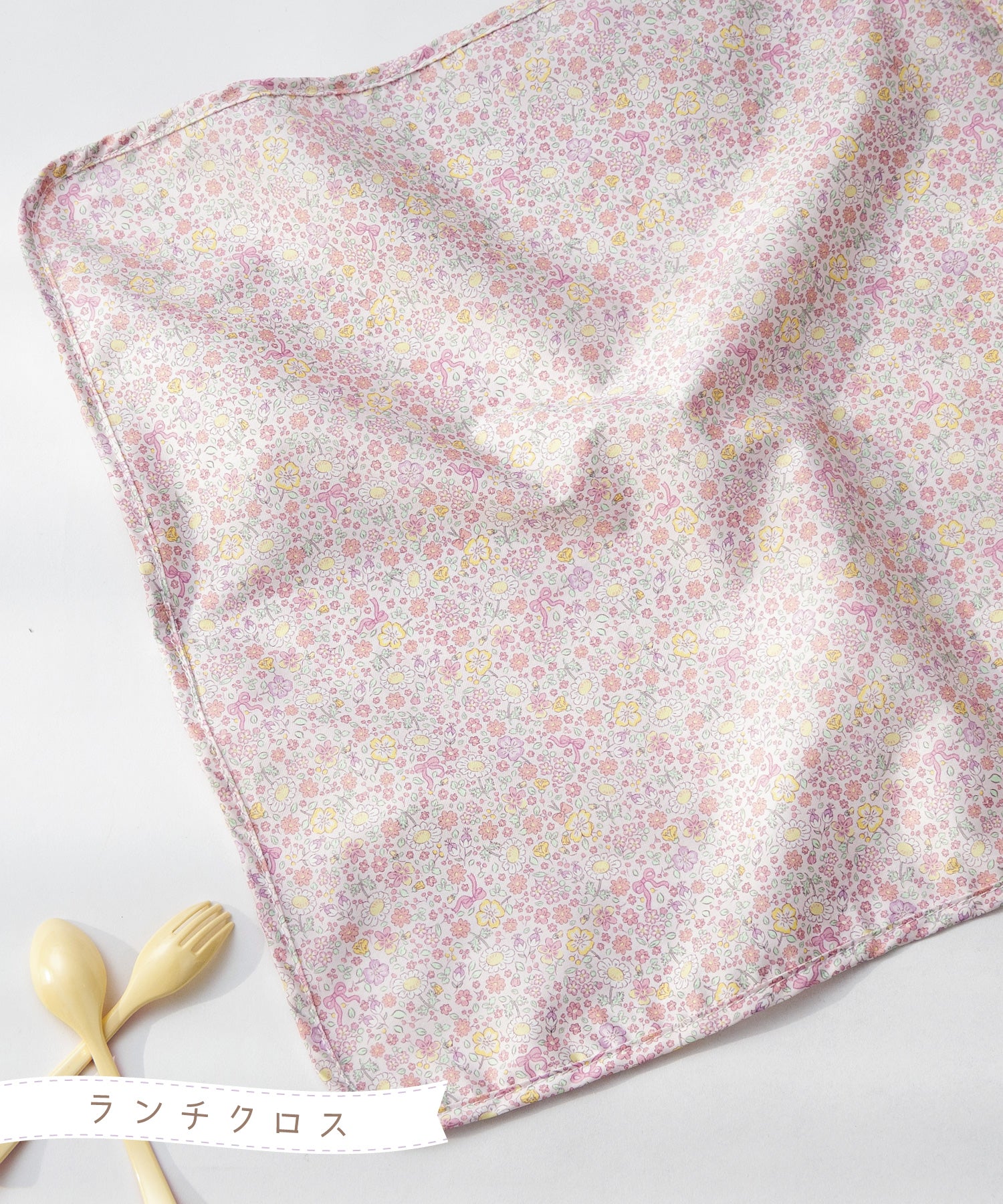 優しいピンク&クリームイエローの小さなお花が咲いたプティフルール柄。愛らしさと上品さのある定番の花柄のランチグッズ。